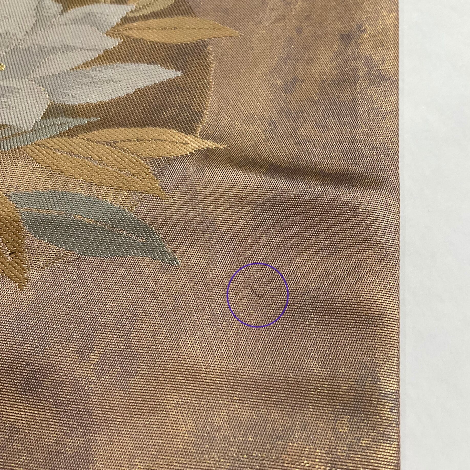 お太鼓部分(右側タレ先から約35cmあたり)に、目立ちにくいですが、細い織りムラ?汚れ?有り。