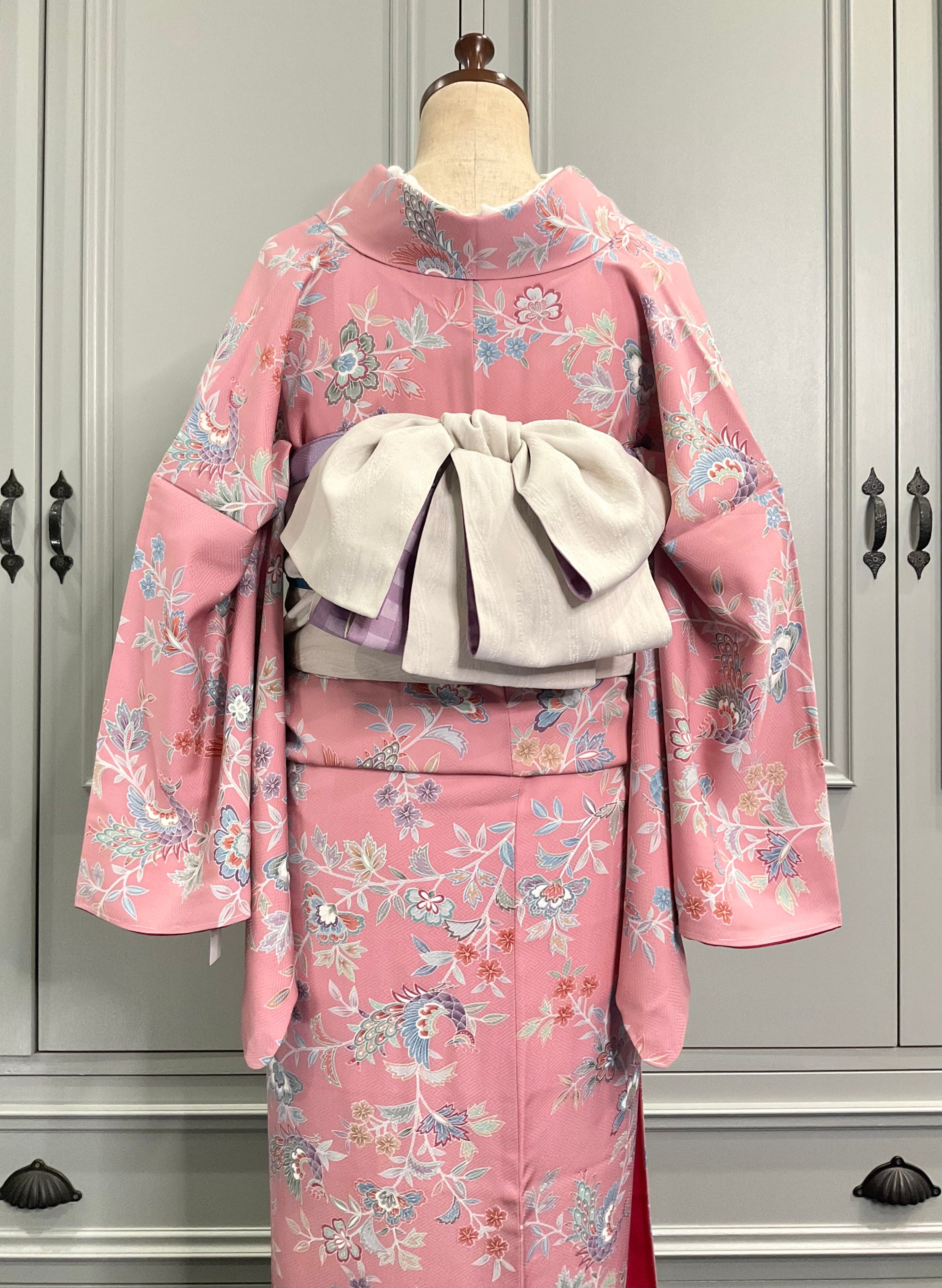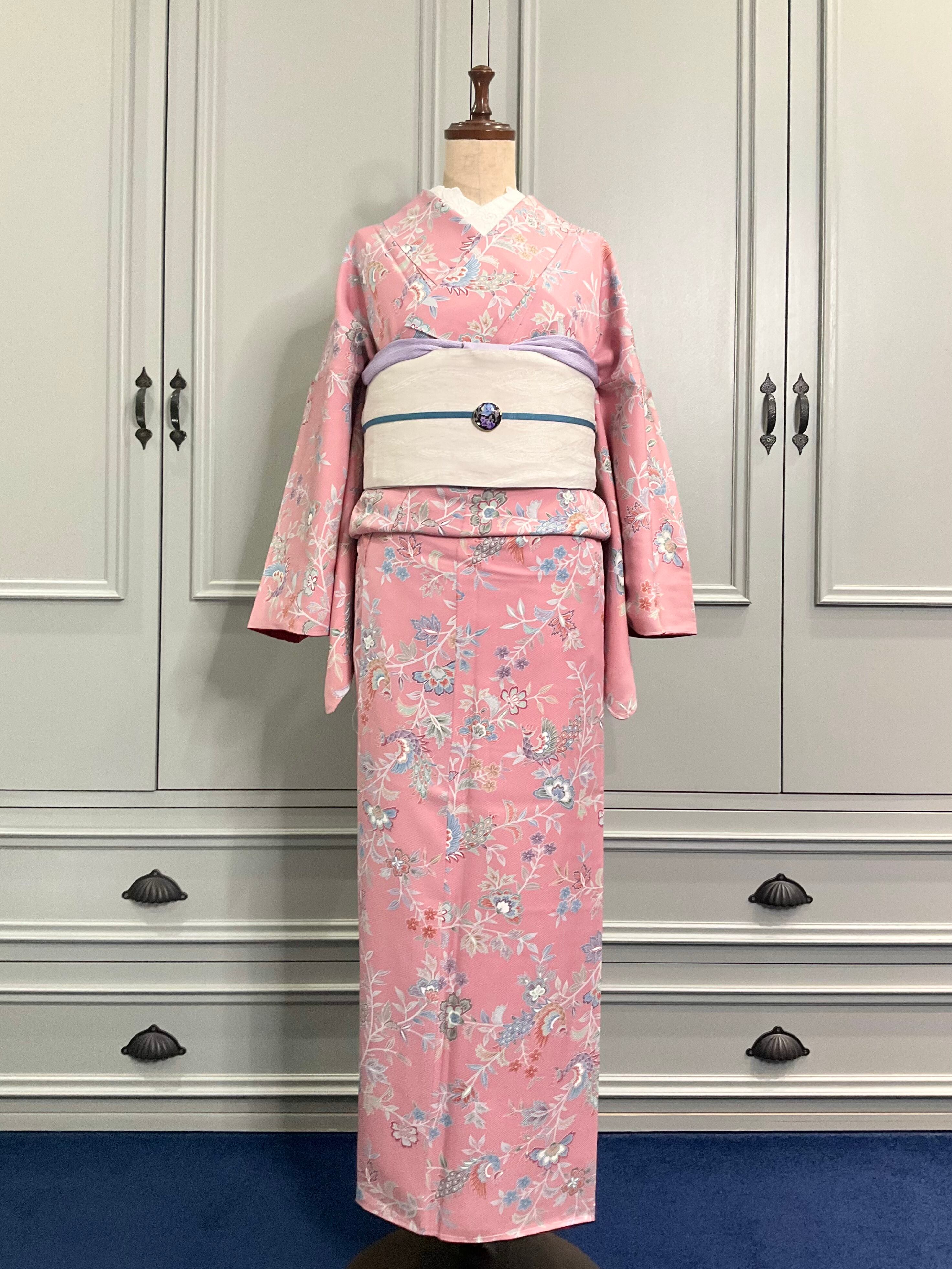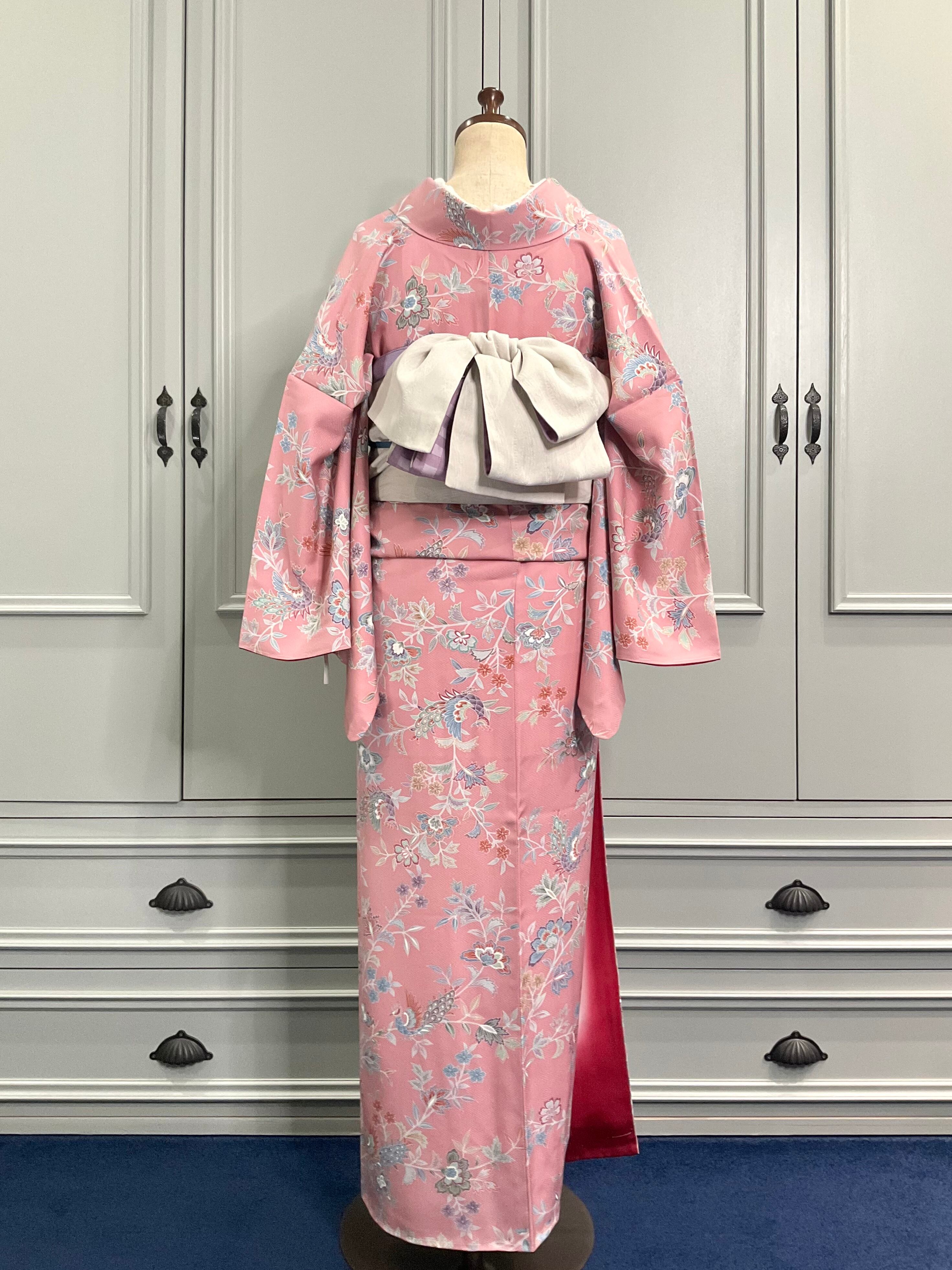 ピンクの地色に、花模様や鳥がデザインされた、小紋着物です♪