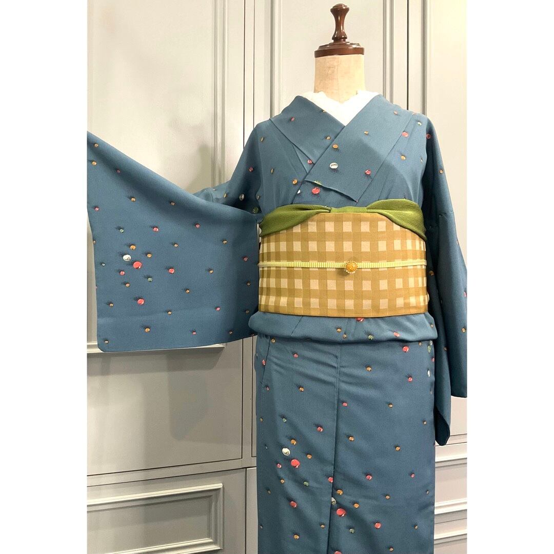 ブルーグレー系の地色に、ドット模様がデザインされた、小紋着物です♪