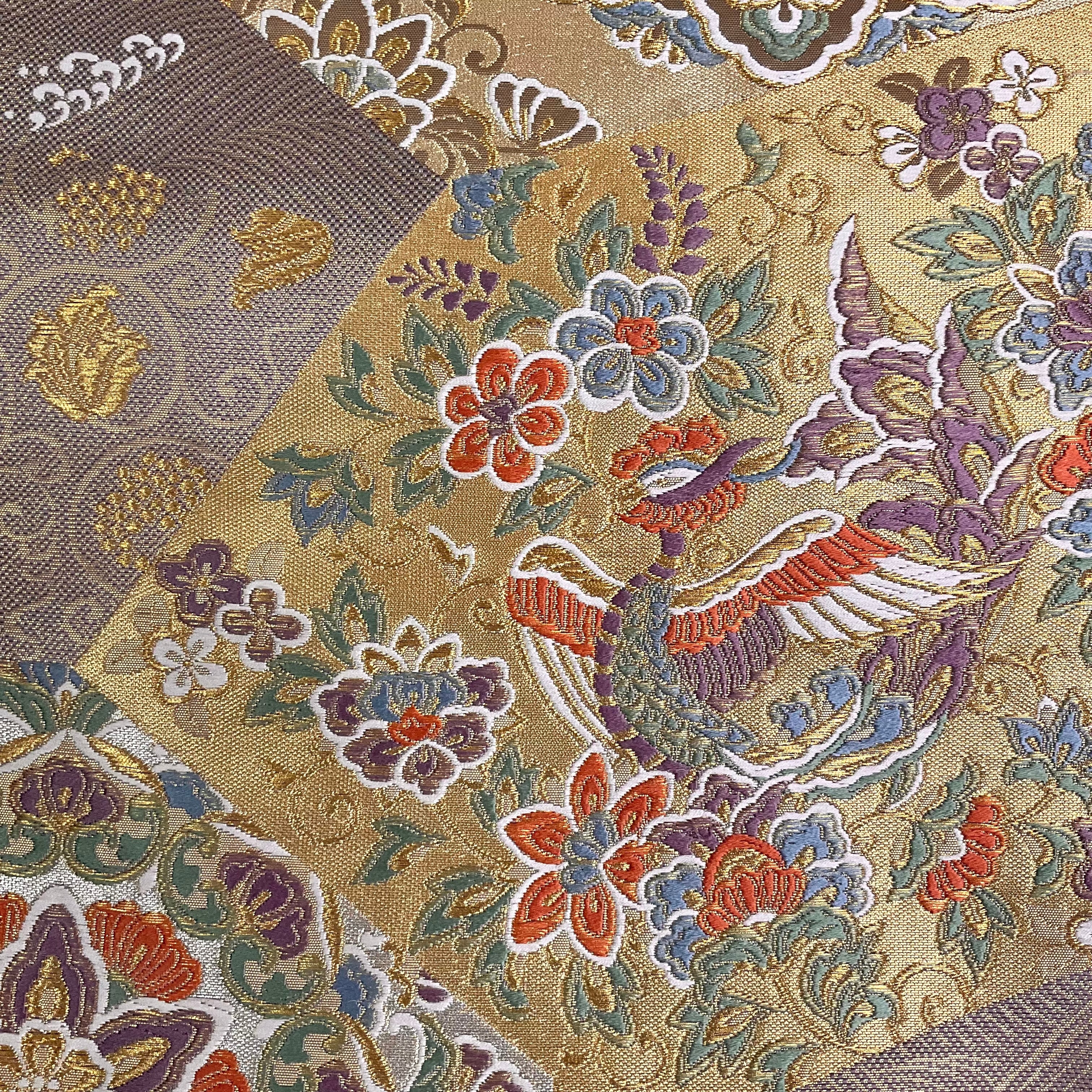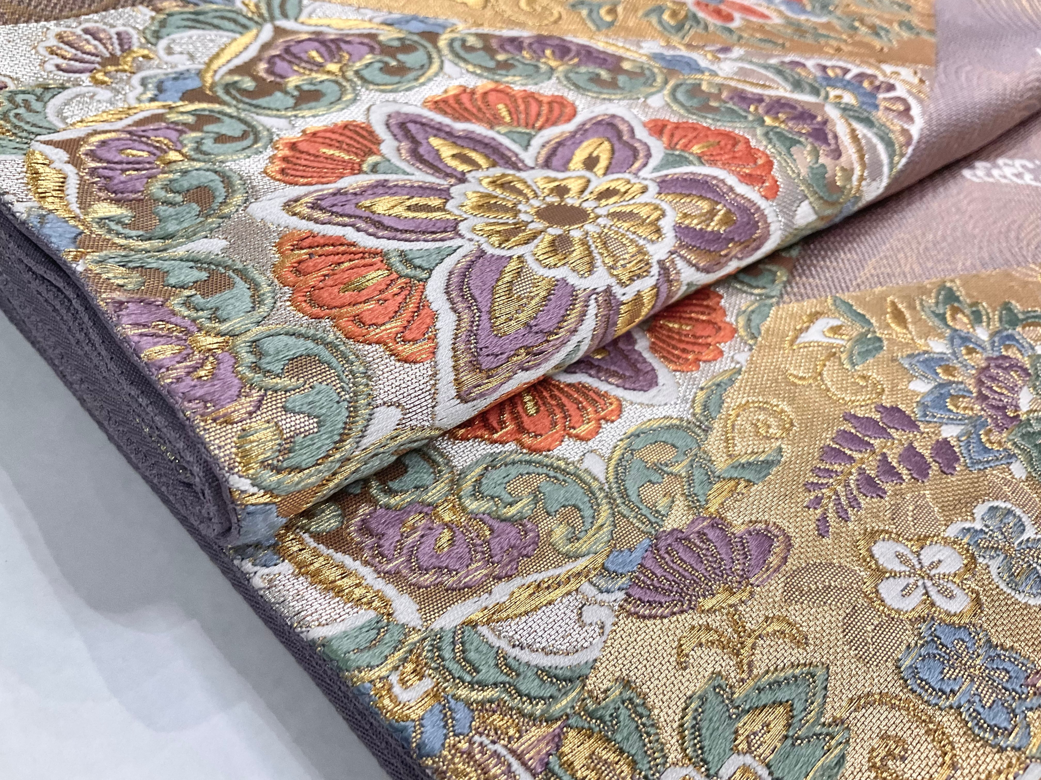 ゴールド×シルバー×アッシュ系などの地色に、鳥や花模様がデザインされた、袋帯です♪