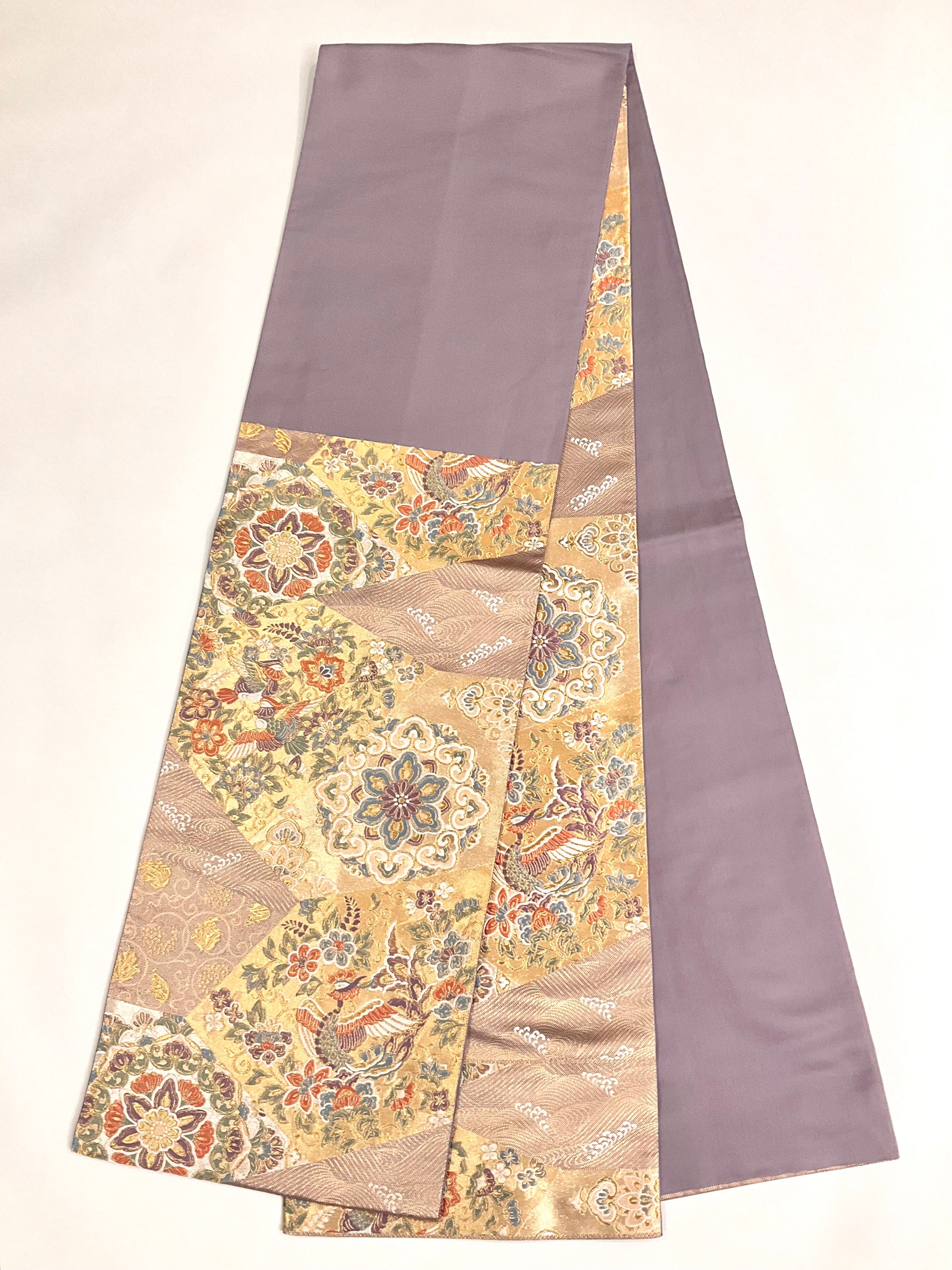 アッシュパープル×鳳凰とおしどり*リサイクル袋帯 A130