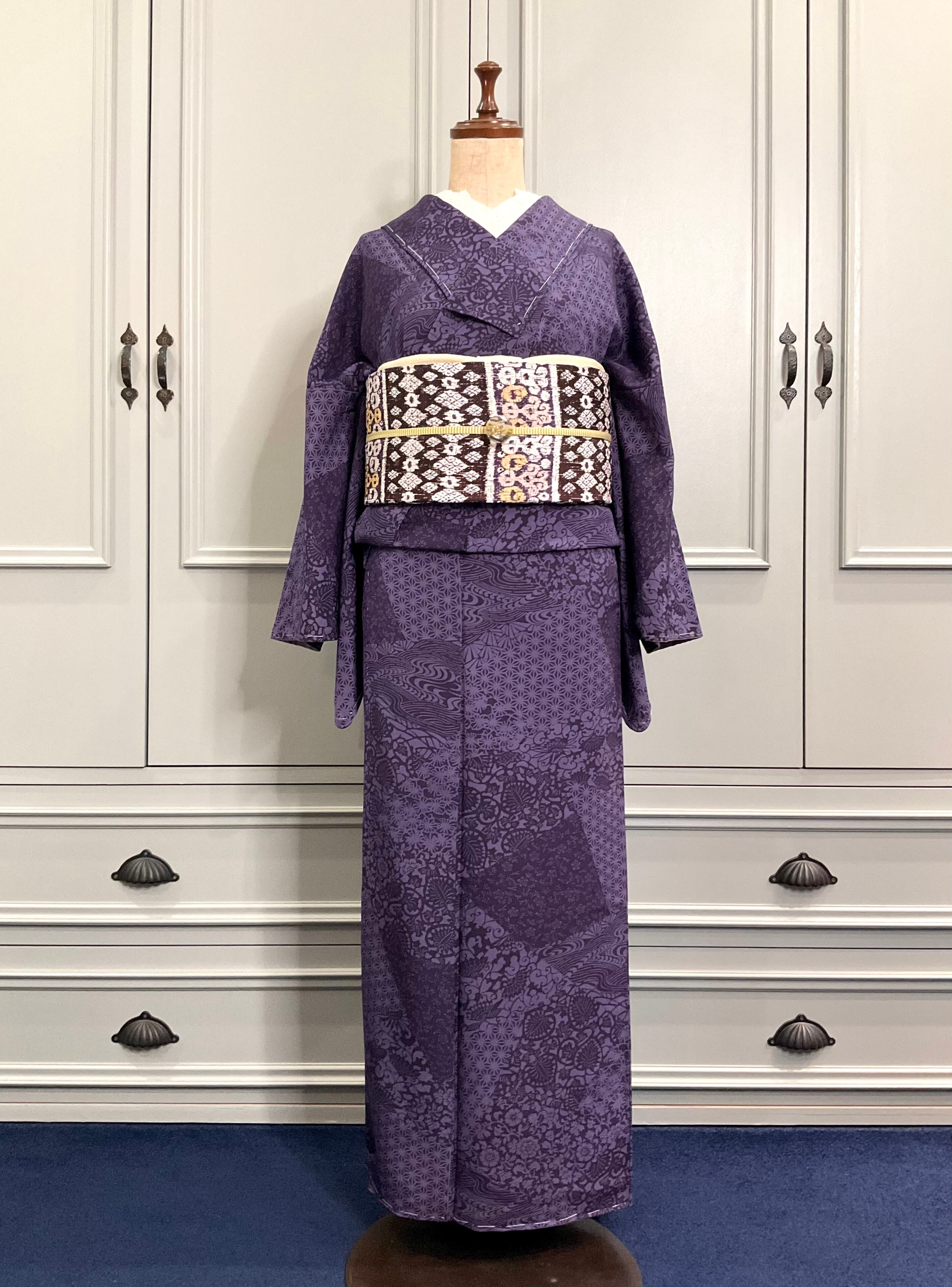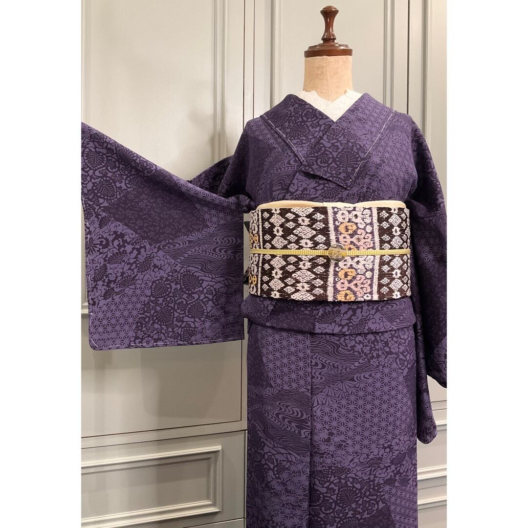 パープル系の地色に、様々な柄が組み合わさったデザインが素敵な、小紋着物です♪
