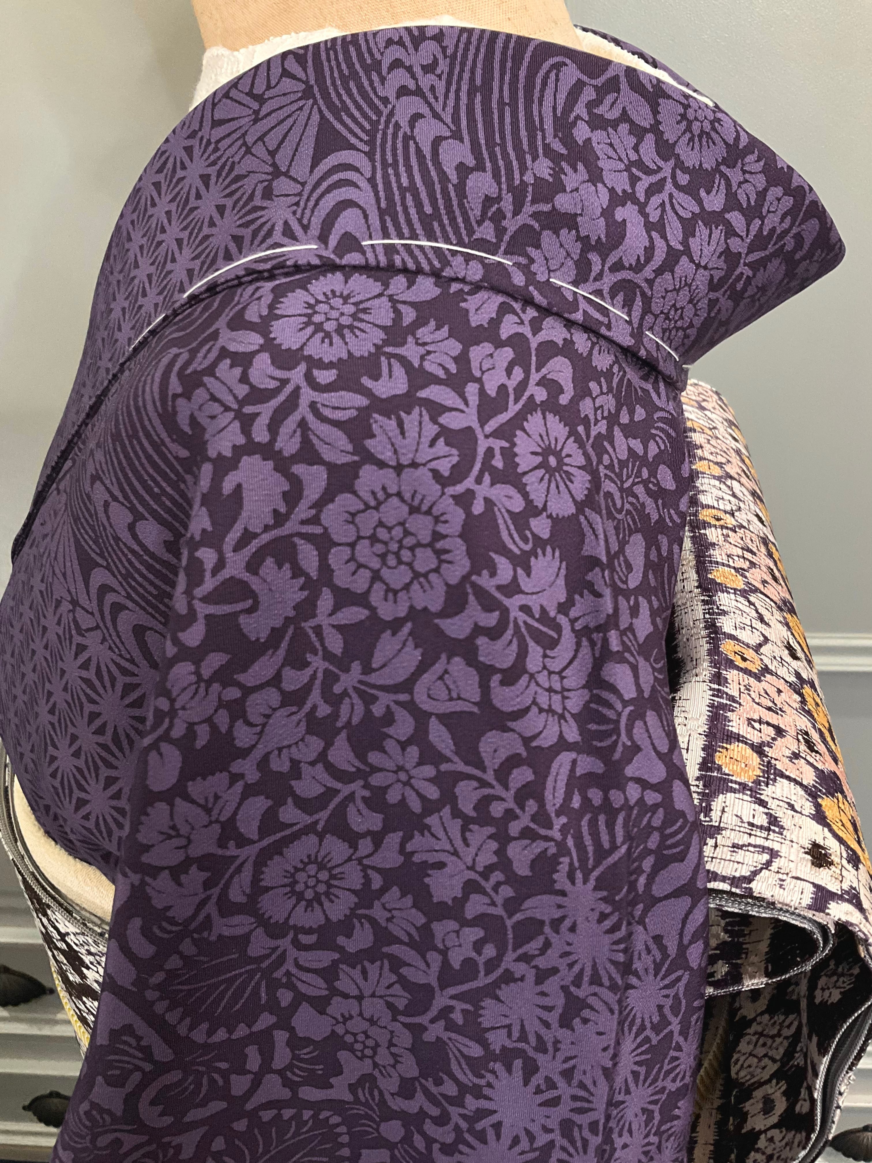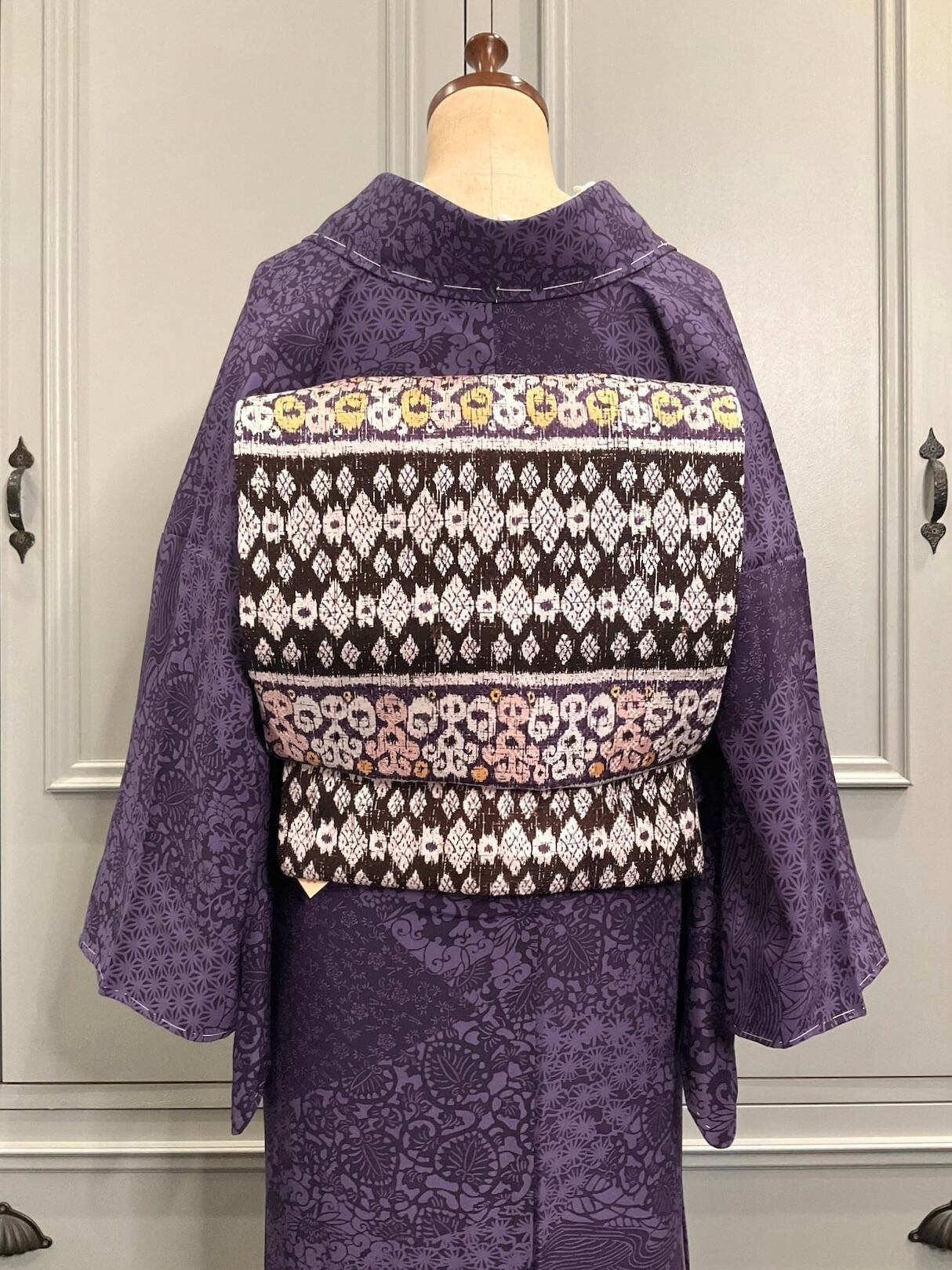 柄同士は、細かなデザインがギュッと詰まっており華やかですが、全体のお色味はパープル系のワントーンでまとまっている為、帯に柄物や複数のお色が入ったデザインのものを合わせてもまとまりやすく、幅広いコーディネートが楽しめそうです♪
