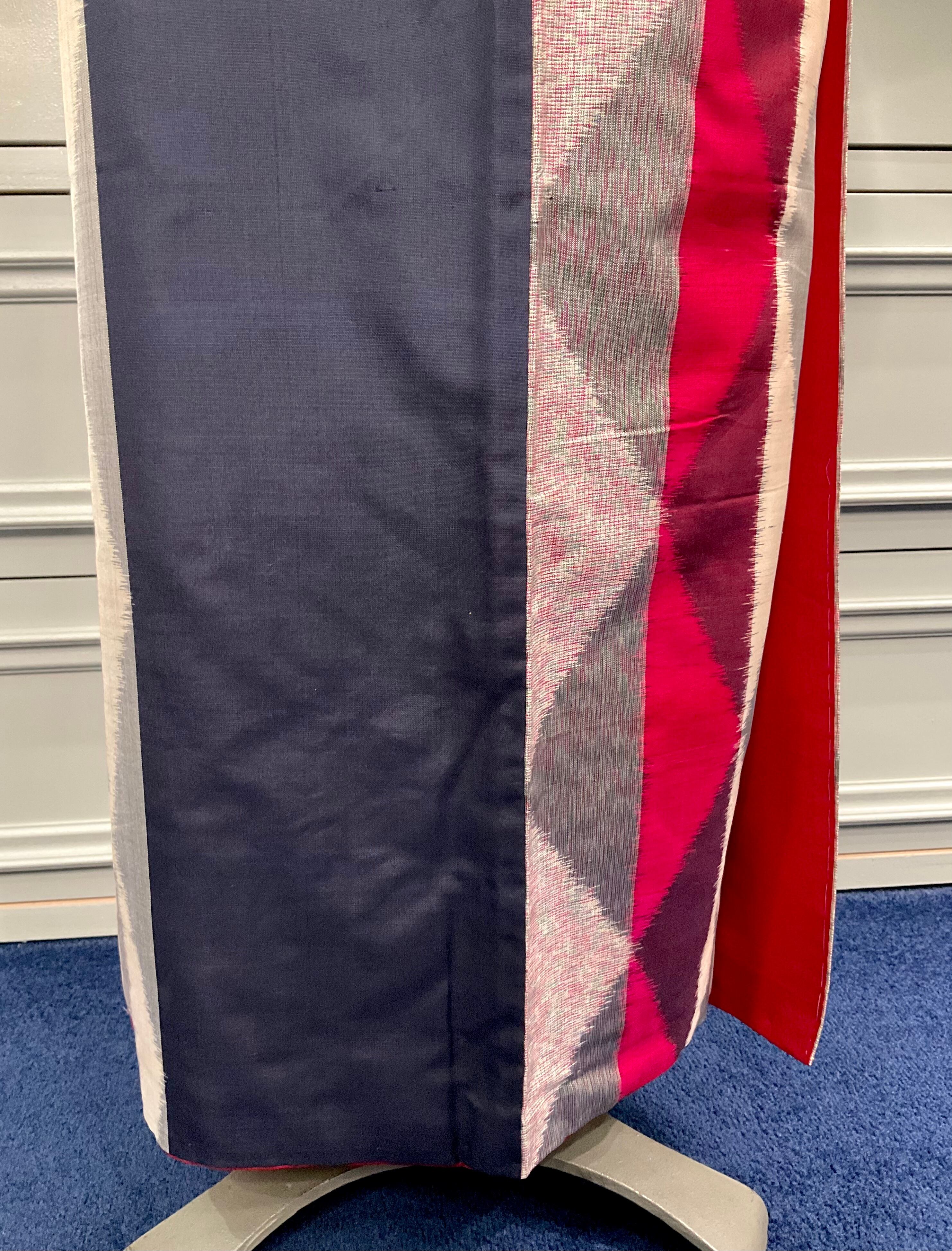 ネイビー×レッド×アイボリーの、銘仙ならではのモダンな幾何学模様が魅力的ですね✨