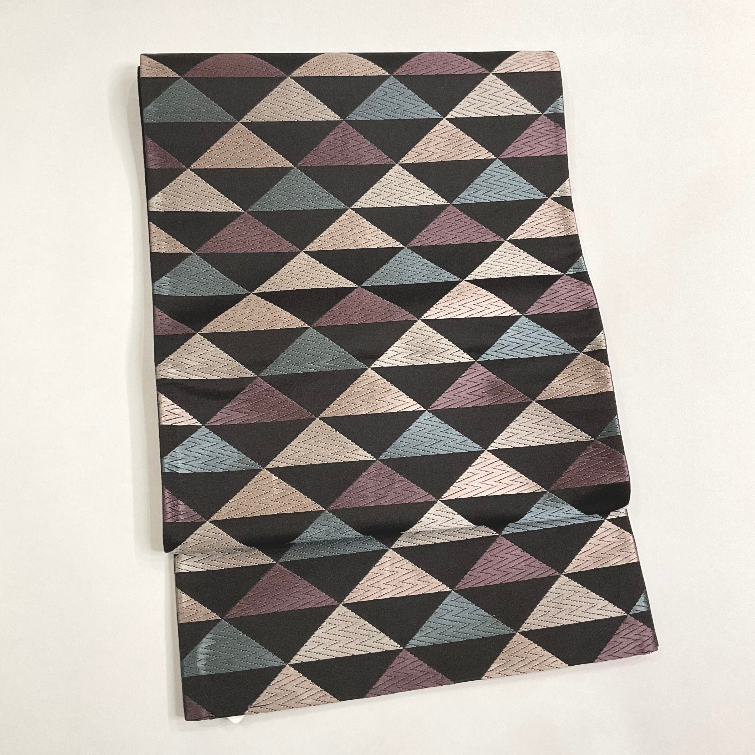 ブラックを中心に、ブラウン系、グレージュ系、ブルーグレー系のお色でデザインされた鱗文様の名古屋帯です♪