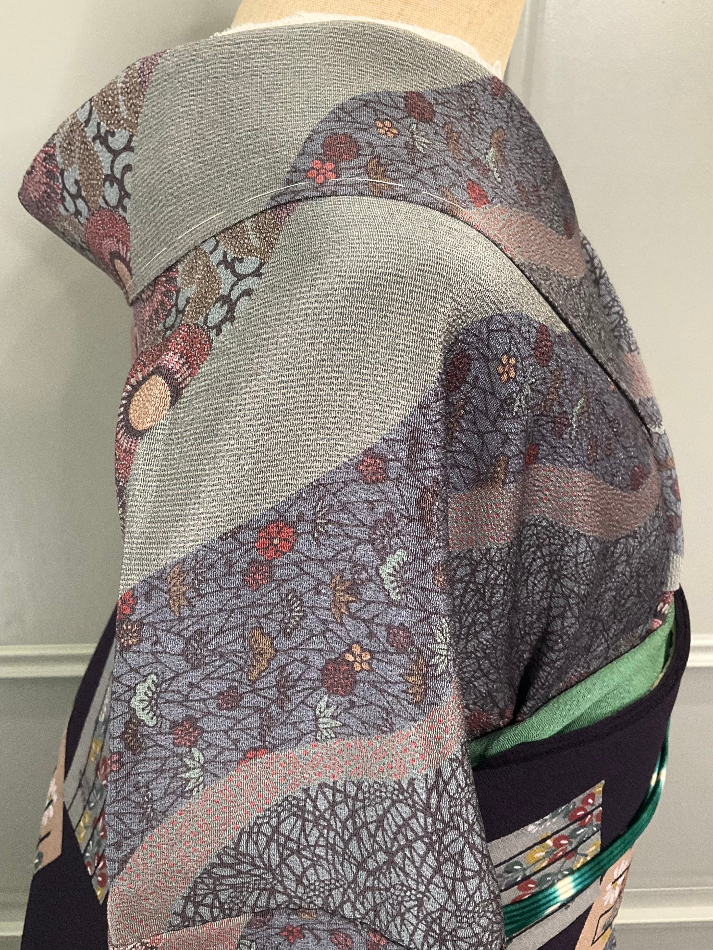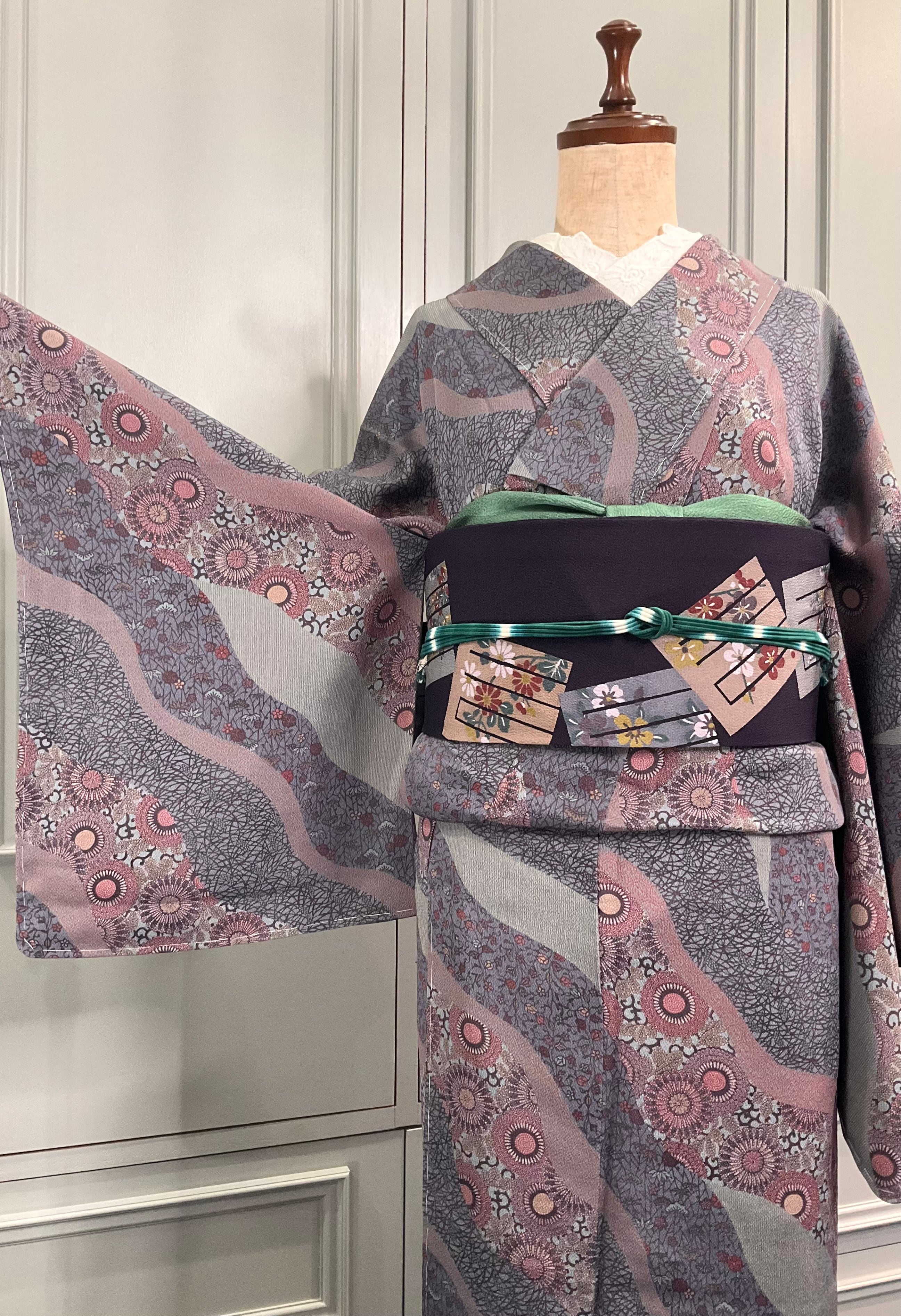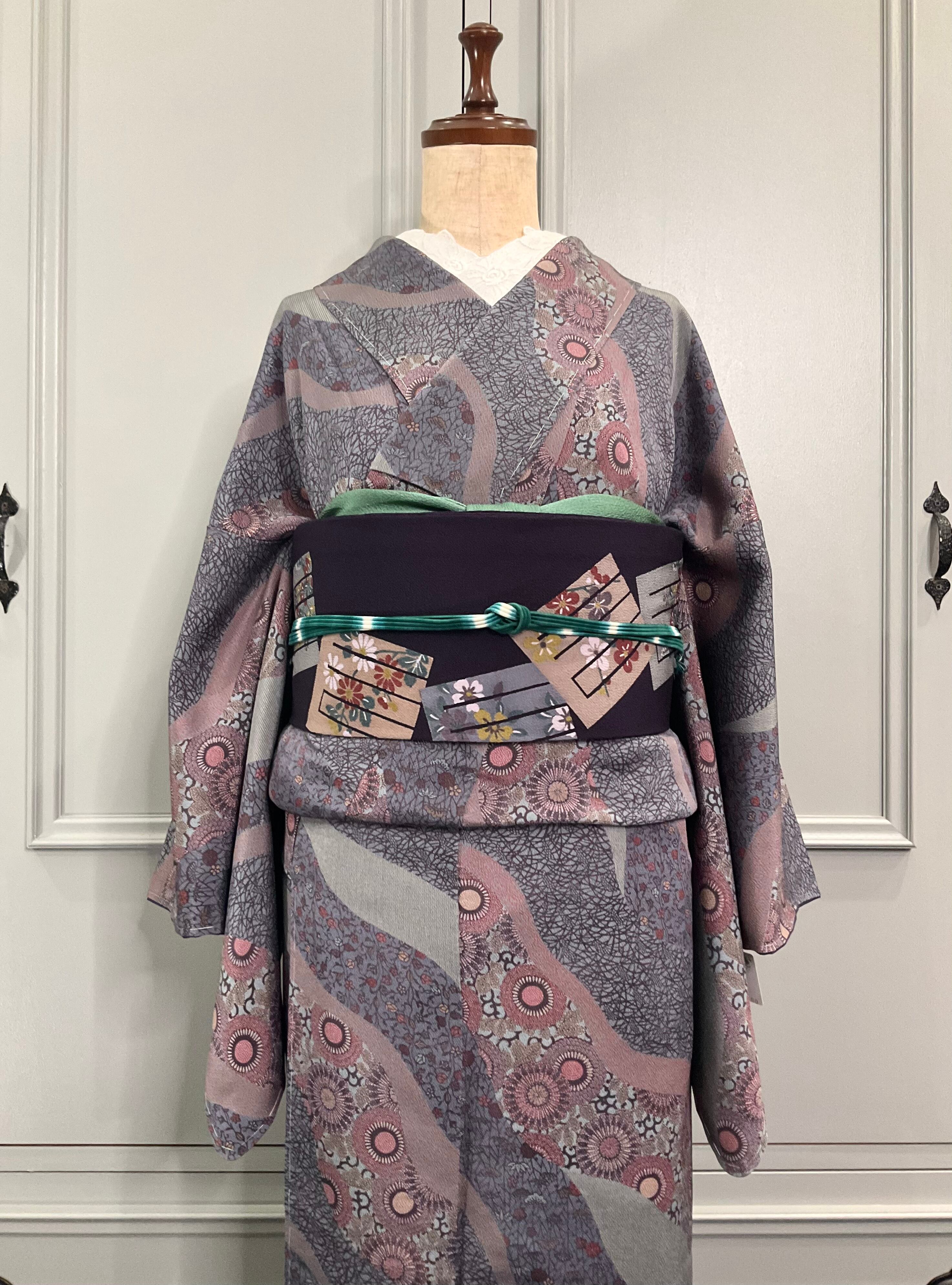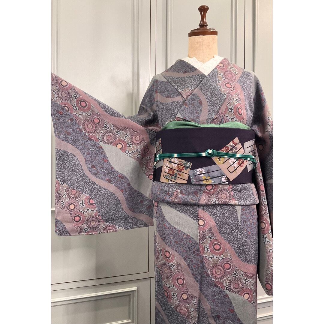 全体的にくすみカラーで花や植物系がデザインされた、小紋着物です♪