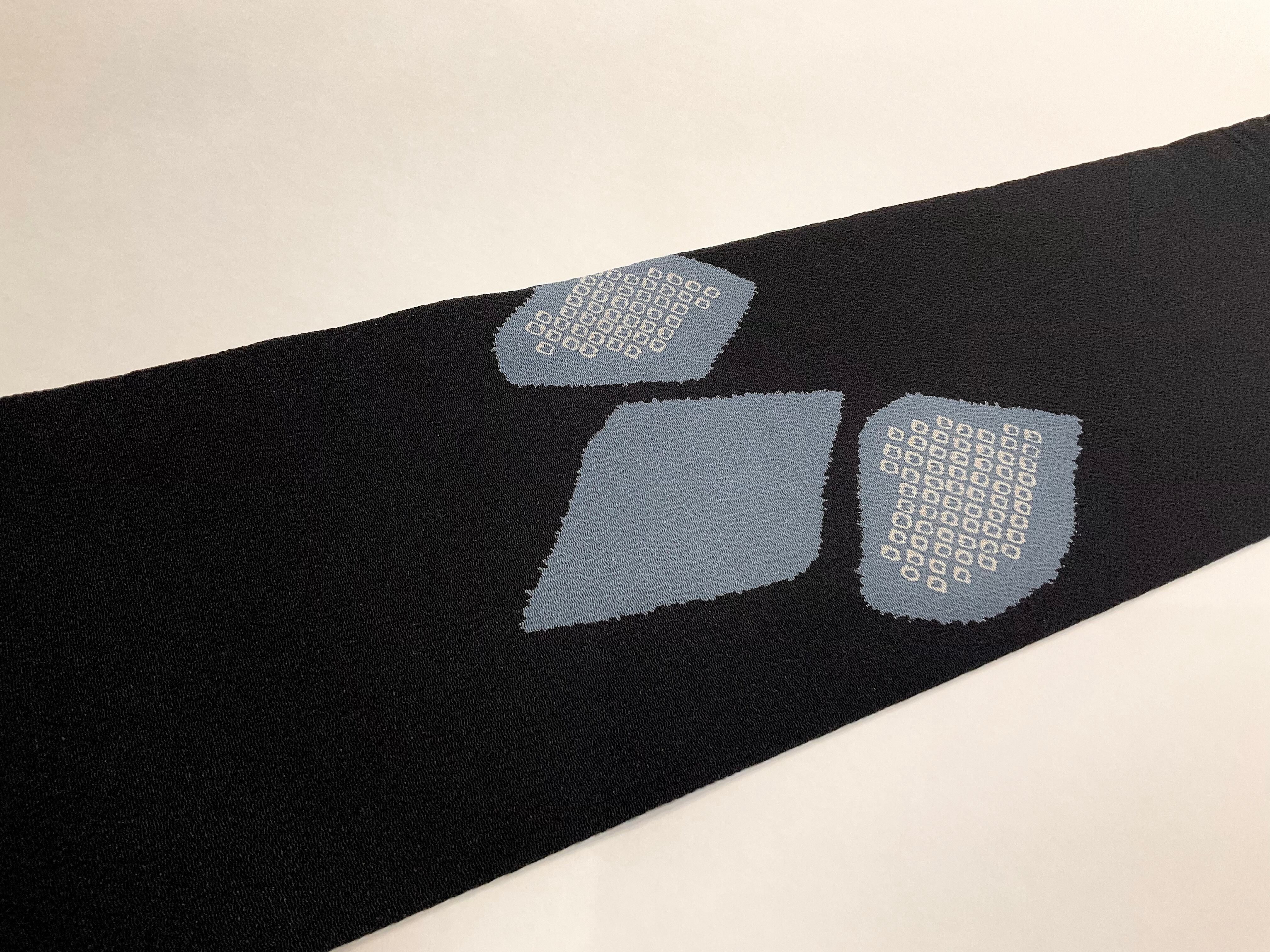ブラックの地色に、ブルーグレー系でデザインされた模様の名古屋帯です♪