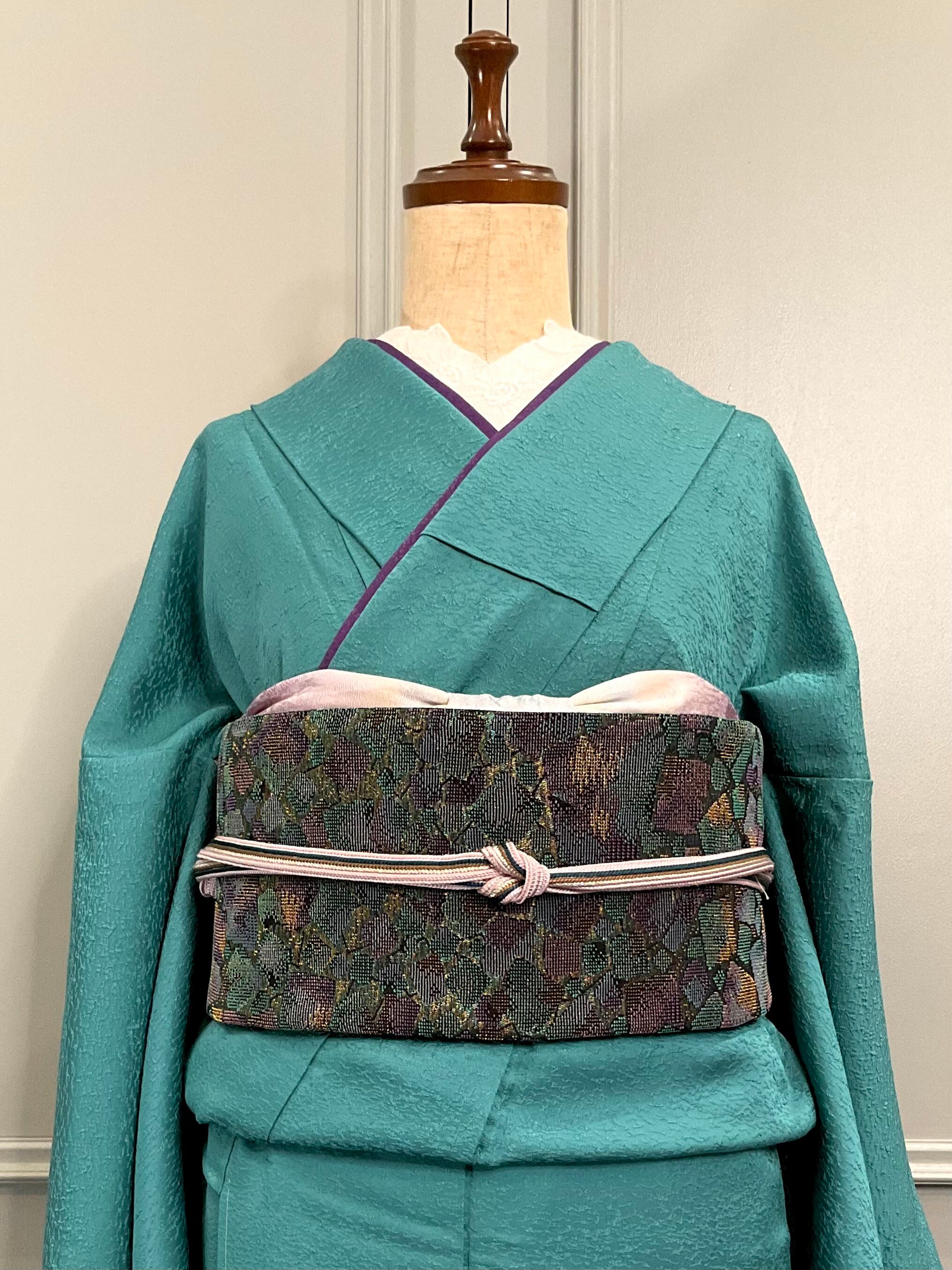 パープル系、グリーン系、そしてゴールドなどが、抽象的なデザインで織られた袋帯です♪