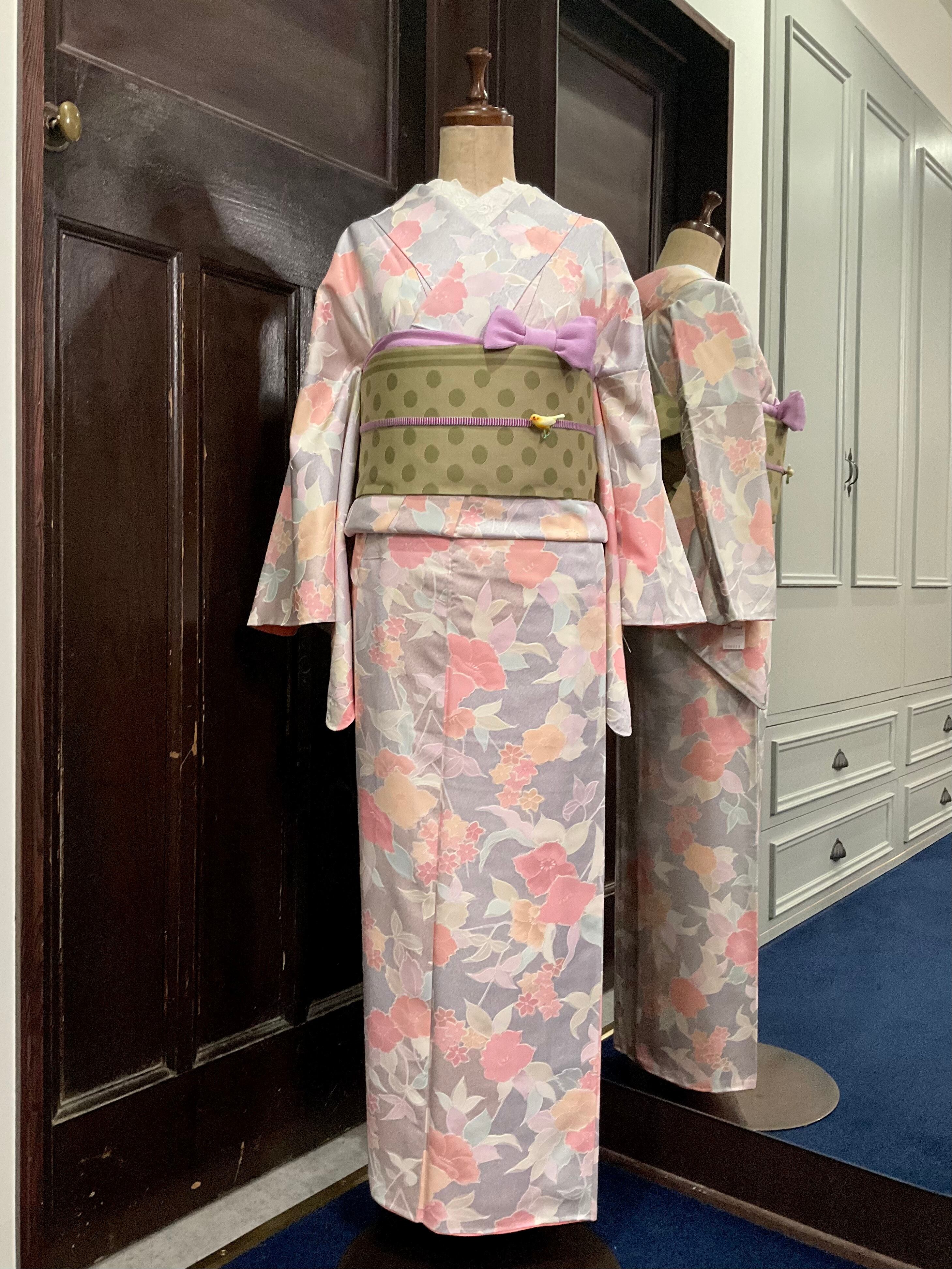 グレー系からパープル系のようなお色で、蒔糊散らしのような、ホワイトと合わさった地色に、パステルカラーのお花たちが、あたたかく、やわらかな空気感をまとった1着です^^