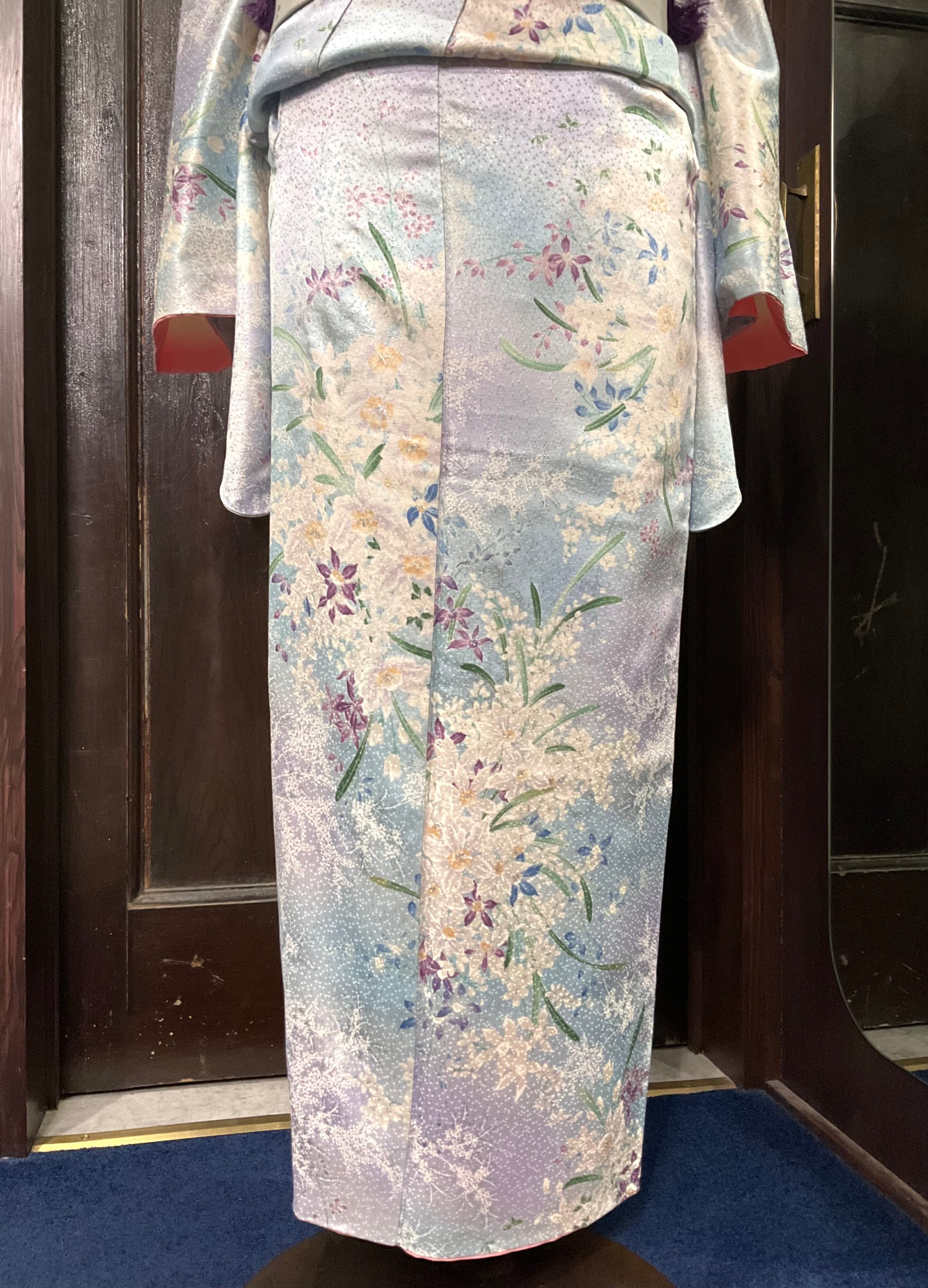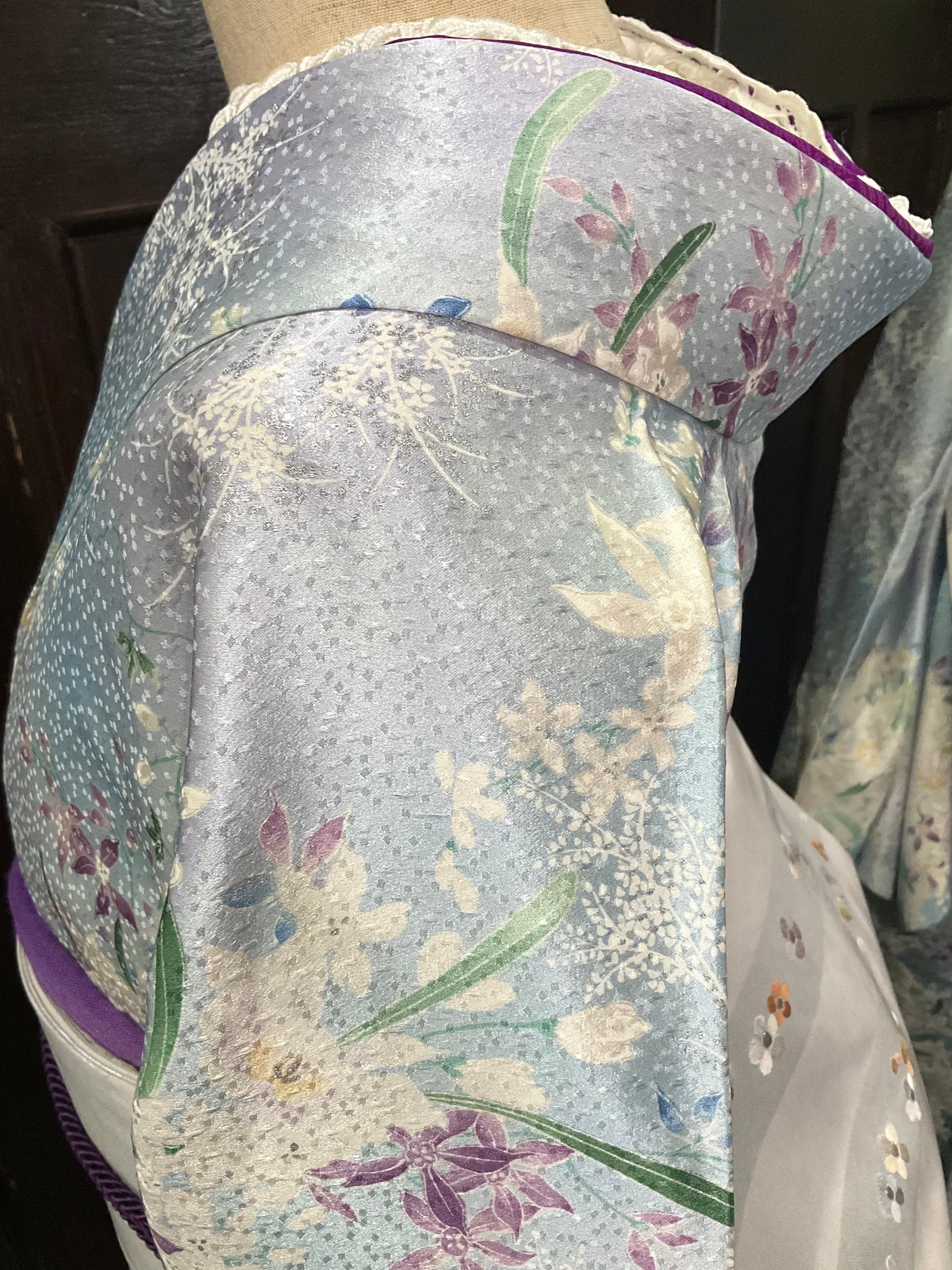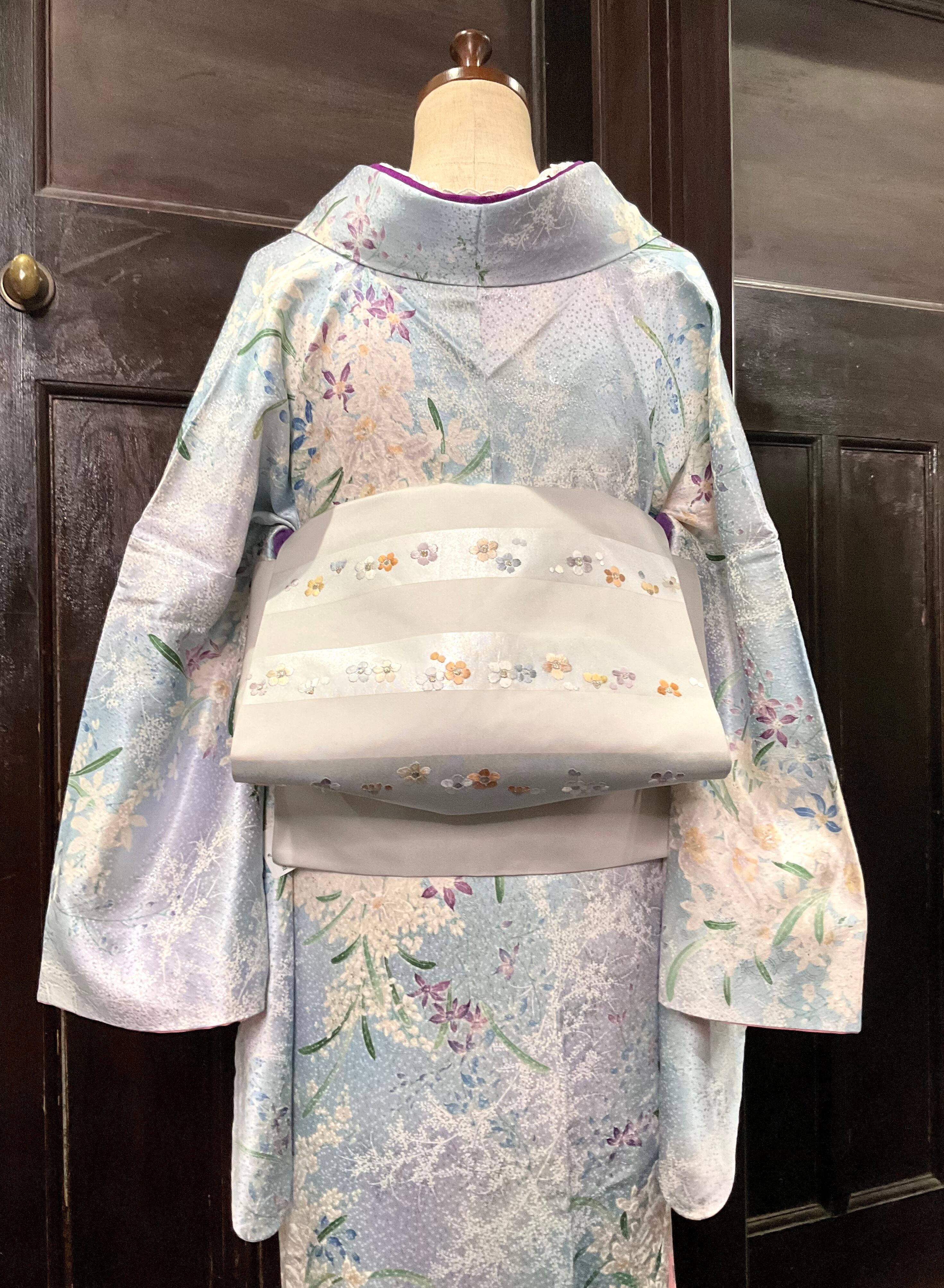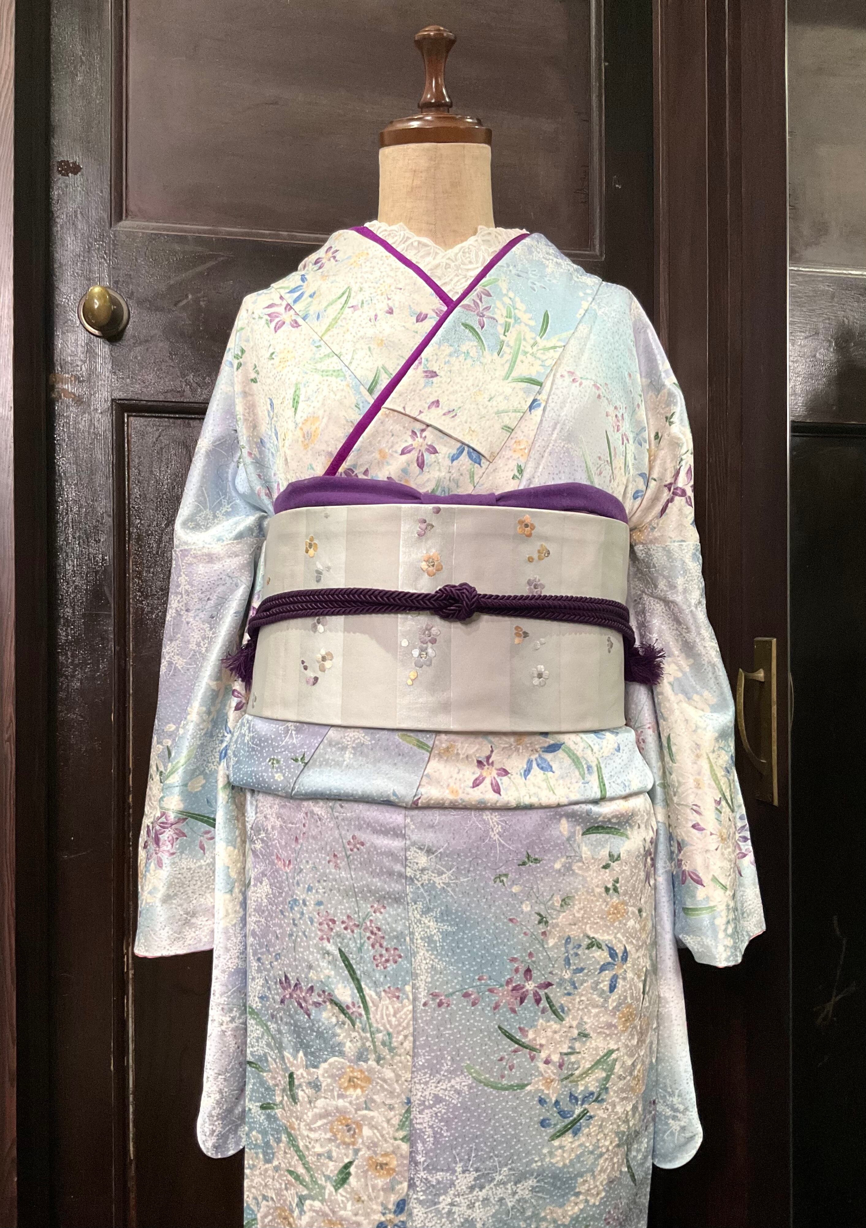 ライトブルー×ライトパープル系の地色に、花模様がデザインされた、小紋着物です♪