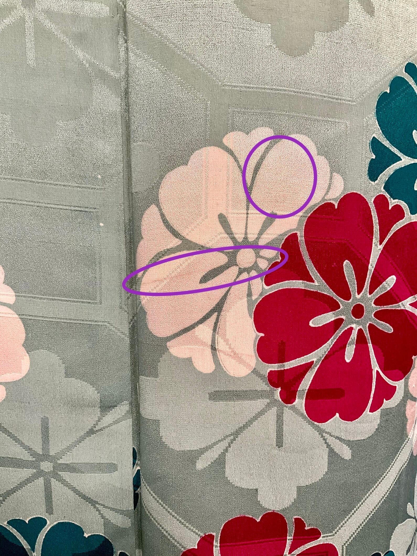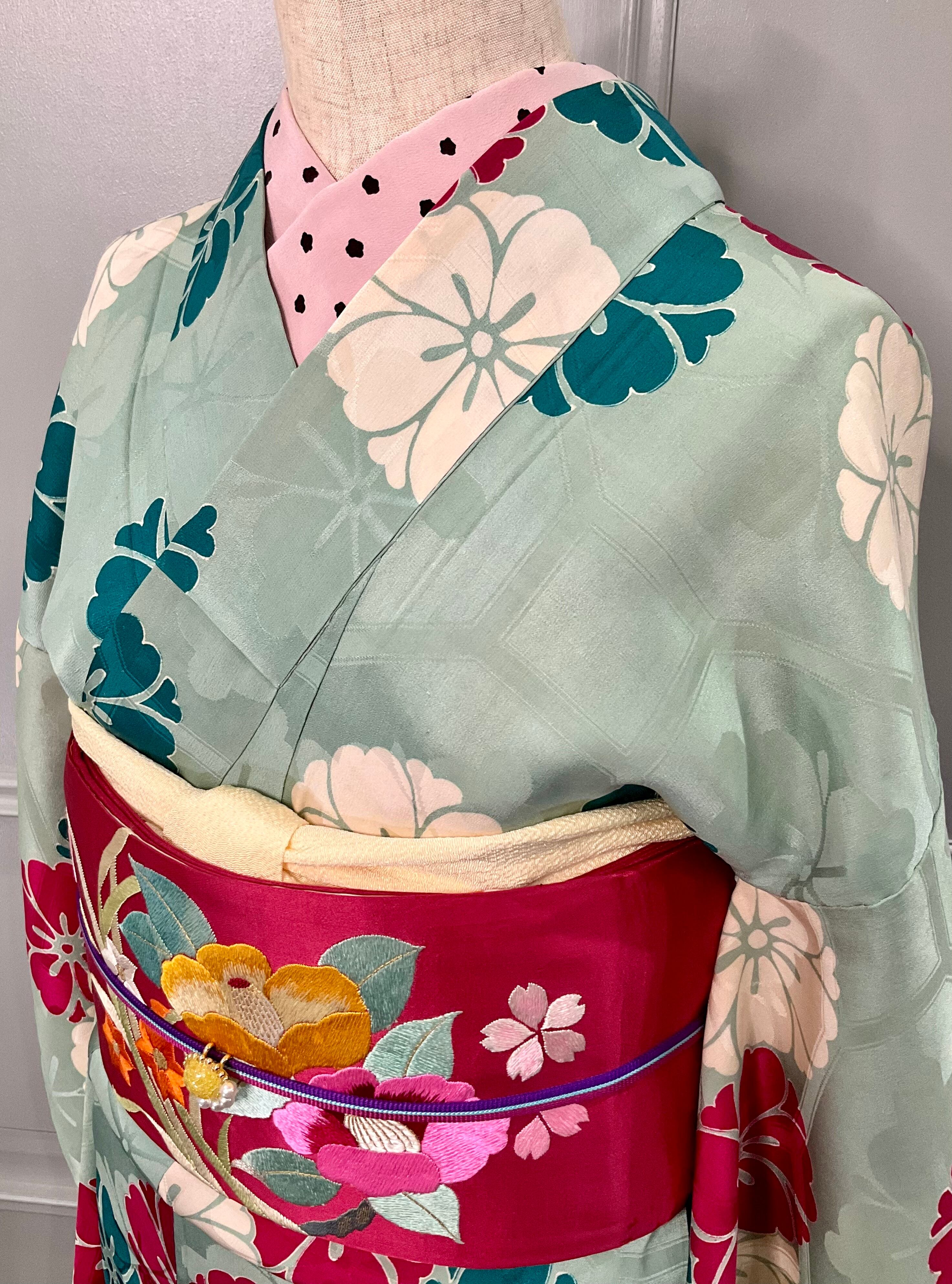 地色はくすみグリーン系の落ち着いたニュアンスカラーですが、八重桜のような桜文がビビットな色遣いで、目を惹きます!