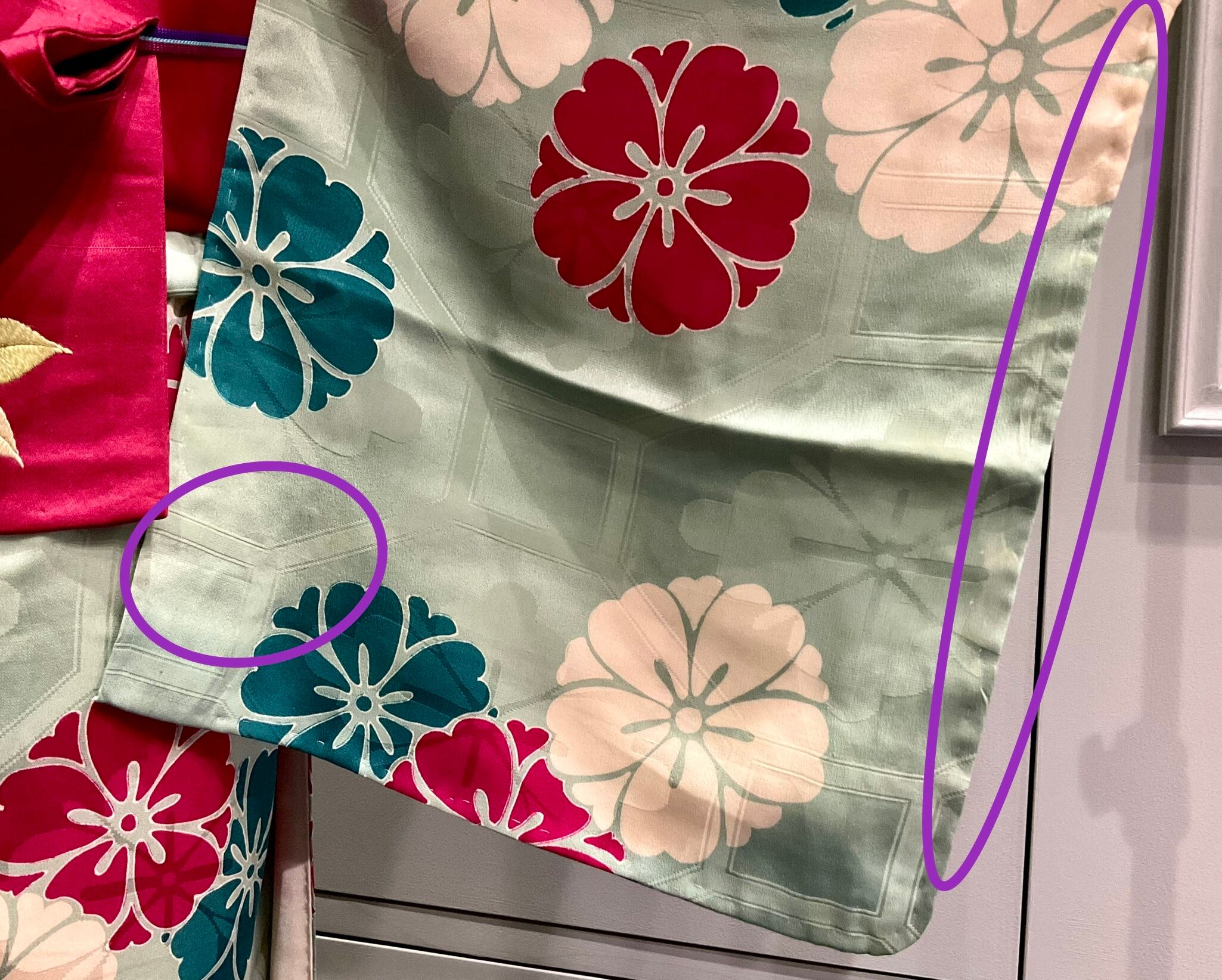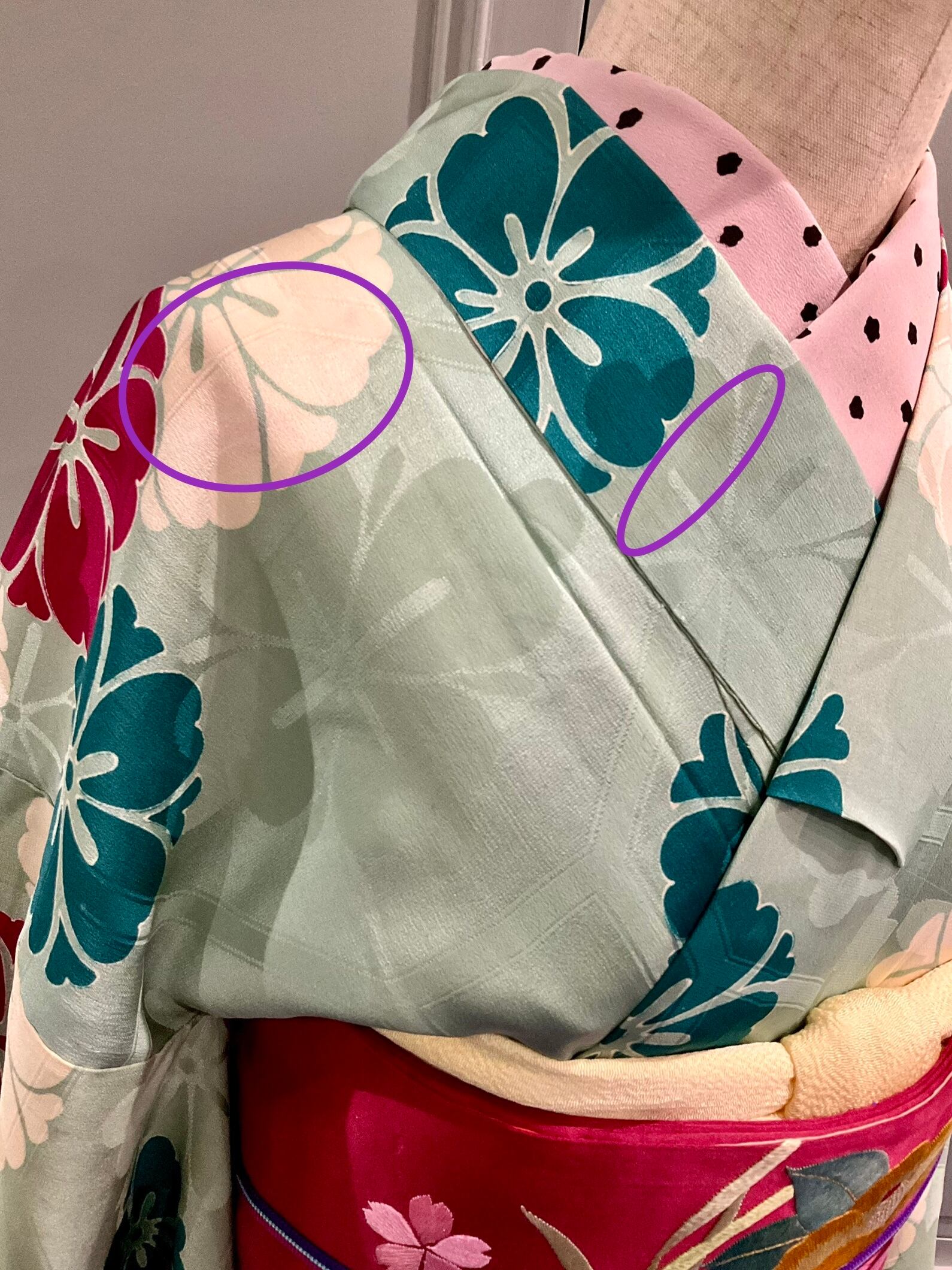 両袖、上前の膝あたり、左後ろ脇、後ろにうっすらクスミ。
