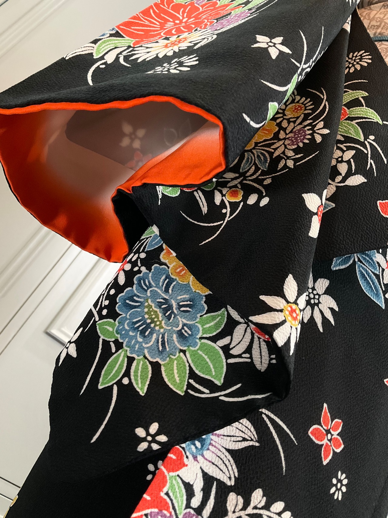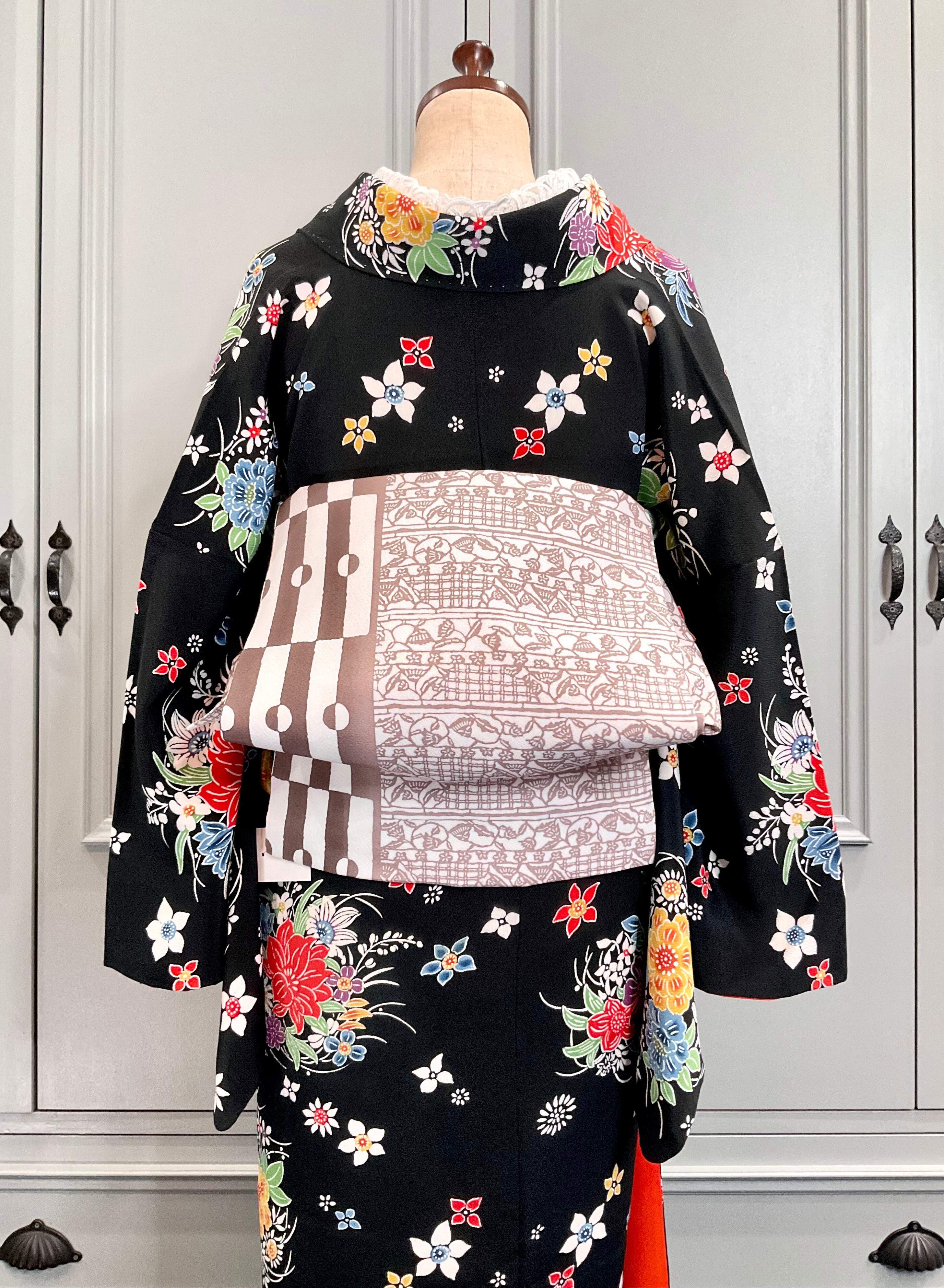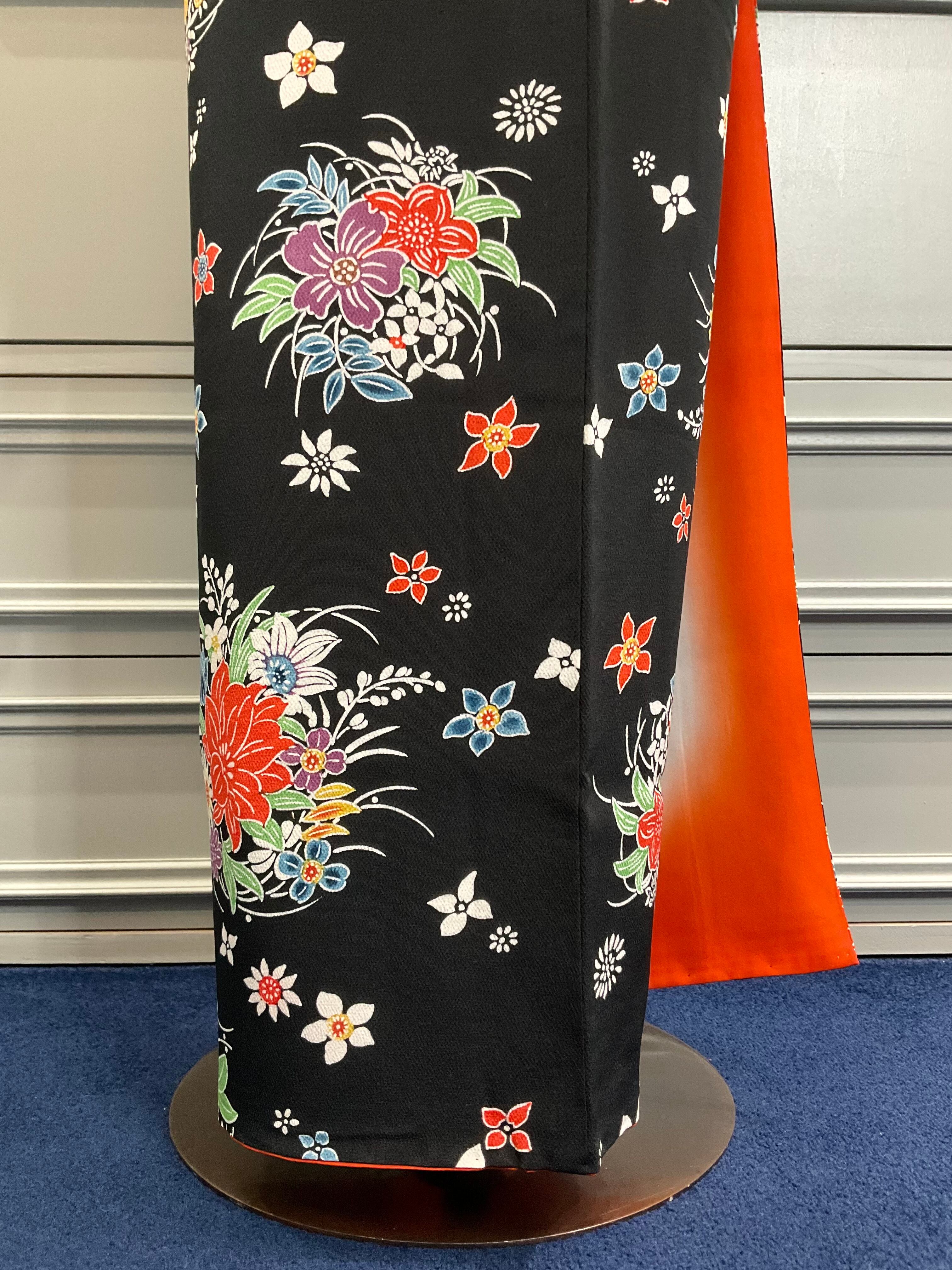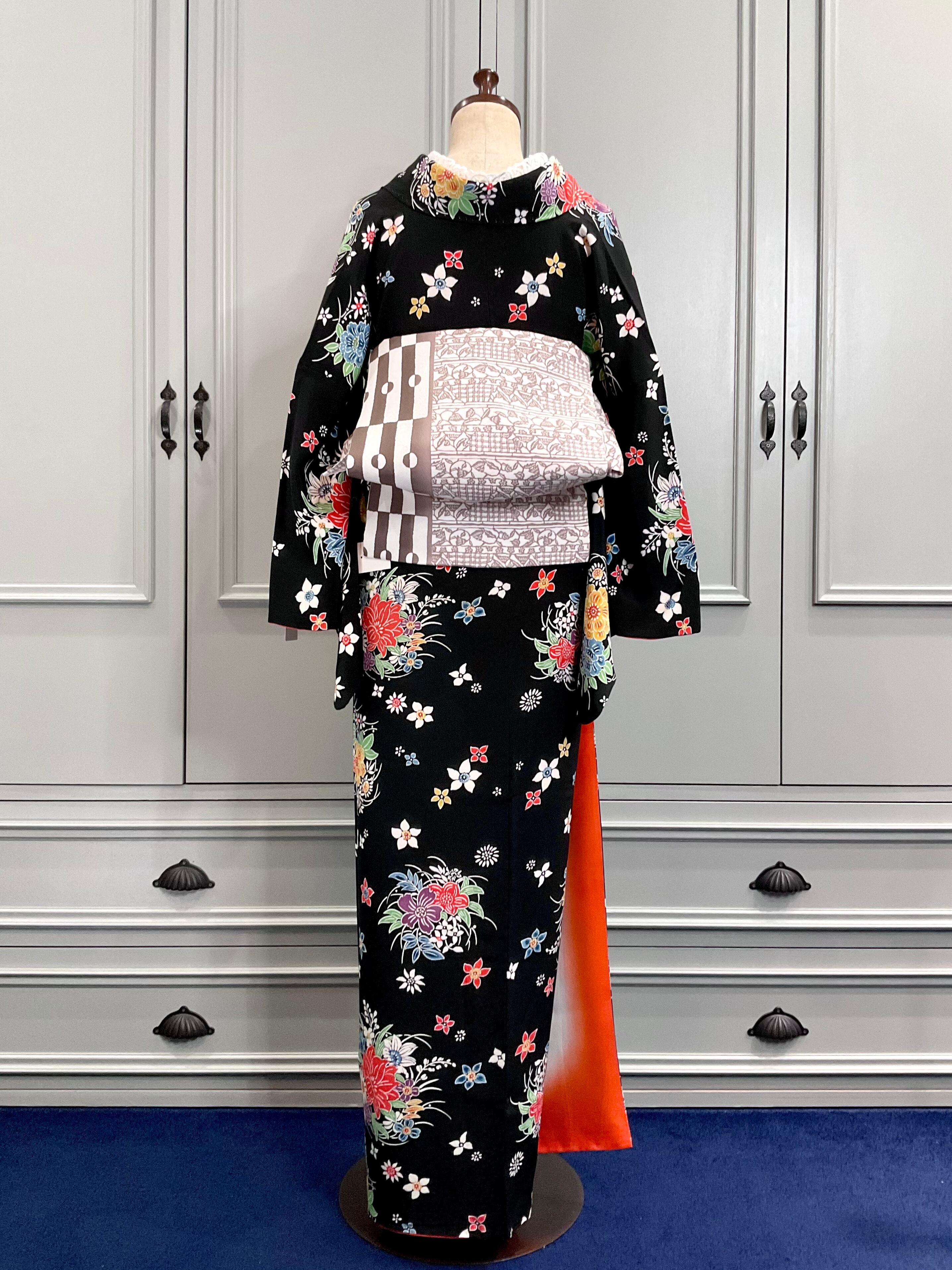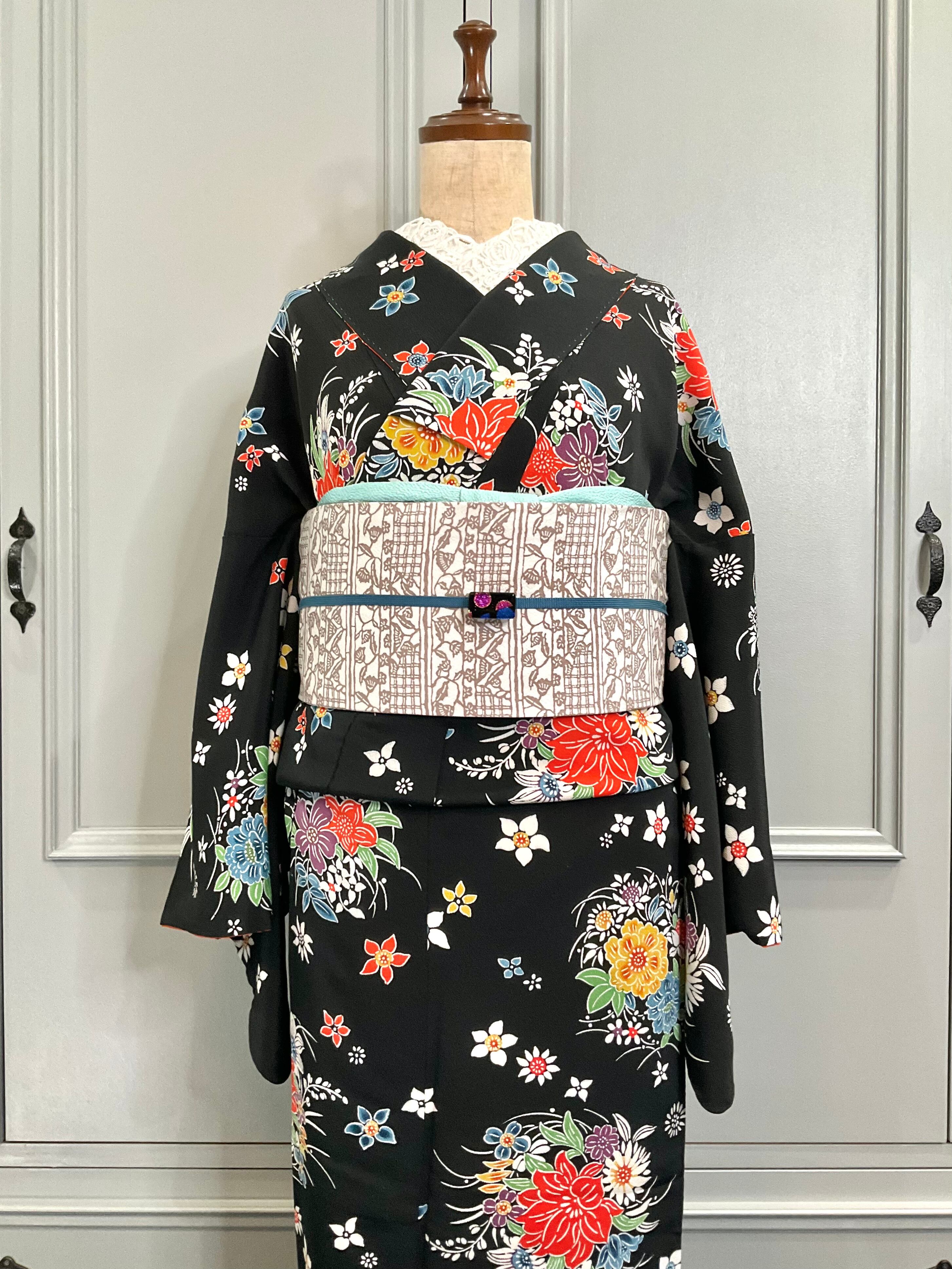 ブラックの地色に、花模様がデザインされた、小紋着物です♪