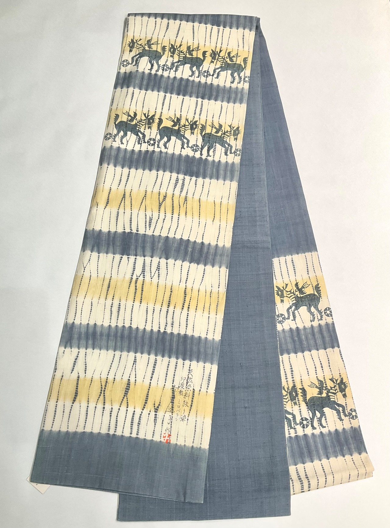 やさしい藍色と生成寄りの白色に、やわらかな黄色がアクセントとなった、やさしい雰囲気に癒される、こちらの洒落袋帯。