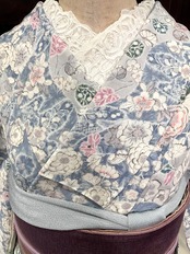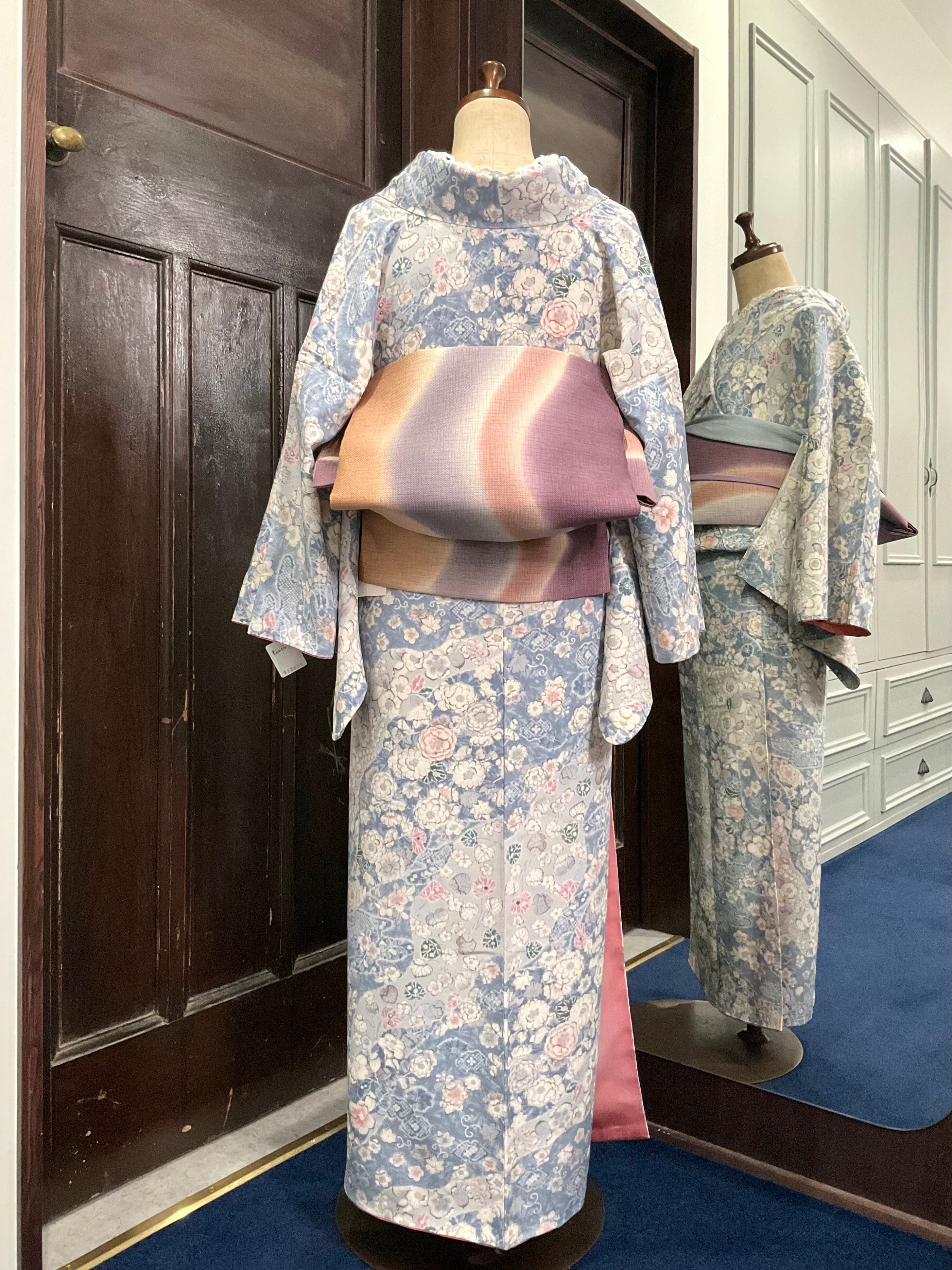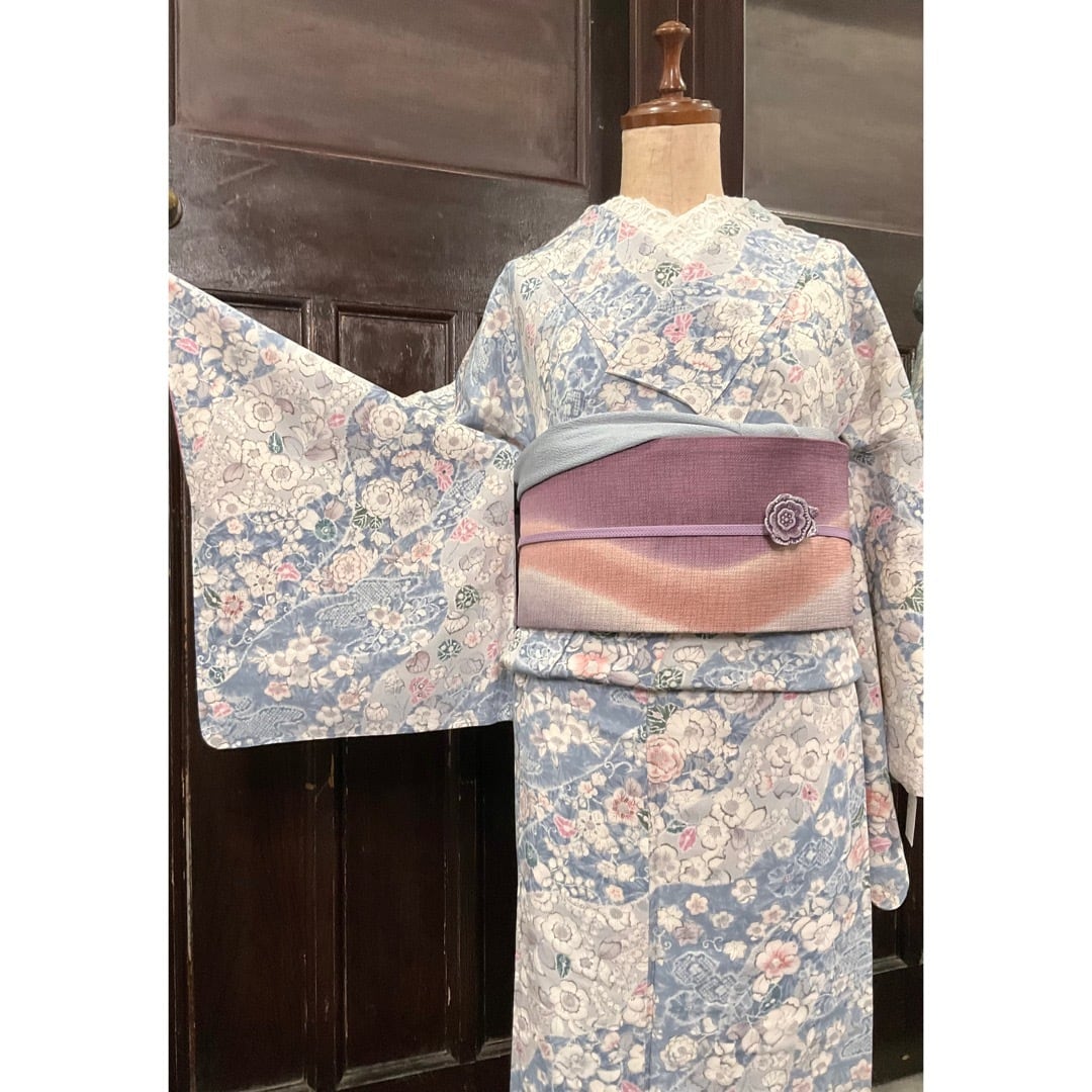 ブルー系×淡いグレー系のお色を中心とした地色に、花模様がデザインされた、小紋着物です♪