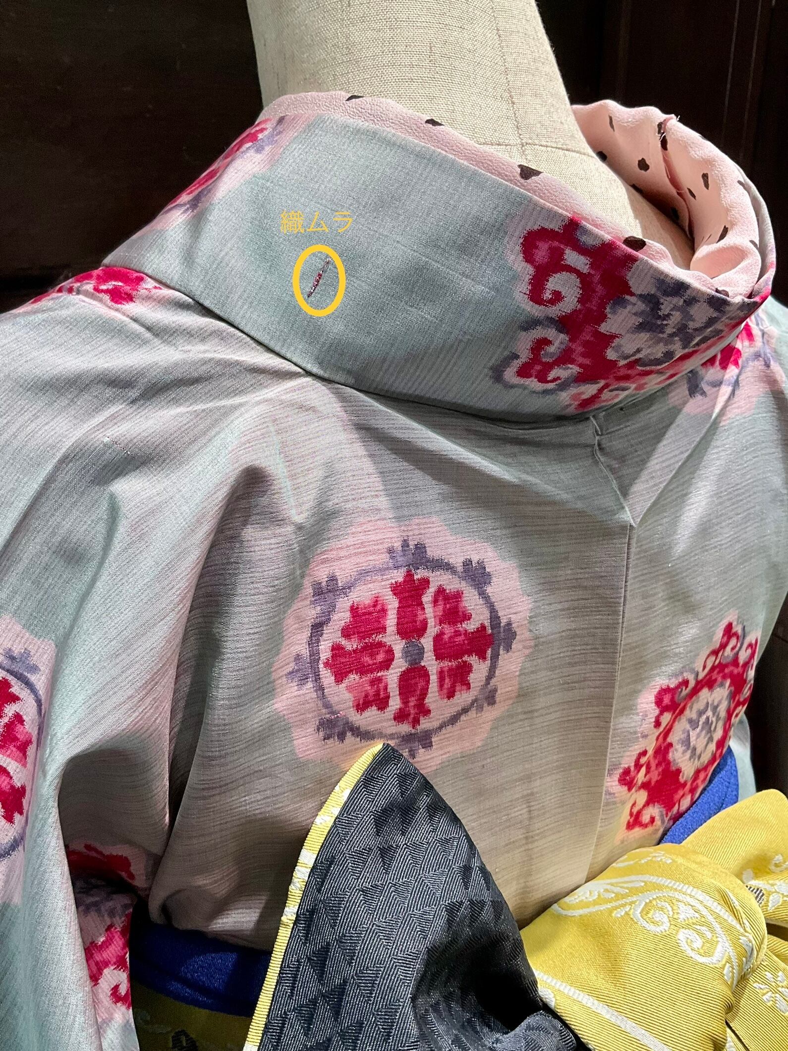 左袖口、左衿などに、銘仙や紬特有の織ムラやフシあり。