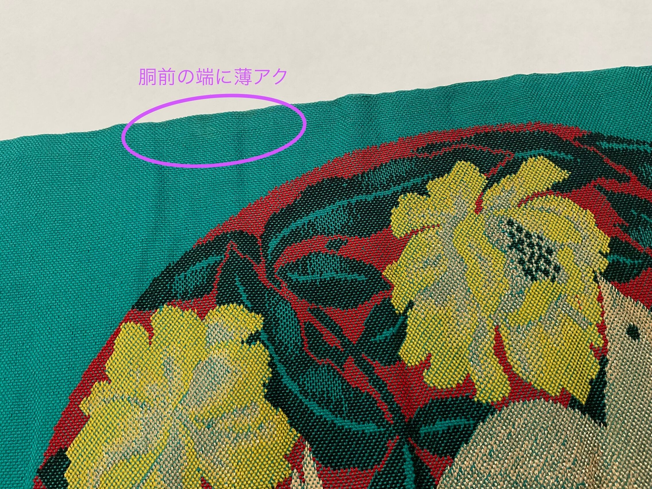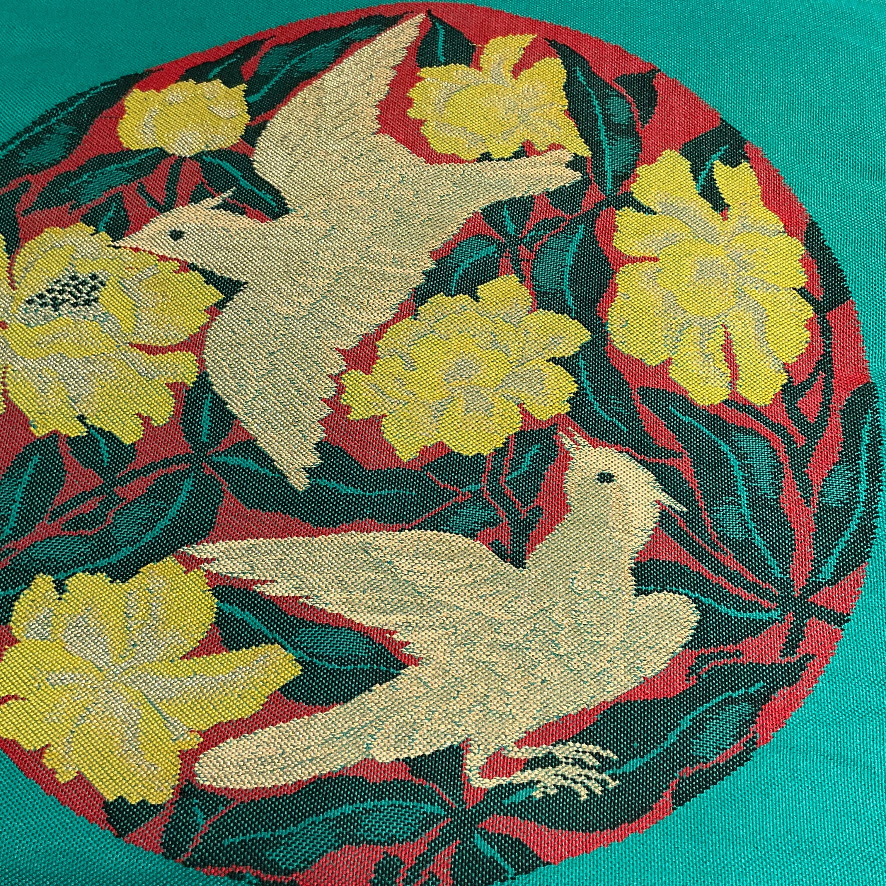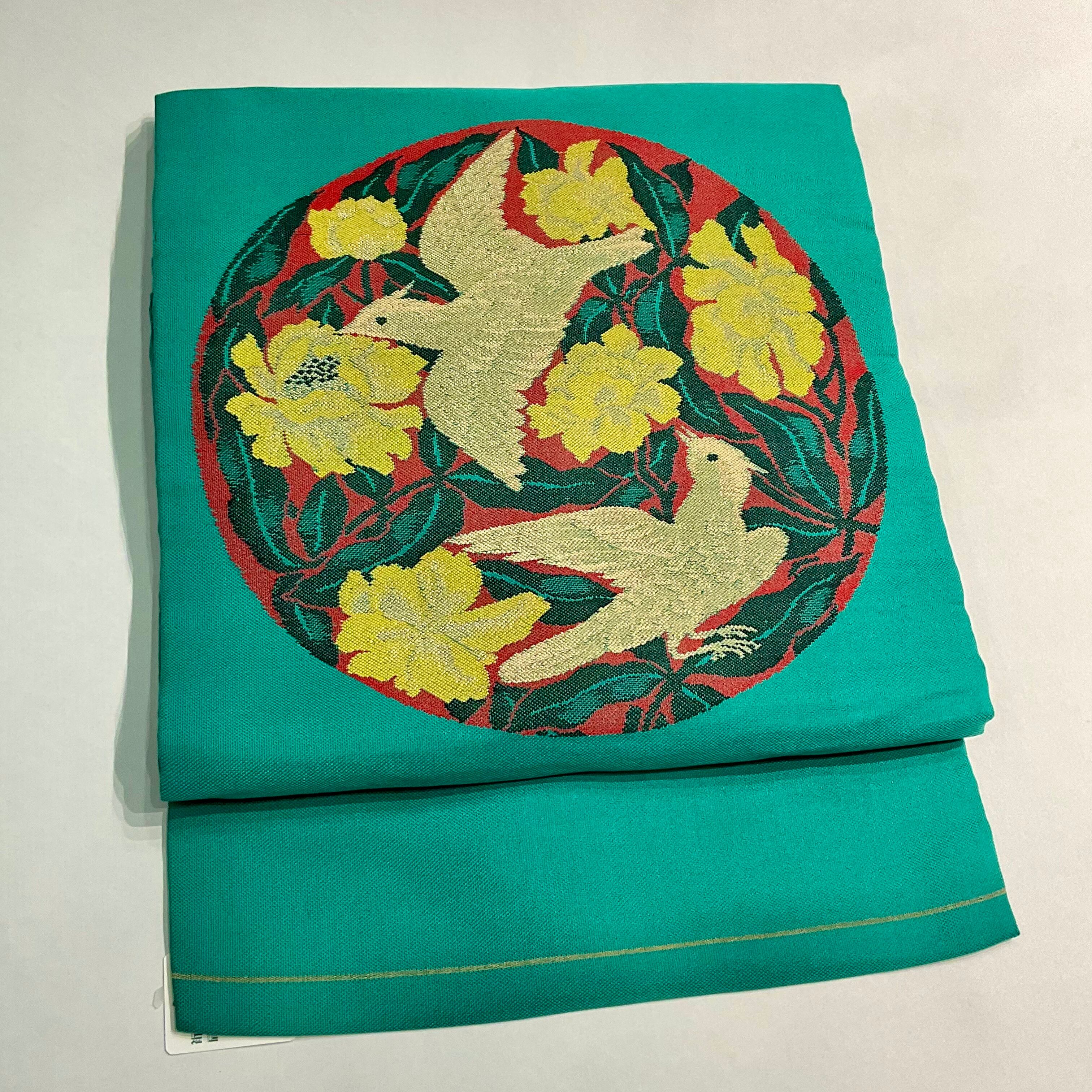 鮮やかなブルーグリーンに鳥さんや黄色いお花の織模様が目を惹くアンティークの名古屋帯です。