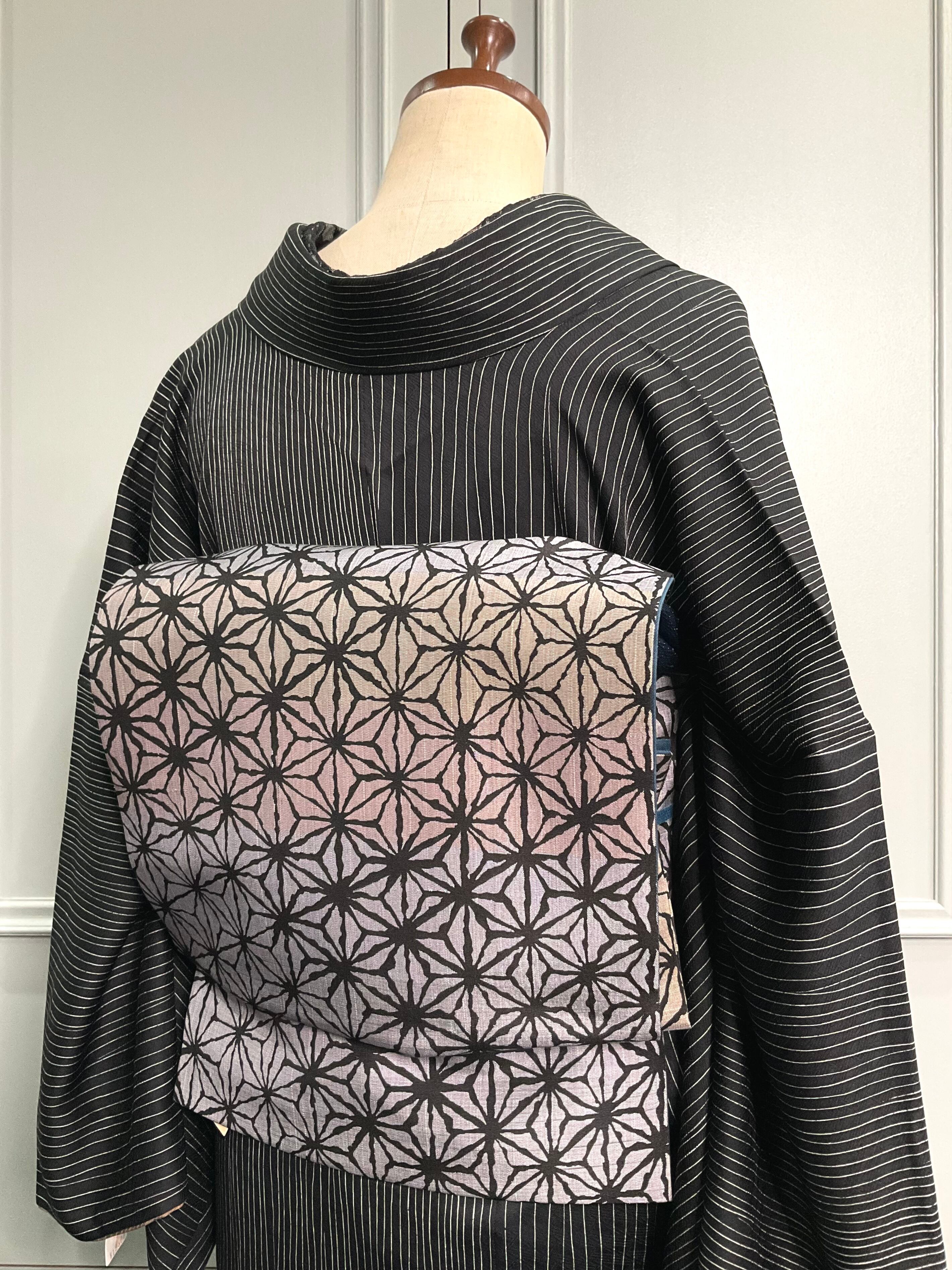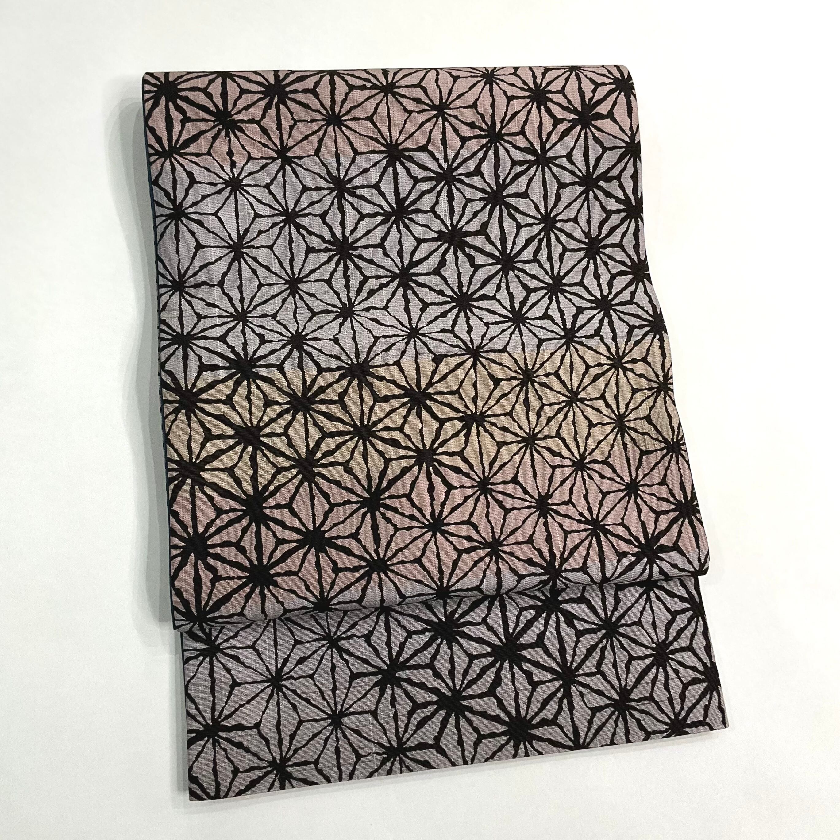 3色のグラデーションの地色に、麻の葉模様がデザインされた、洒落袋帯です♪