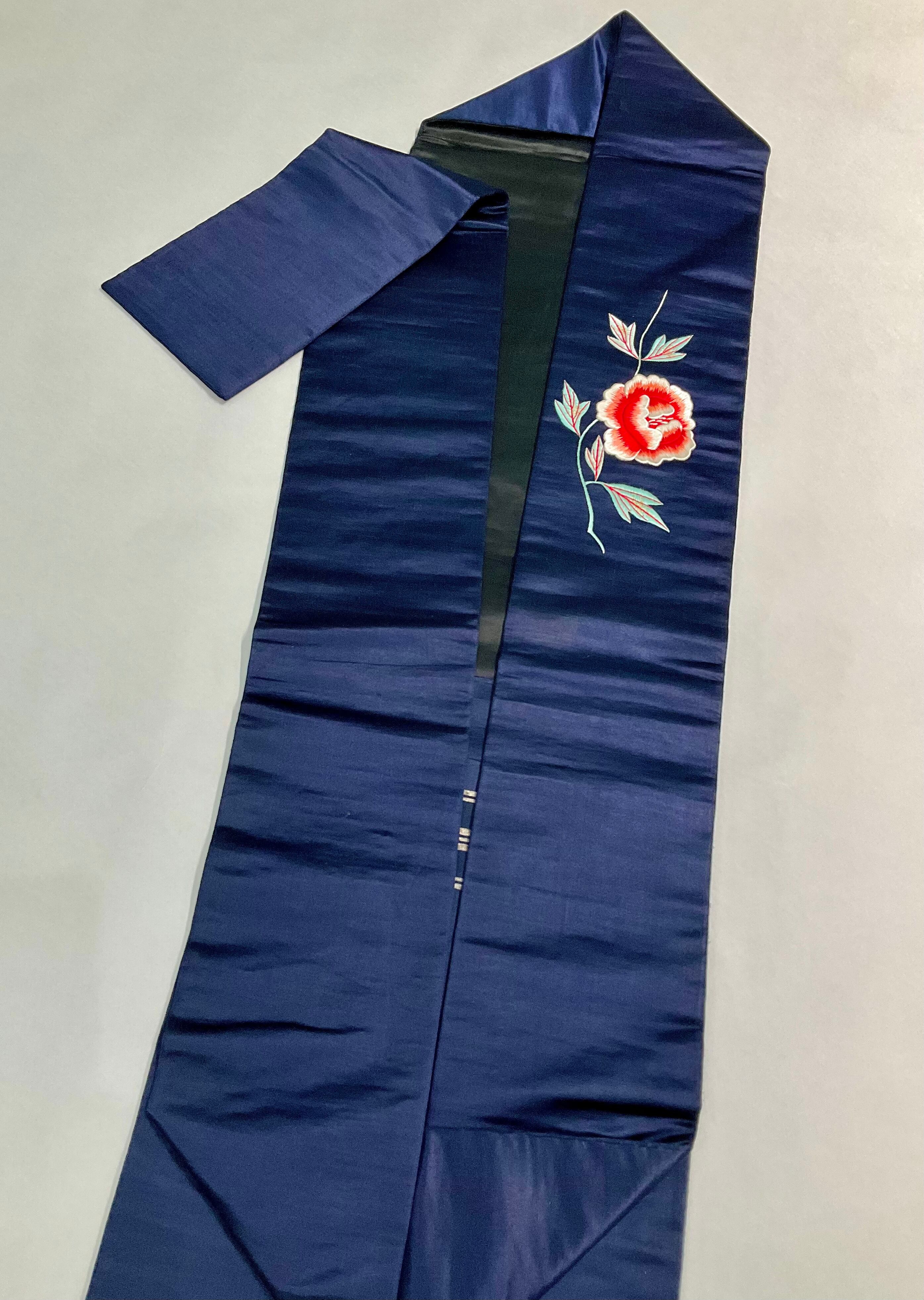 ネイビーの繻子地に扇子と牡丹の刺繍が美しいアンティークの名古屋帯です♪
