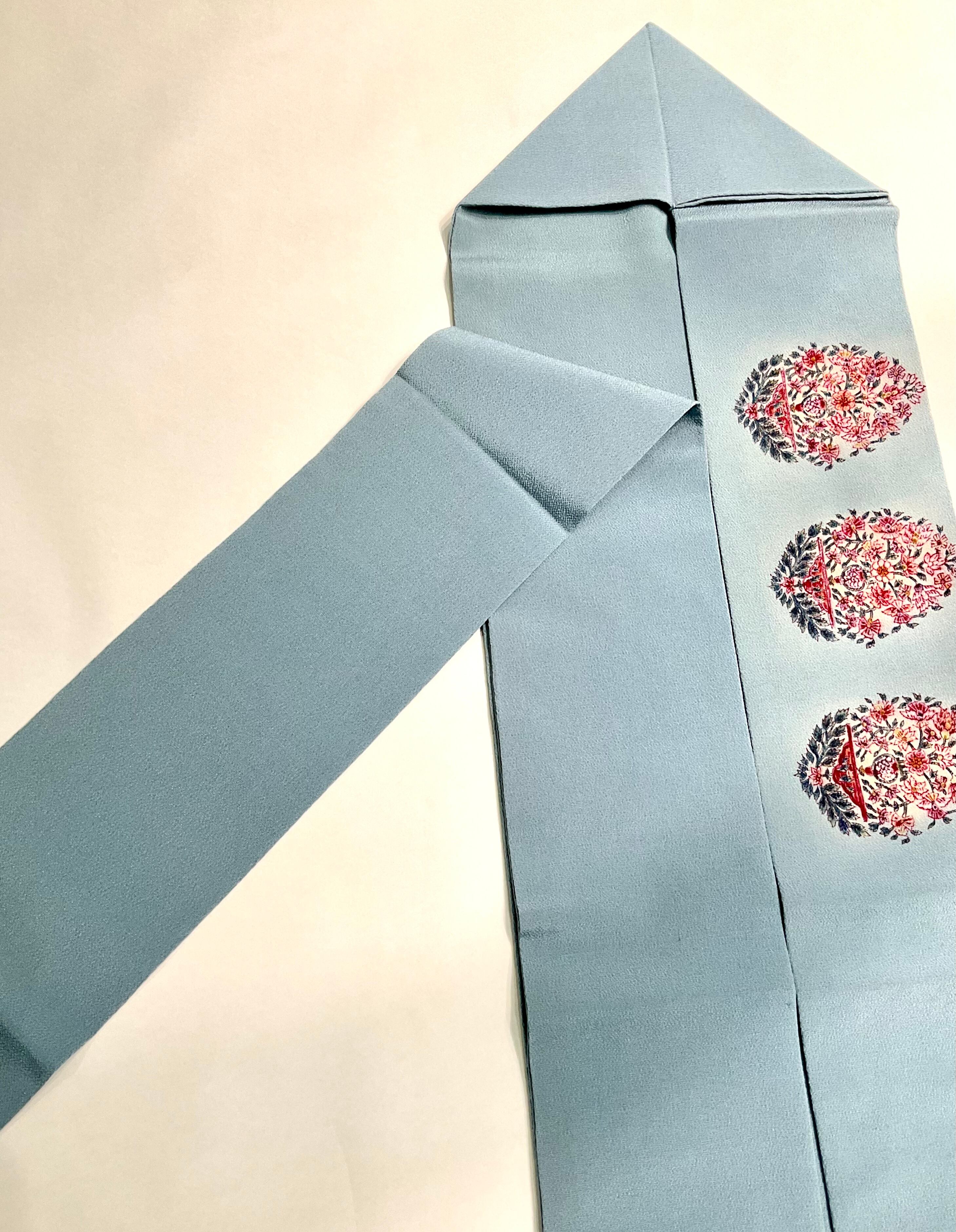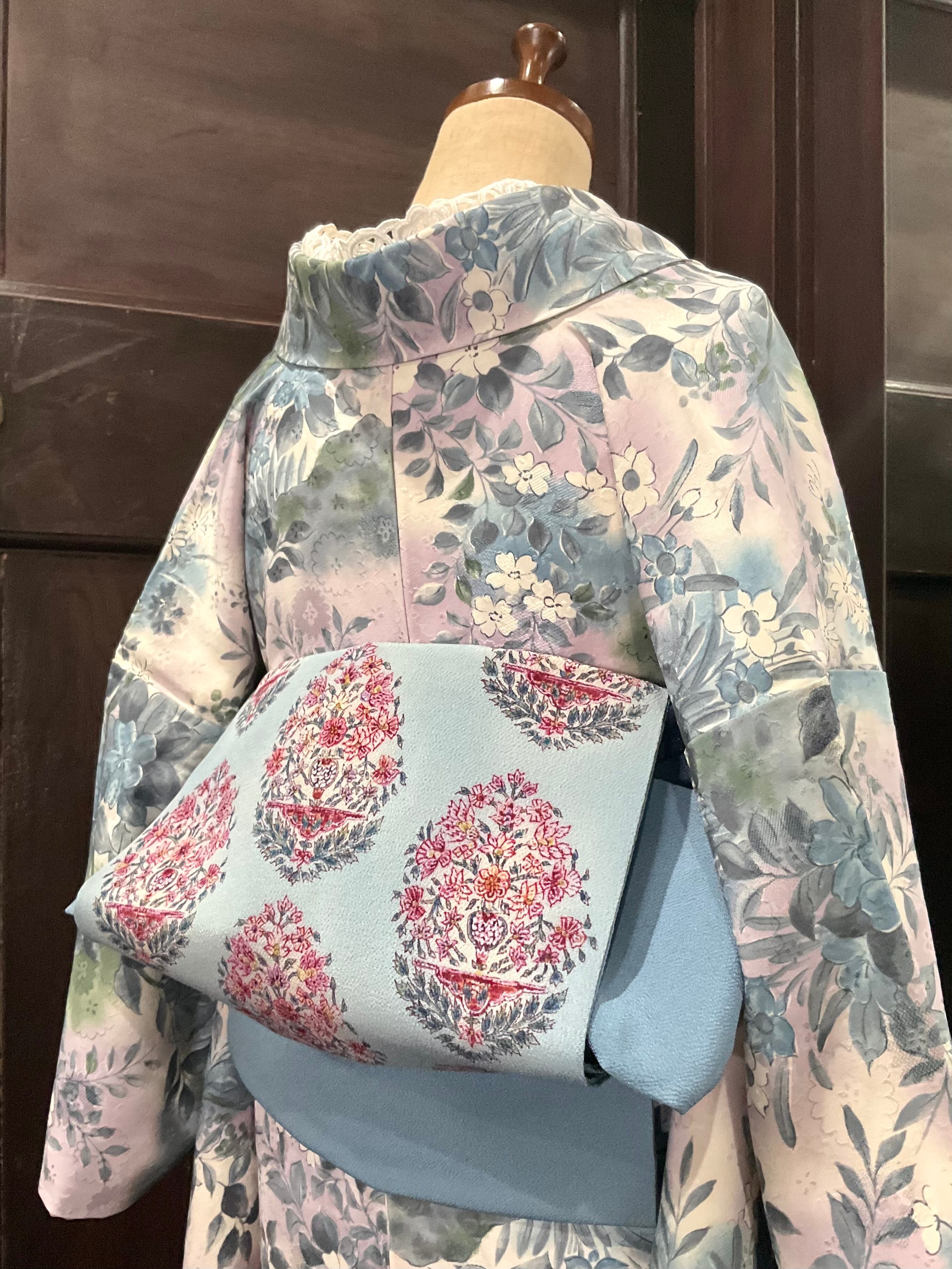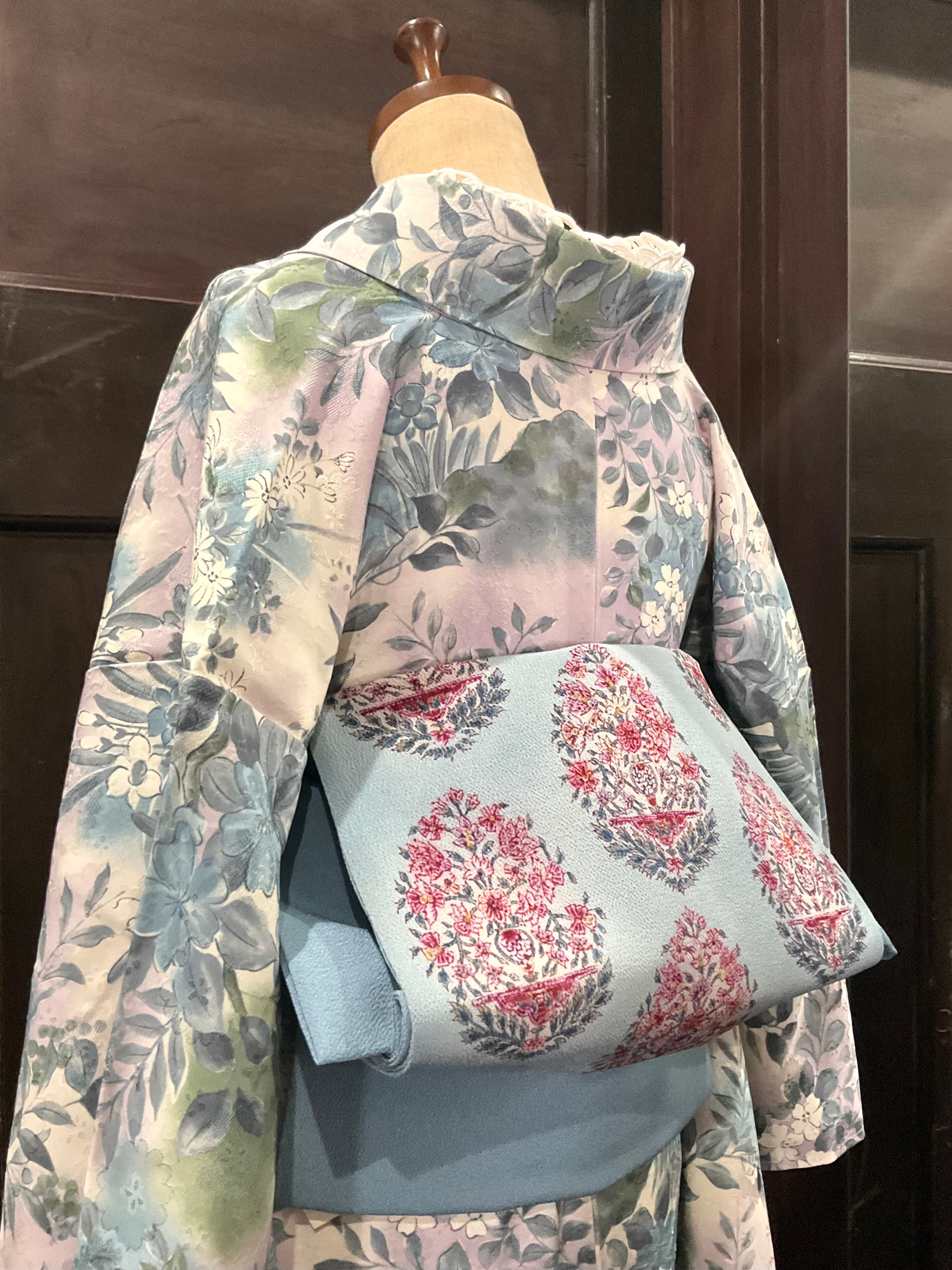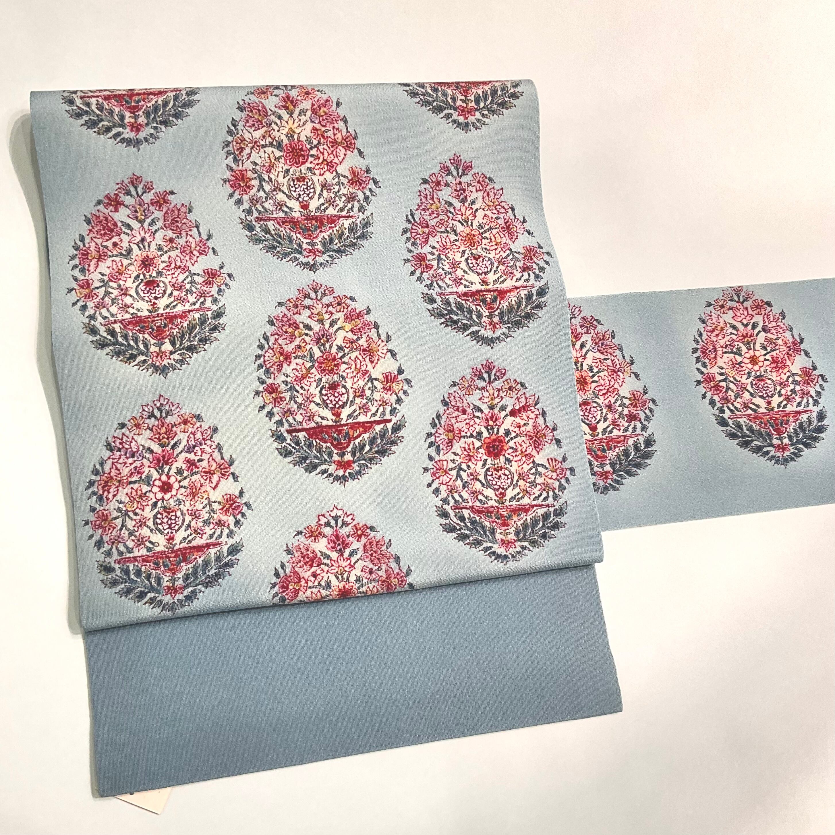 ほんのりグレーがかった、淡いブルー系の地色に、花模様がデザインされた、名古屋帯です♪