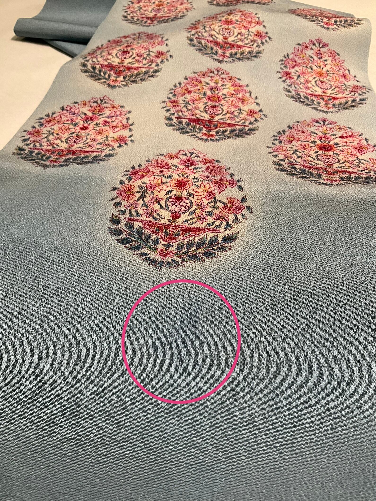 お太鼓柄すぐ下のあたりに、うっすらシミ有り。(締めると隠れます)