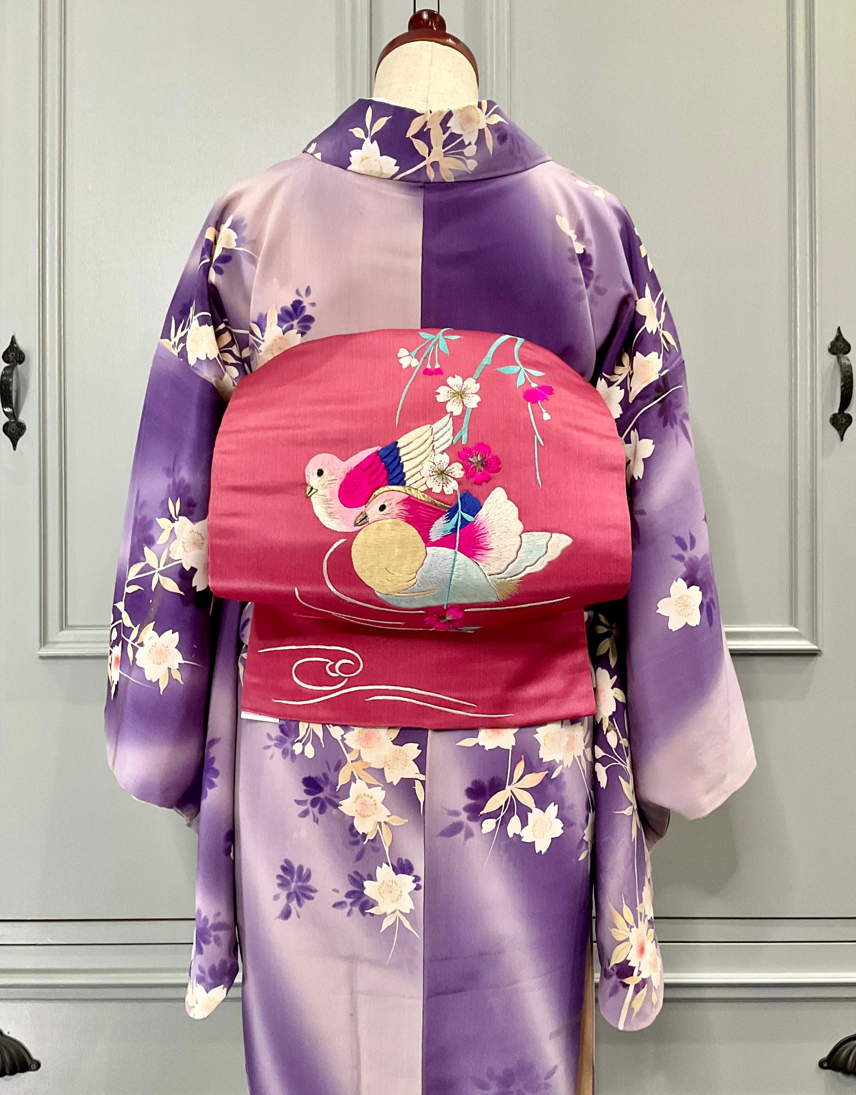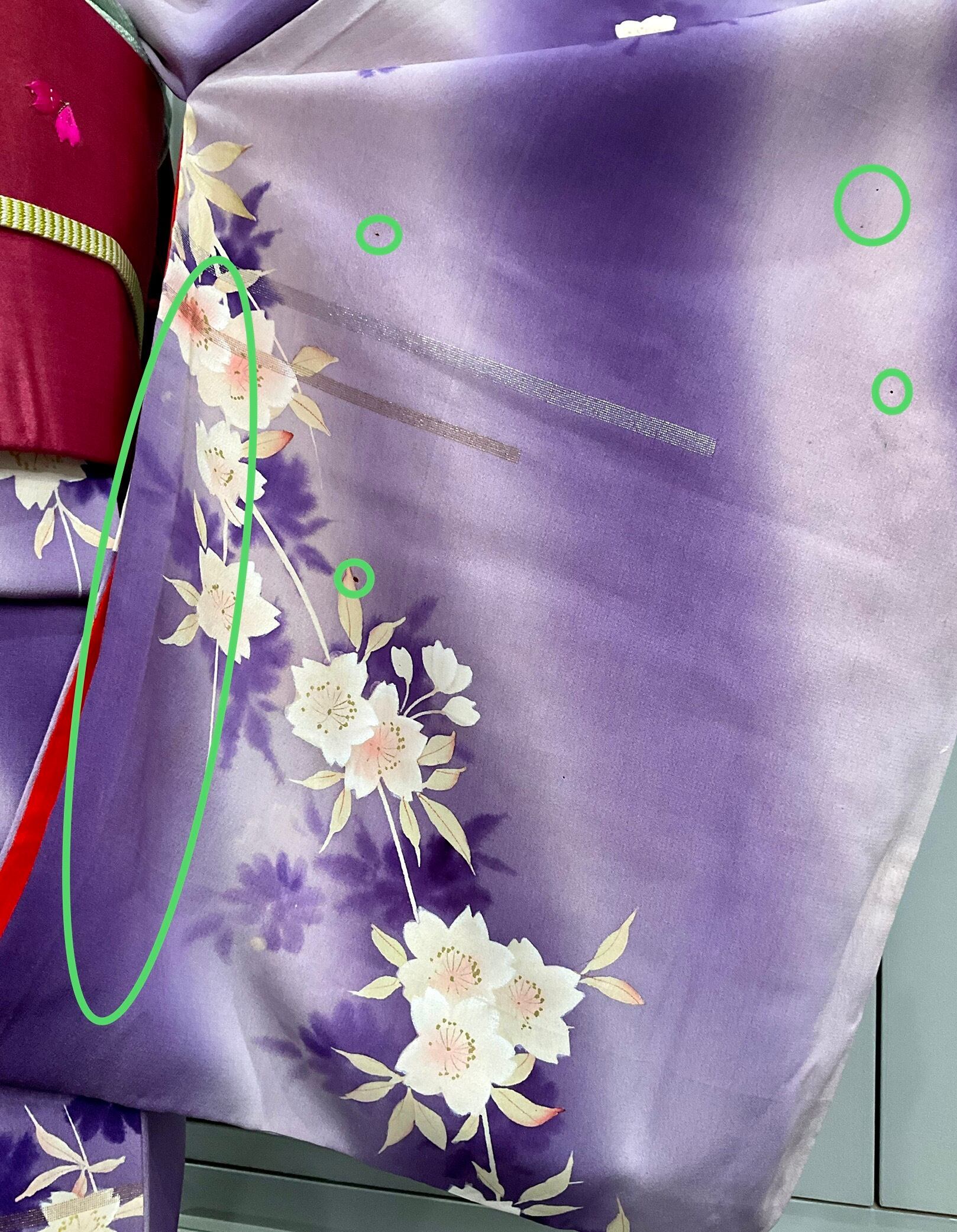 紫の暈しに桜の模様が美しいアンティークの小紋着物です。