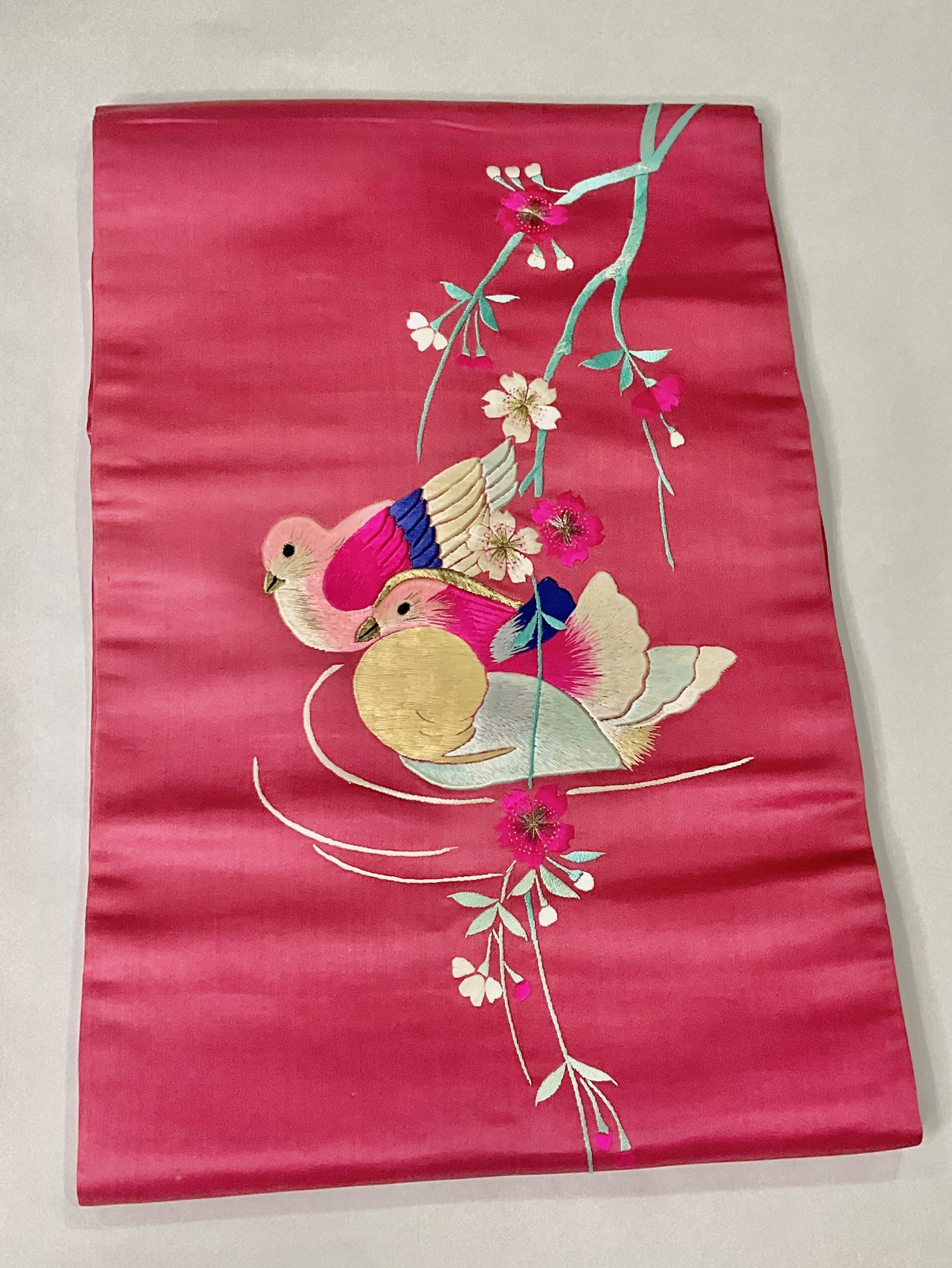 地色はやわらかいローズピンク系ですが、おしどりや桜の刺繍はアンティークならではのビビットな色遣いで目を惹きます♡