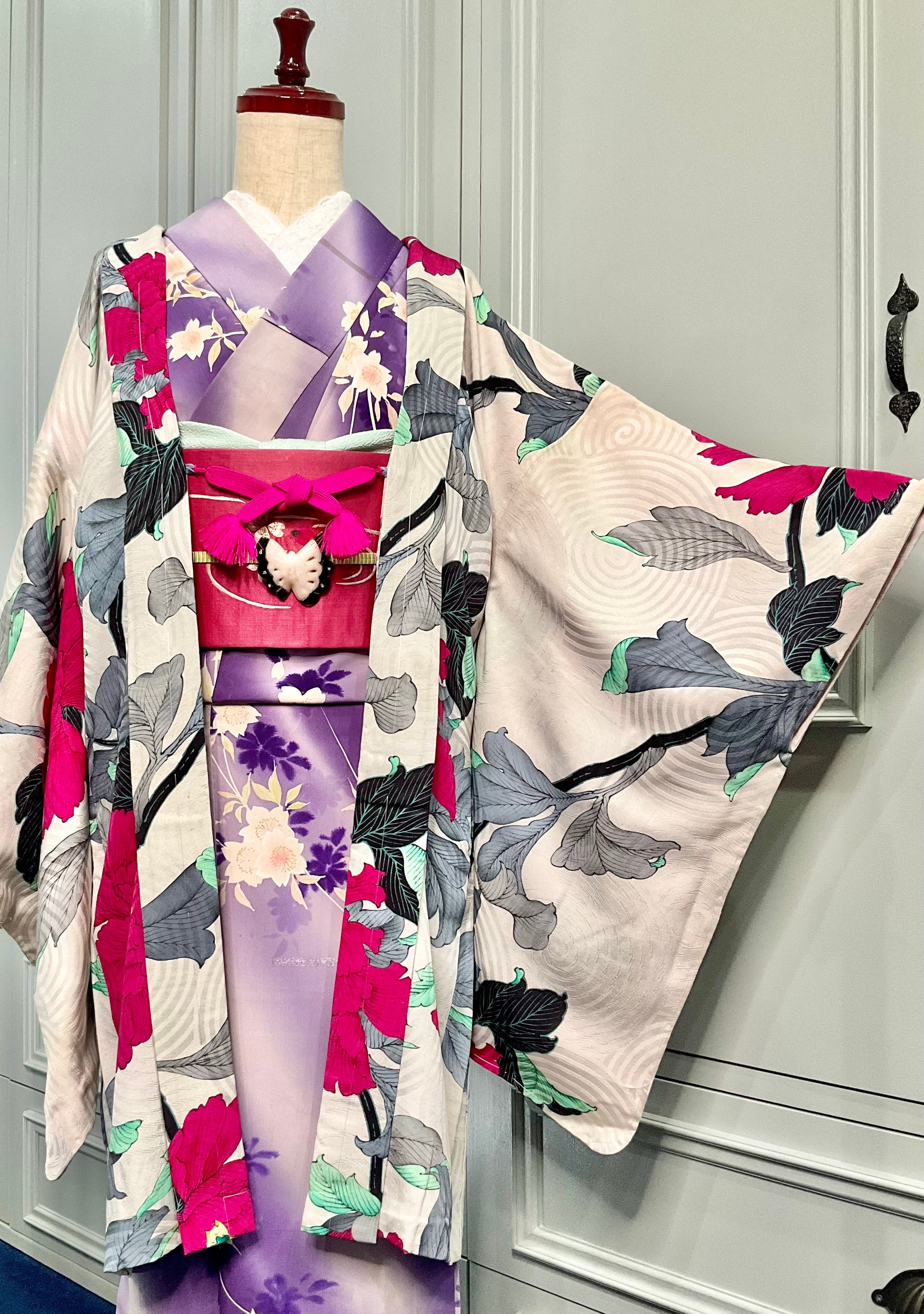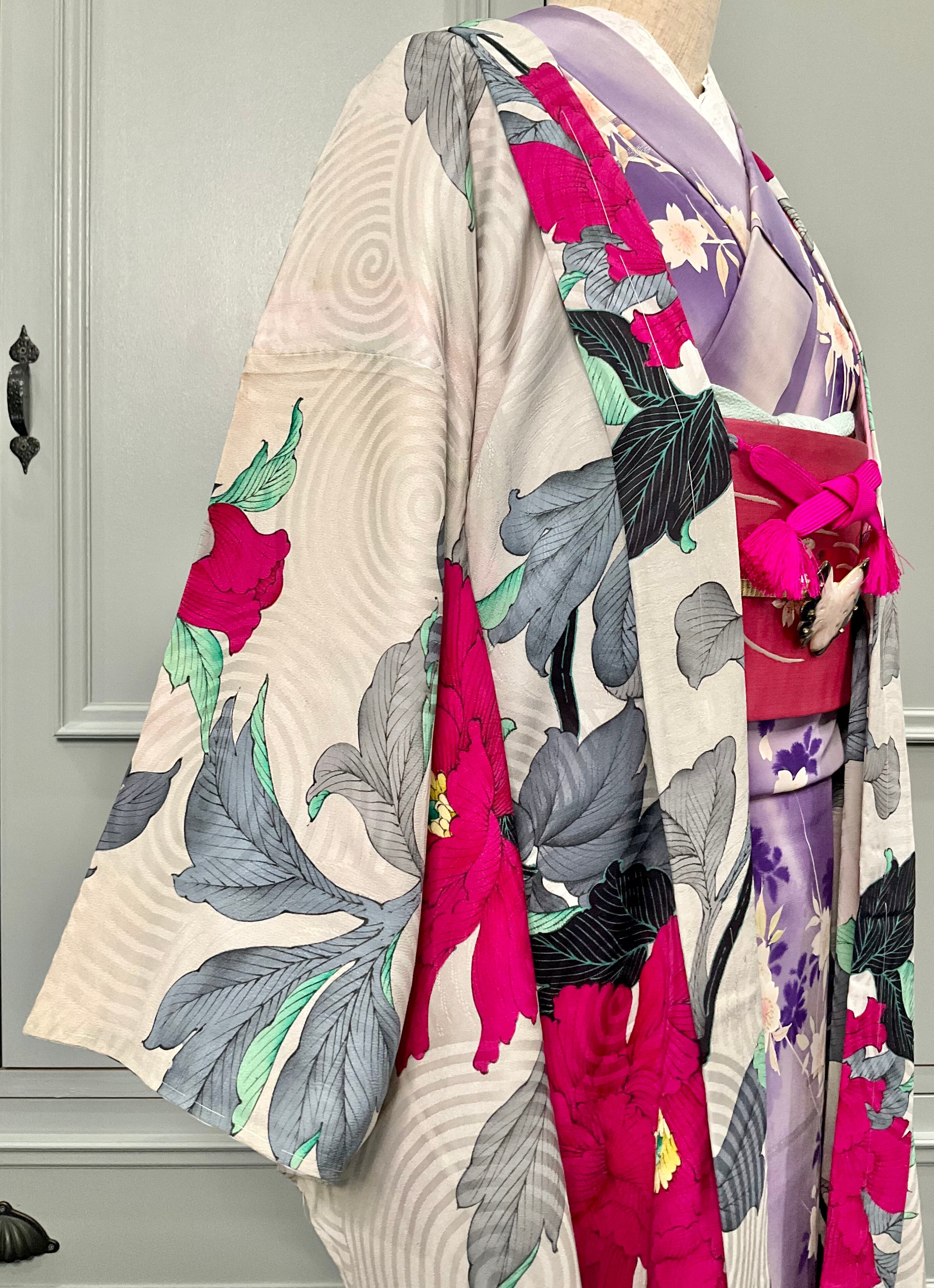 オフホワイトの地色に大きな牡丹が目を惹くアンティーク長羽織です!