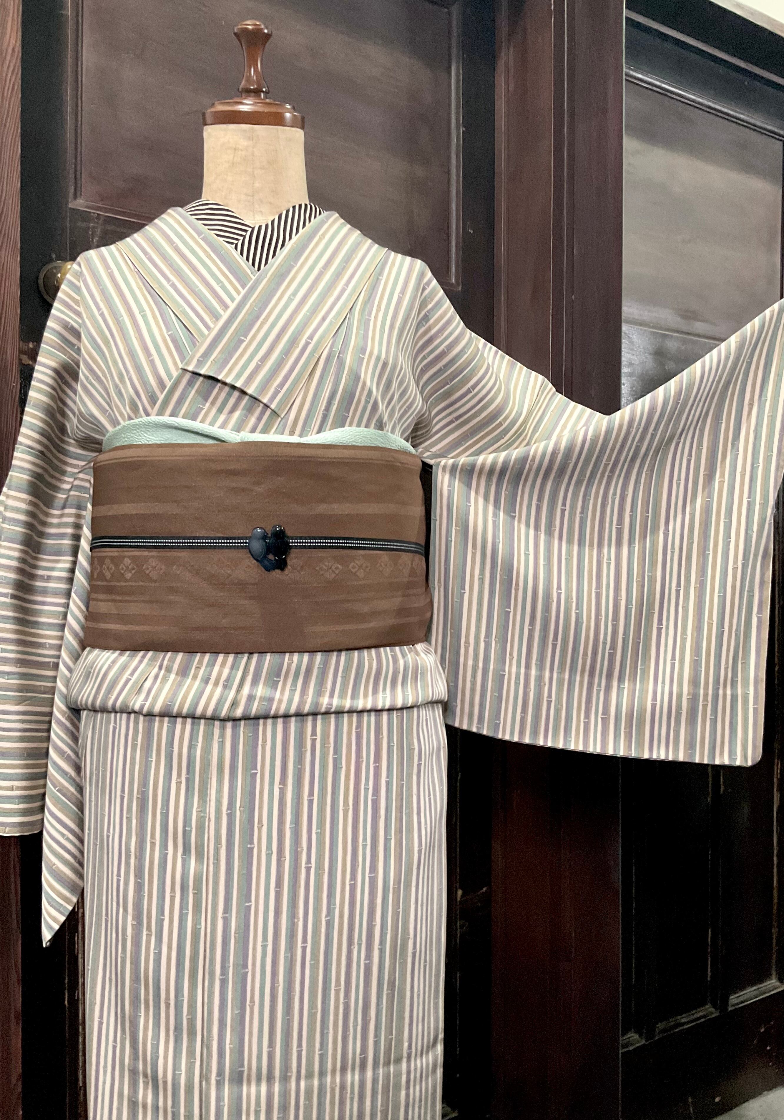long*単衣*Bamboo stripes*リサイクル小紋着物 A191