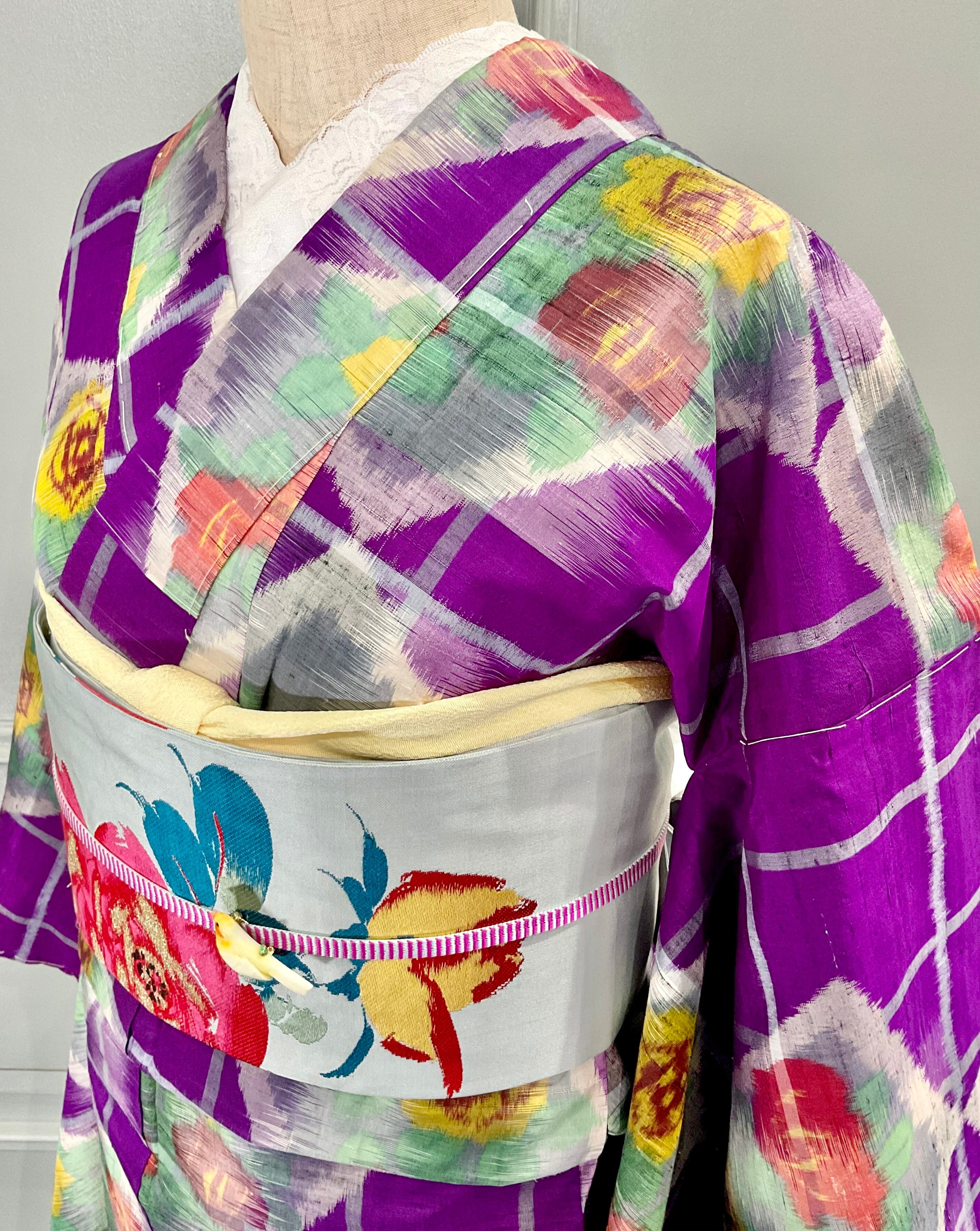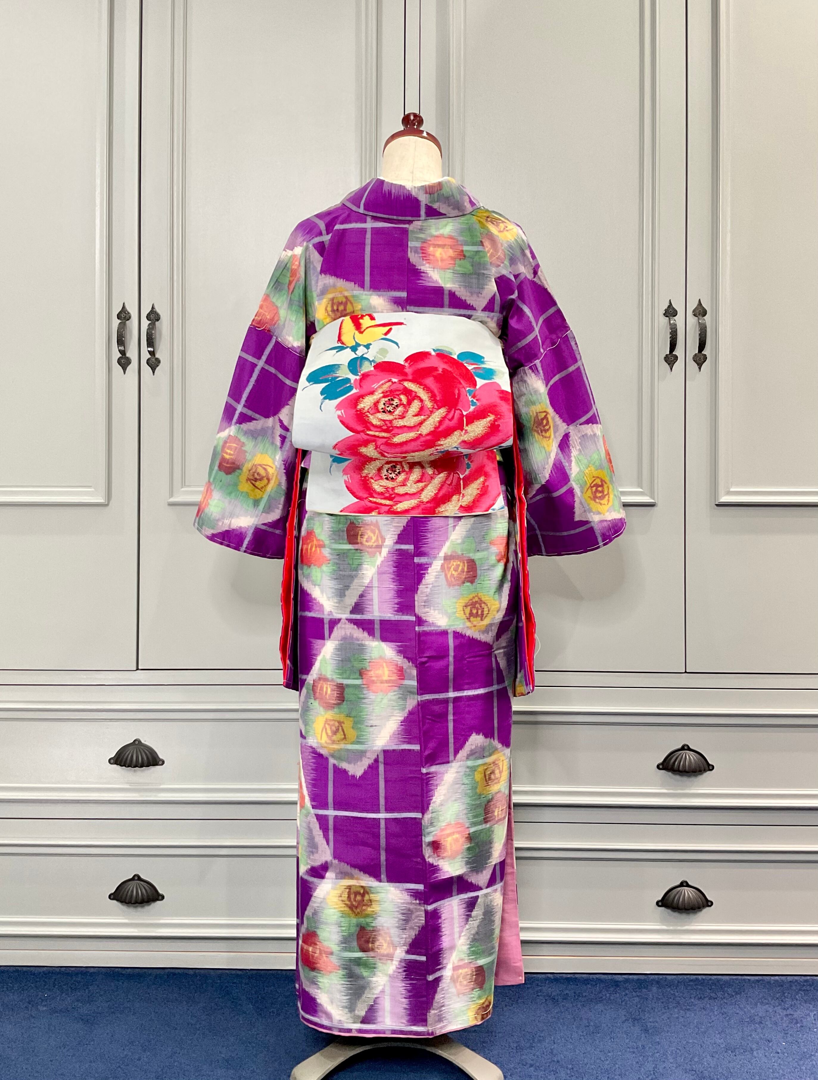 パープルの地色に薔薇の絵手紙のような柄とチェック柄がお洒落なアンティーク銘仙着物です。