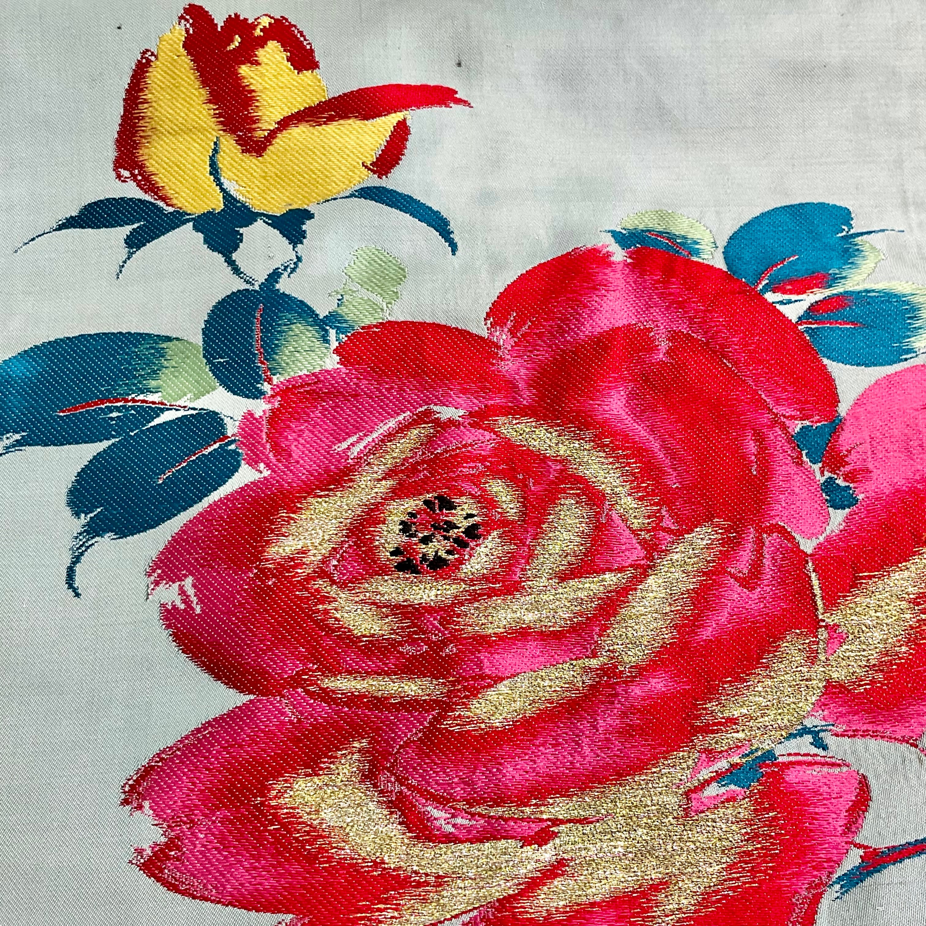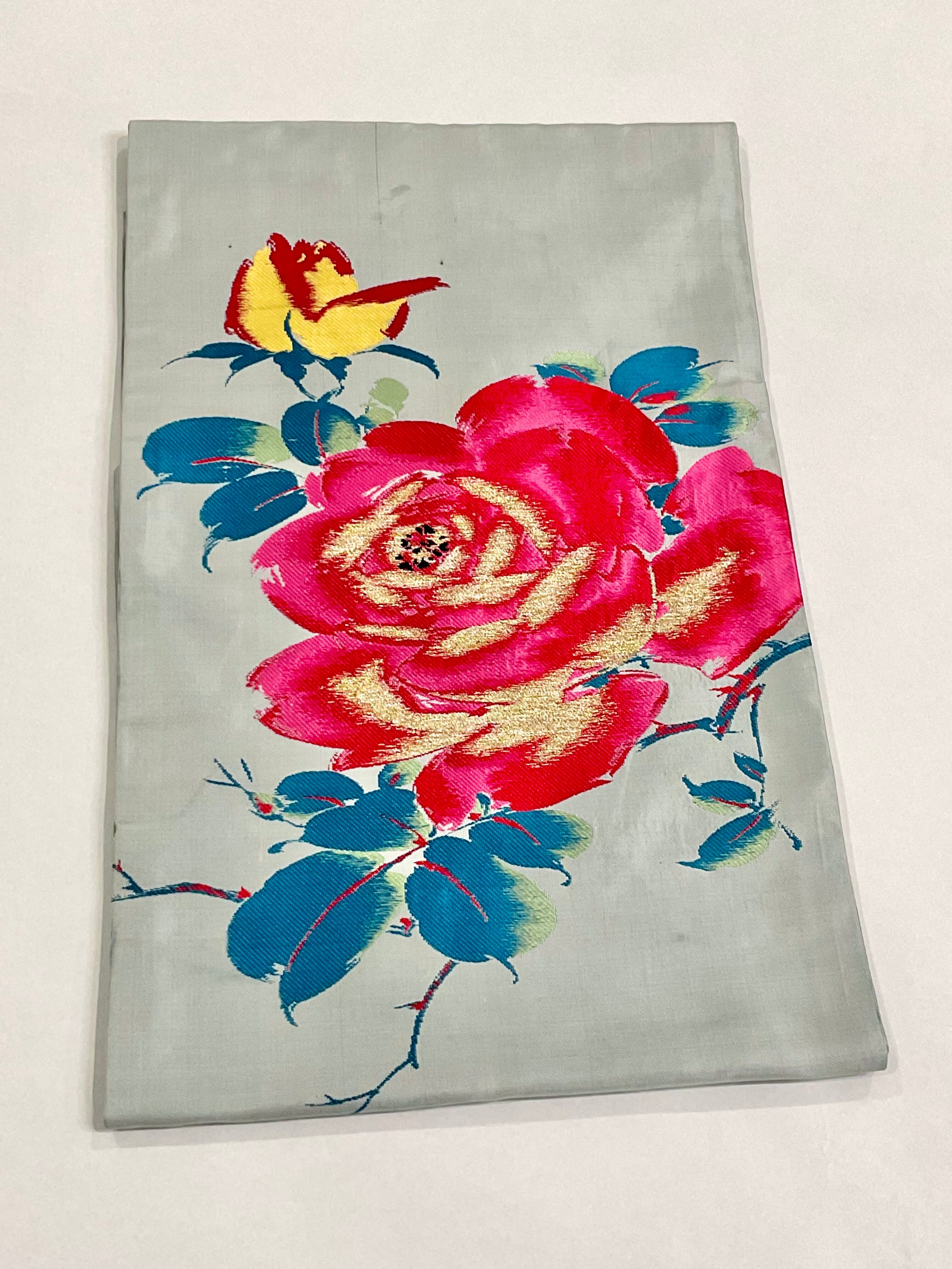 アイスグレーに大きなビビットピンクの薔薇と黄色い薔薇の蕾の織模様が目を惹くアンティークの名古屋帯です。