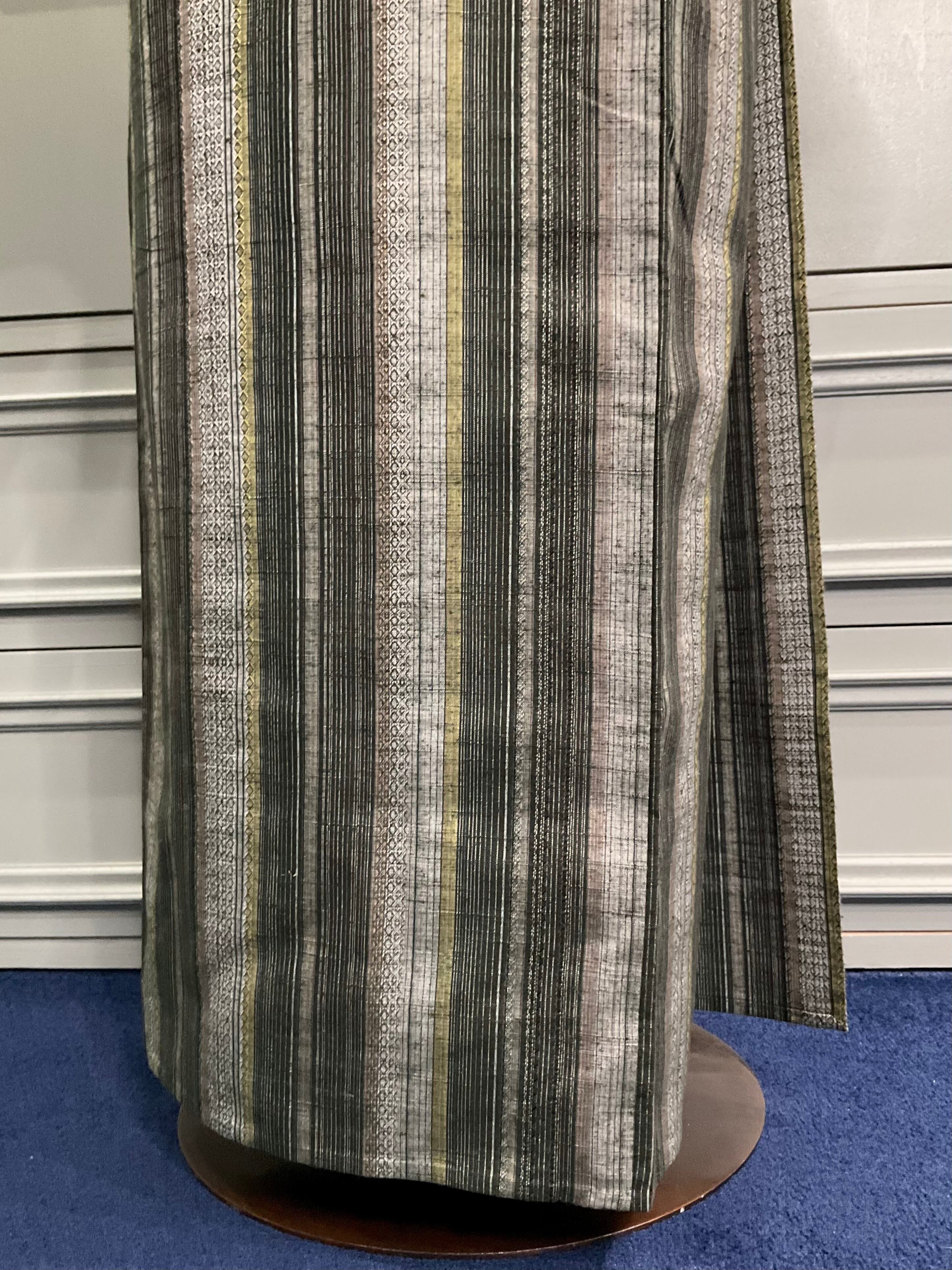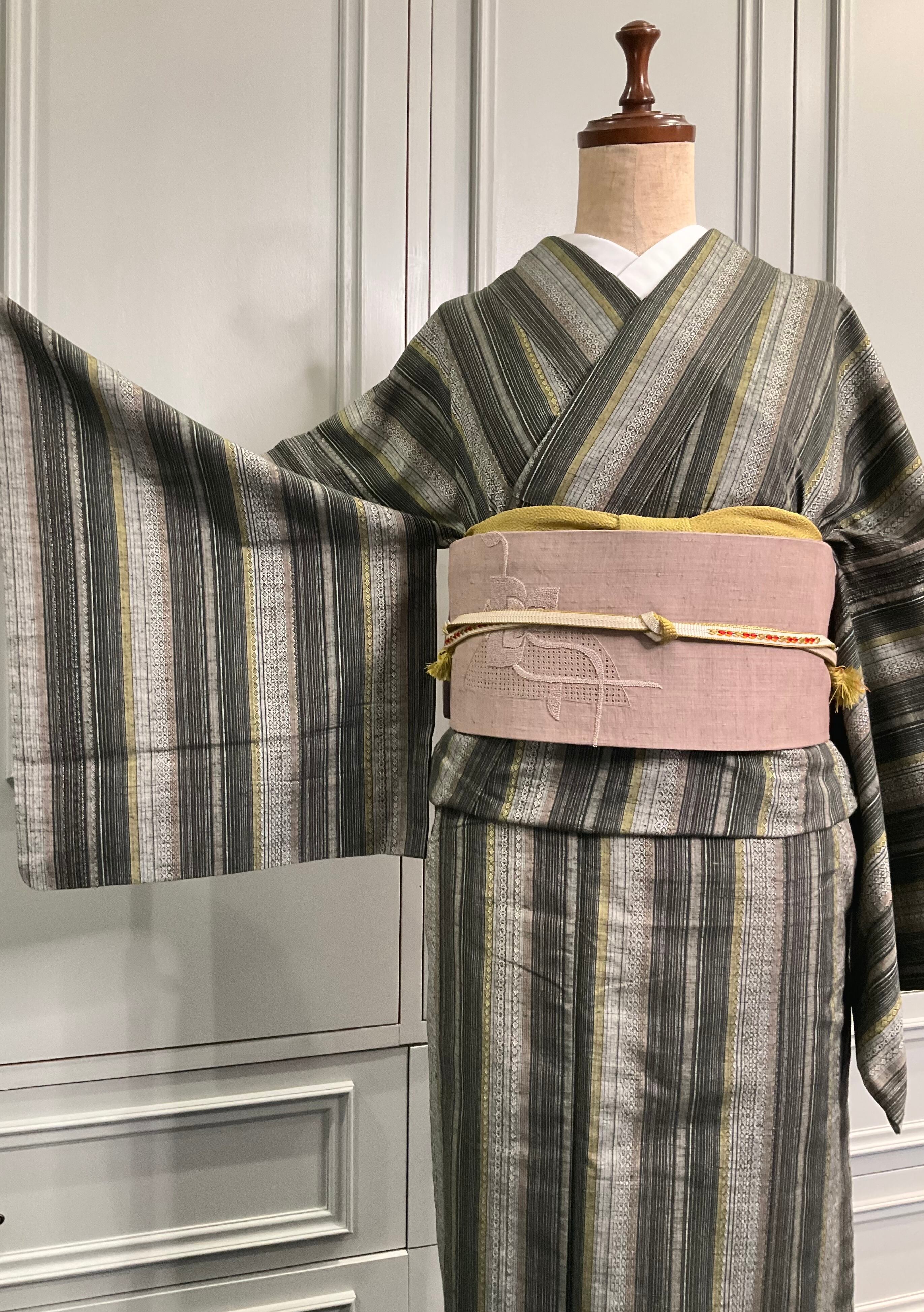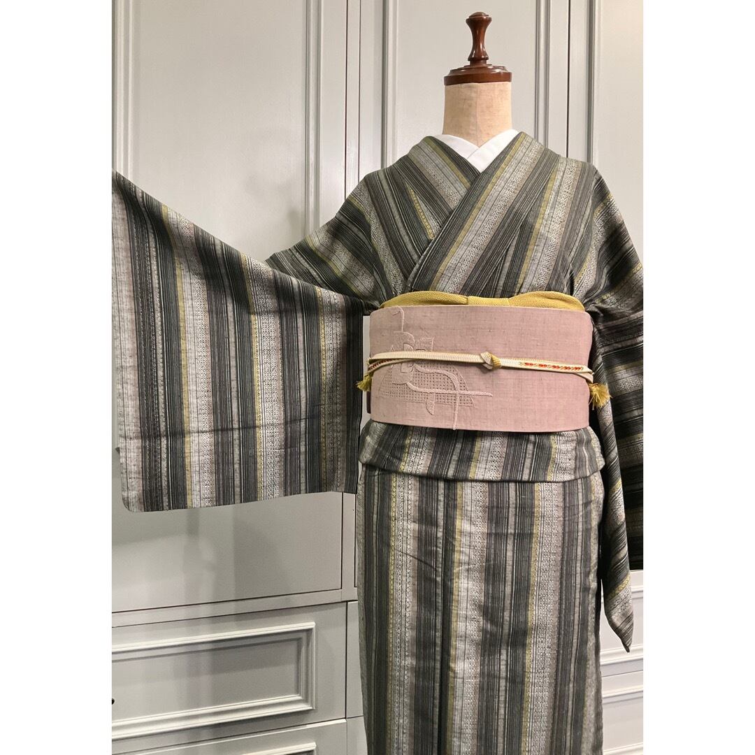 グリーン系統を中心に、落ち着いたカラーでまとめられたストライプ柄が、ちょい渋でかっこいいこちらのお着物。