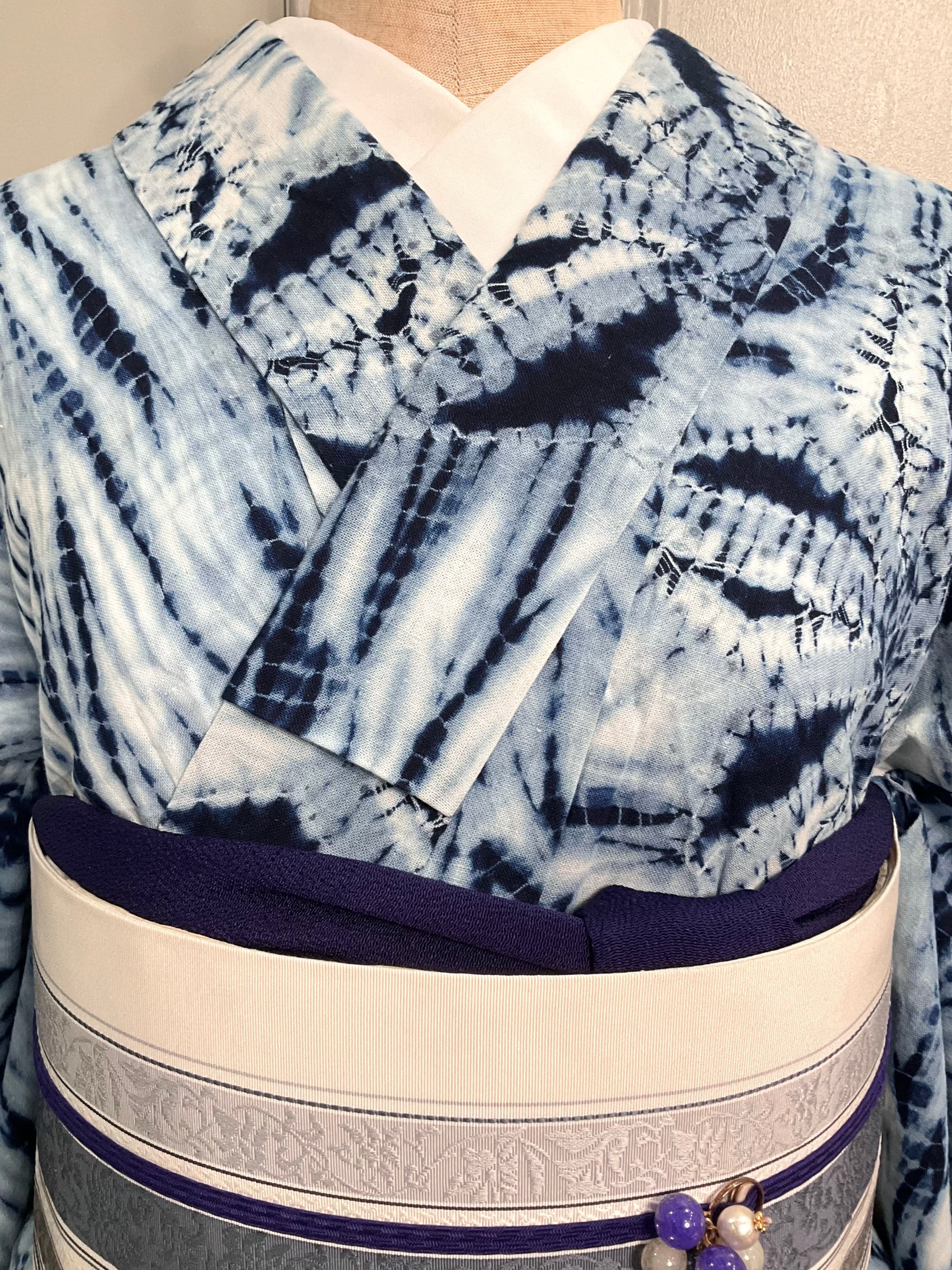 こちらは木綿の単衣ですが、少しハリのある厚さの生地感になりますので、単衣の時期は衿を入れて単衣着物として、また暑くなった頃には衿無しで浴衣としても着用いただくことが出来る為、長い期間お召いただけますのでオススメです^^