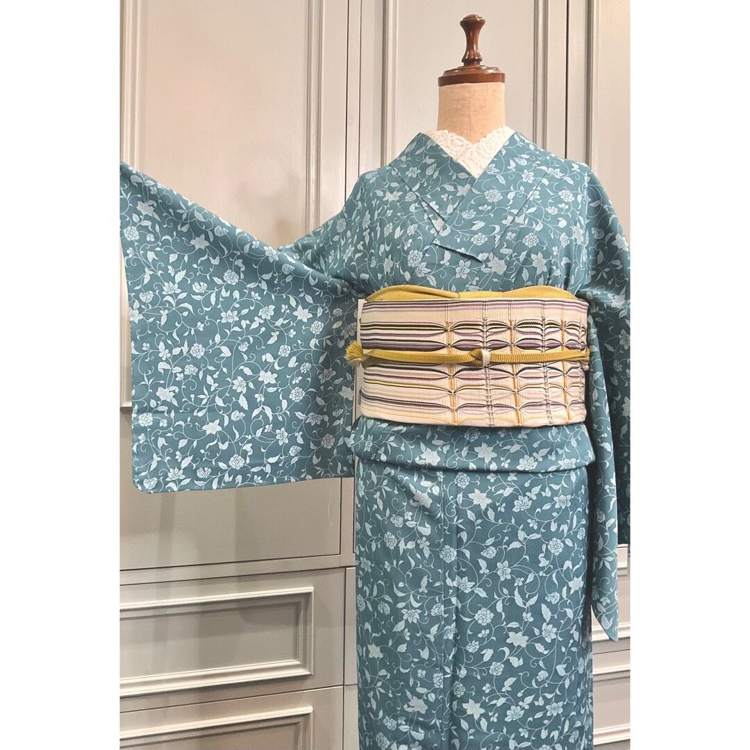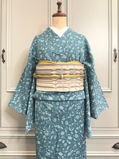 ブルー系の地色に、花模様がデザインされた、単衣の小紋着物です♪