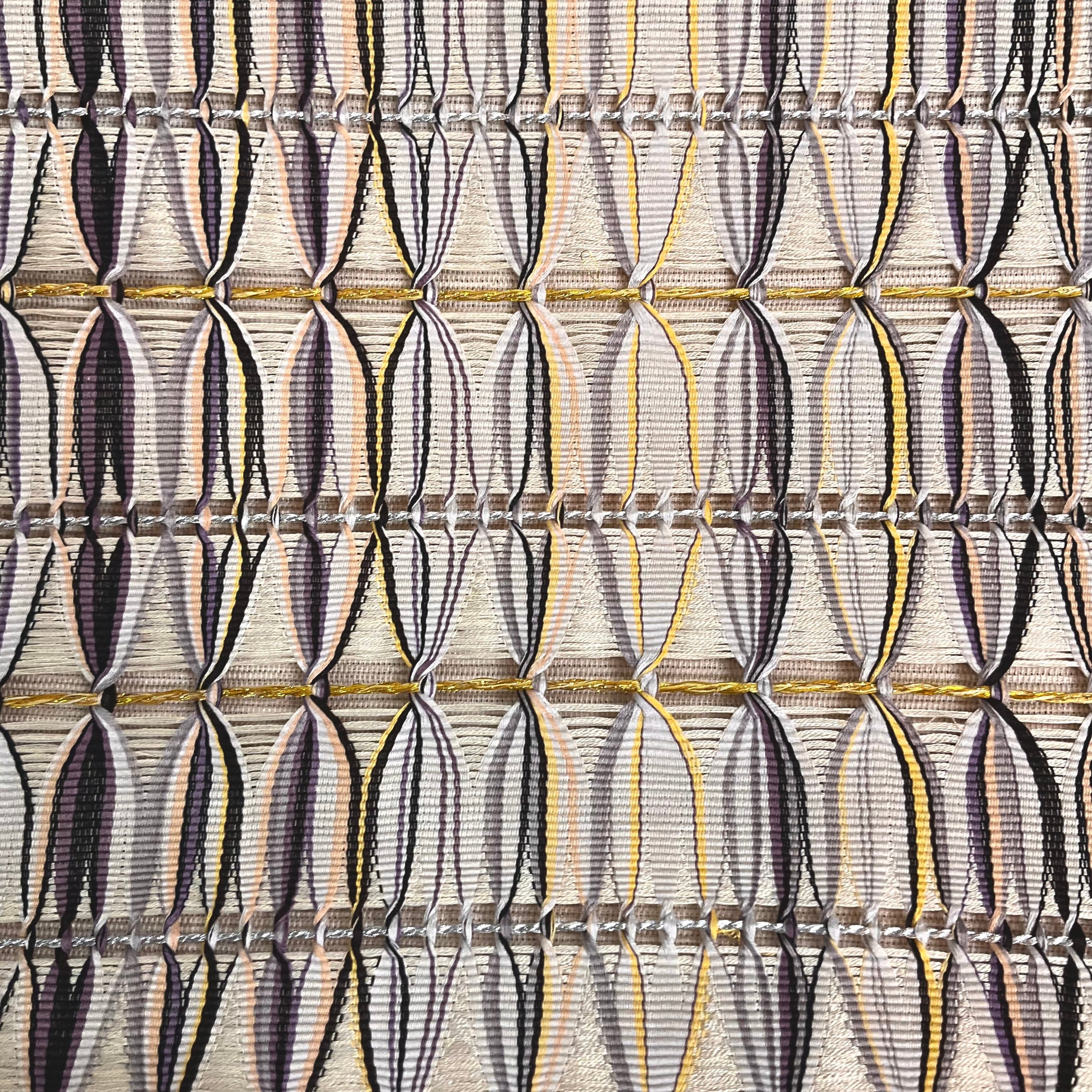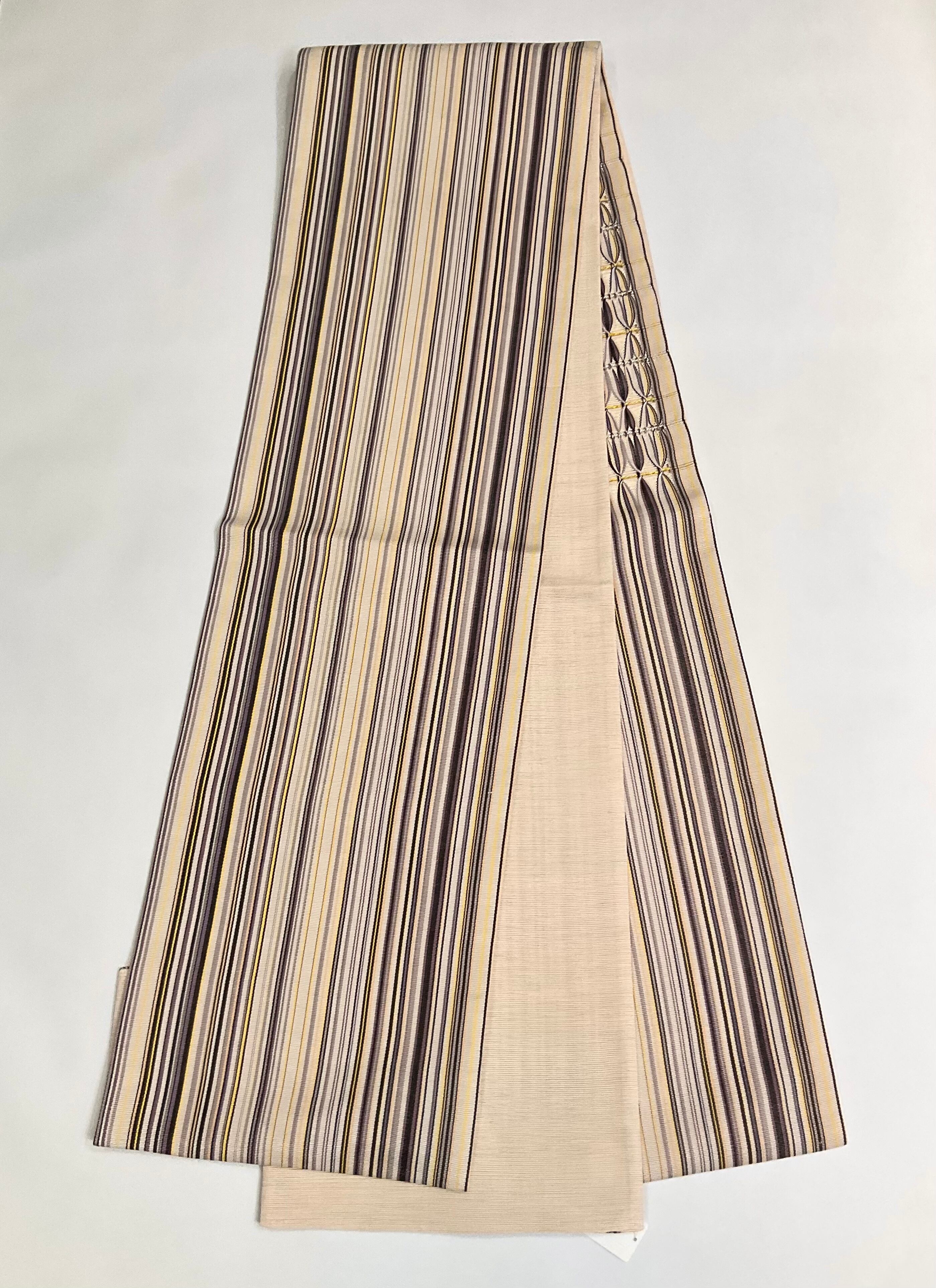 やさしい生成系の地色に、イエローやパープル系などが合わさった、マルチカラーのストライプ柄がモダンなこちらの洒落袋帯。