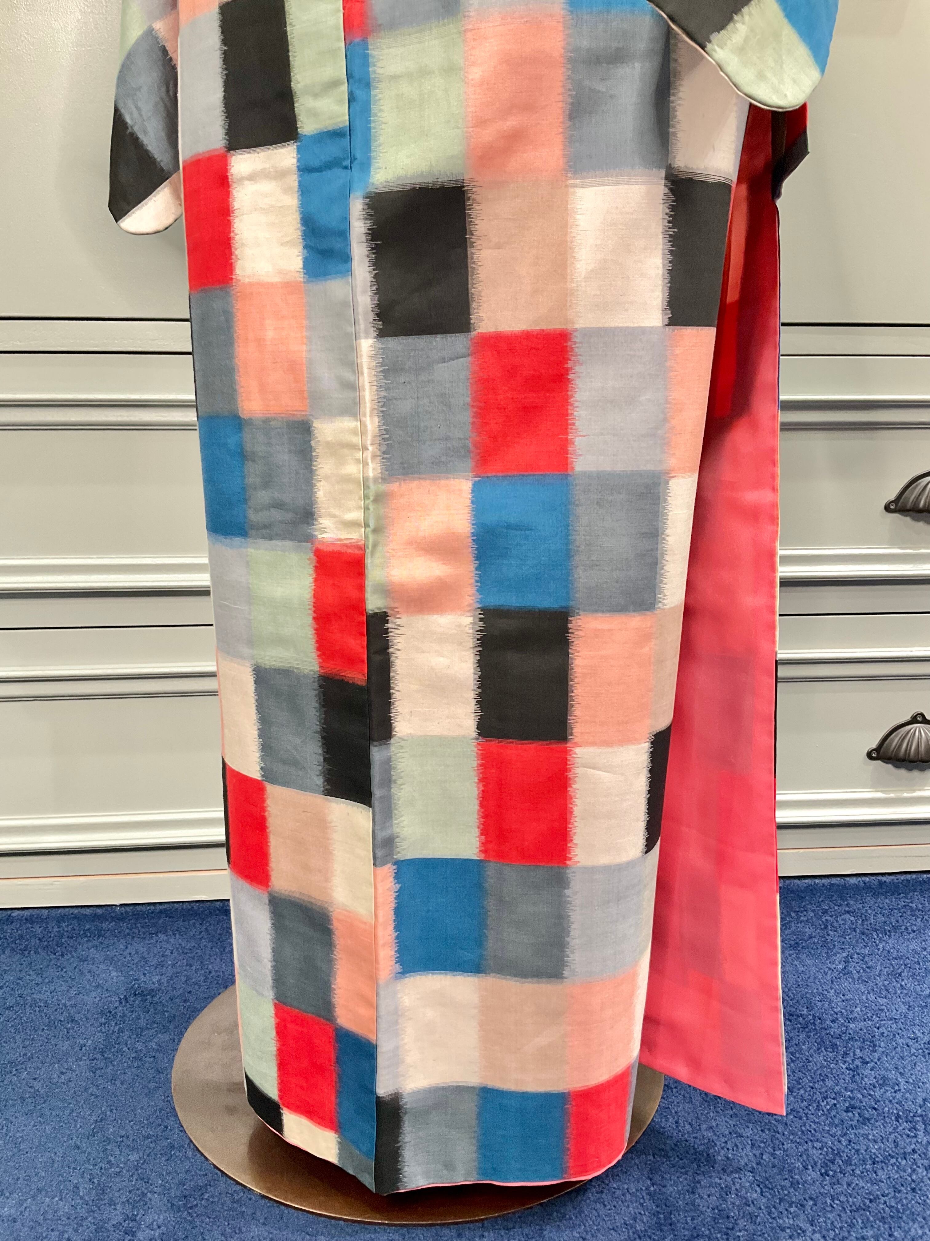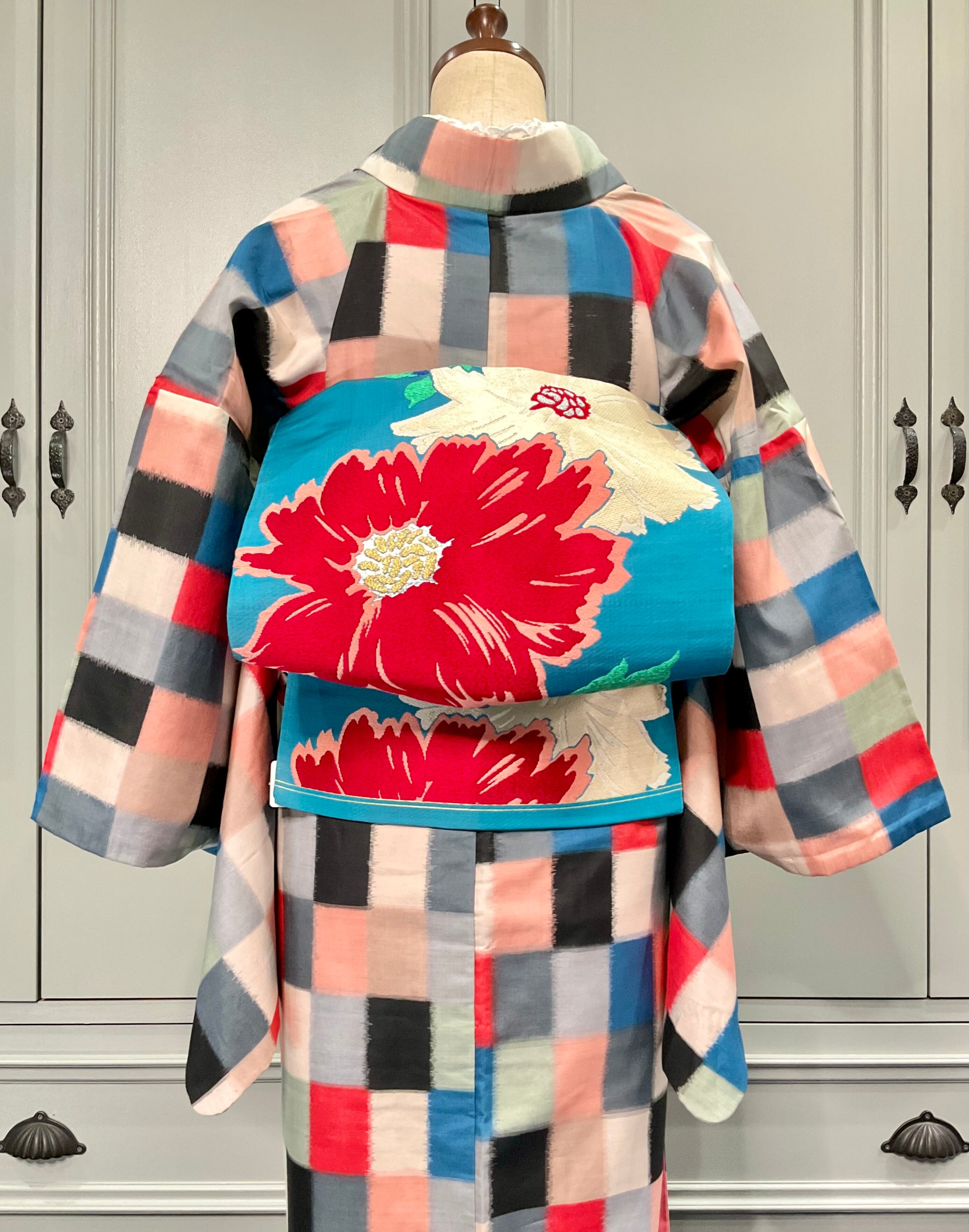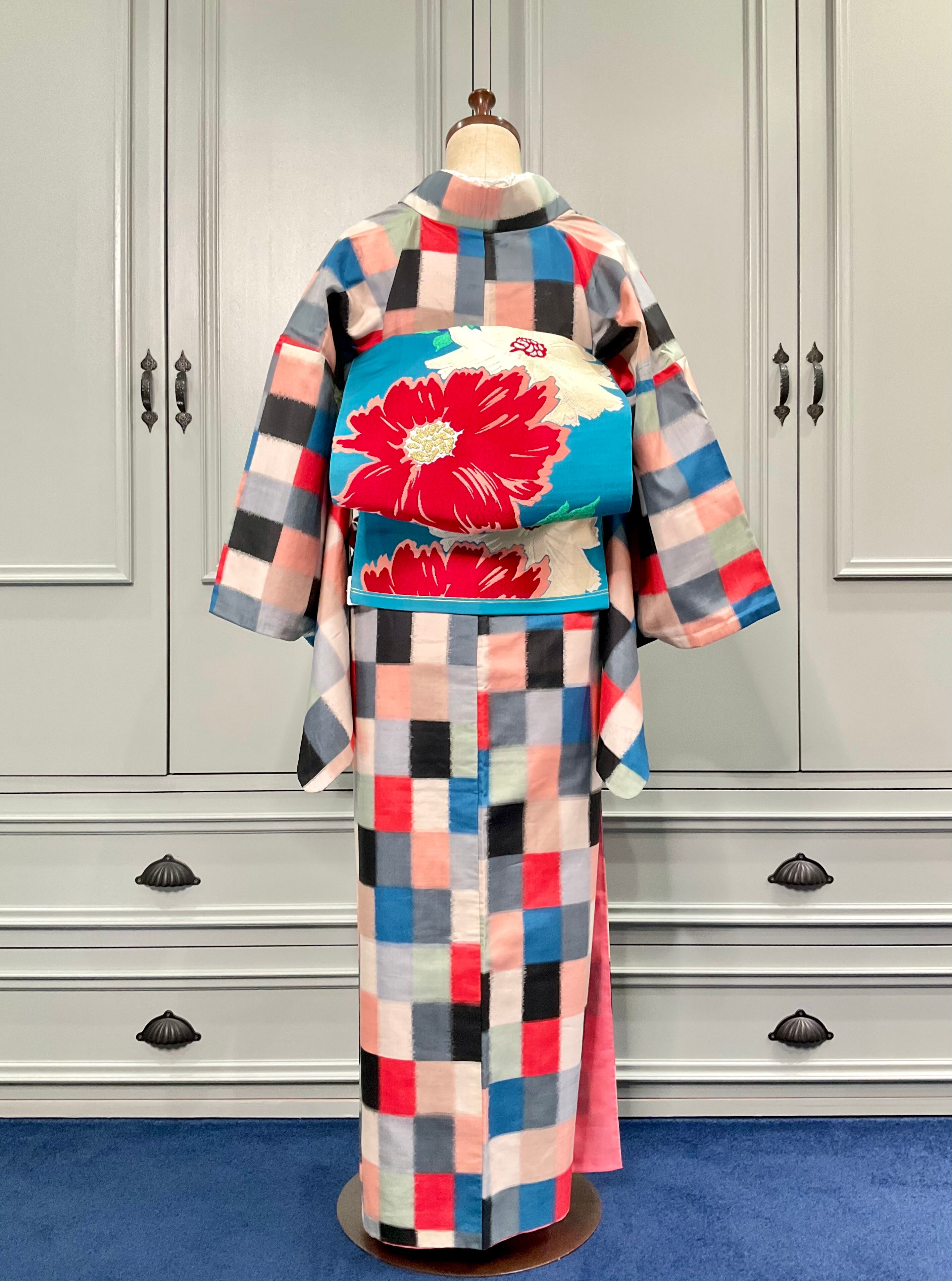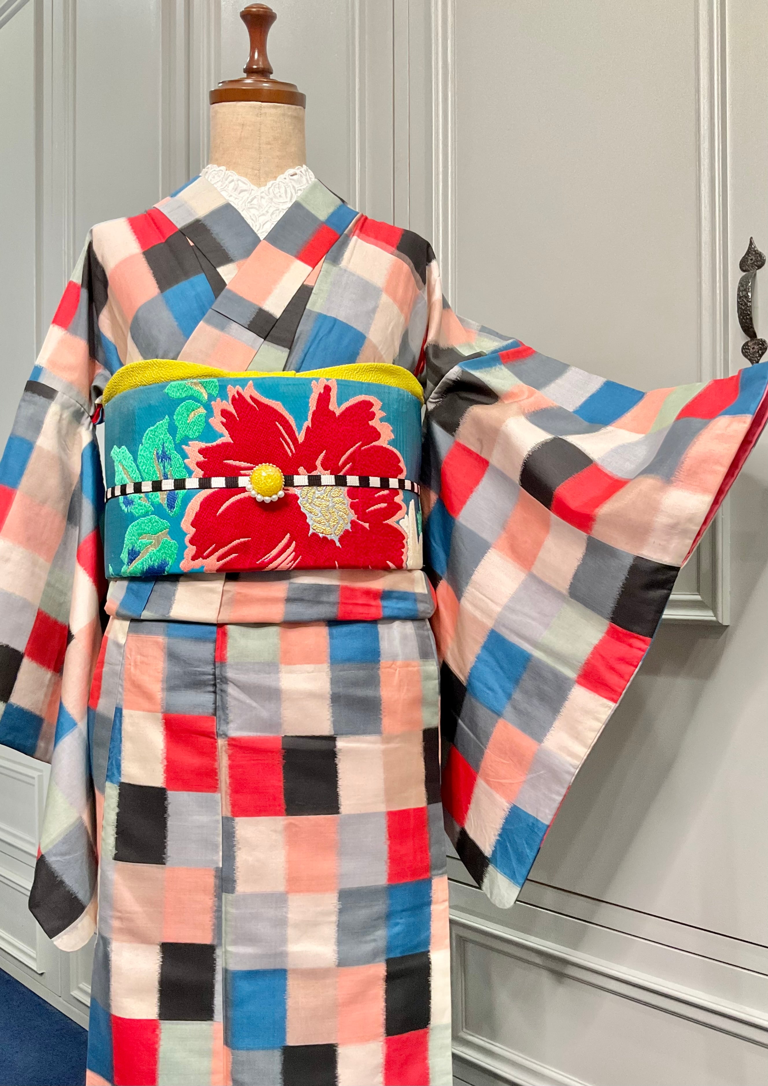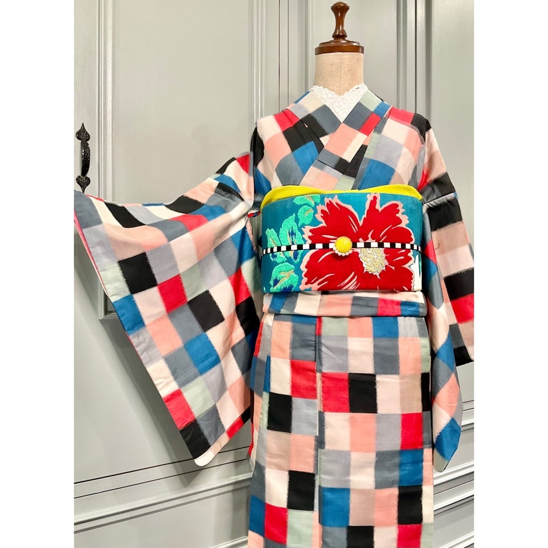 色とりどりのチェック柄がお洒落なアンティーク銘仙キモノです。