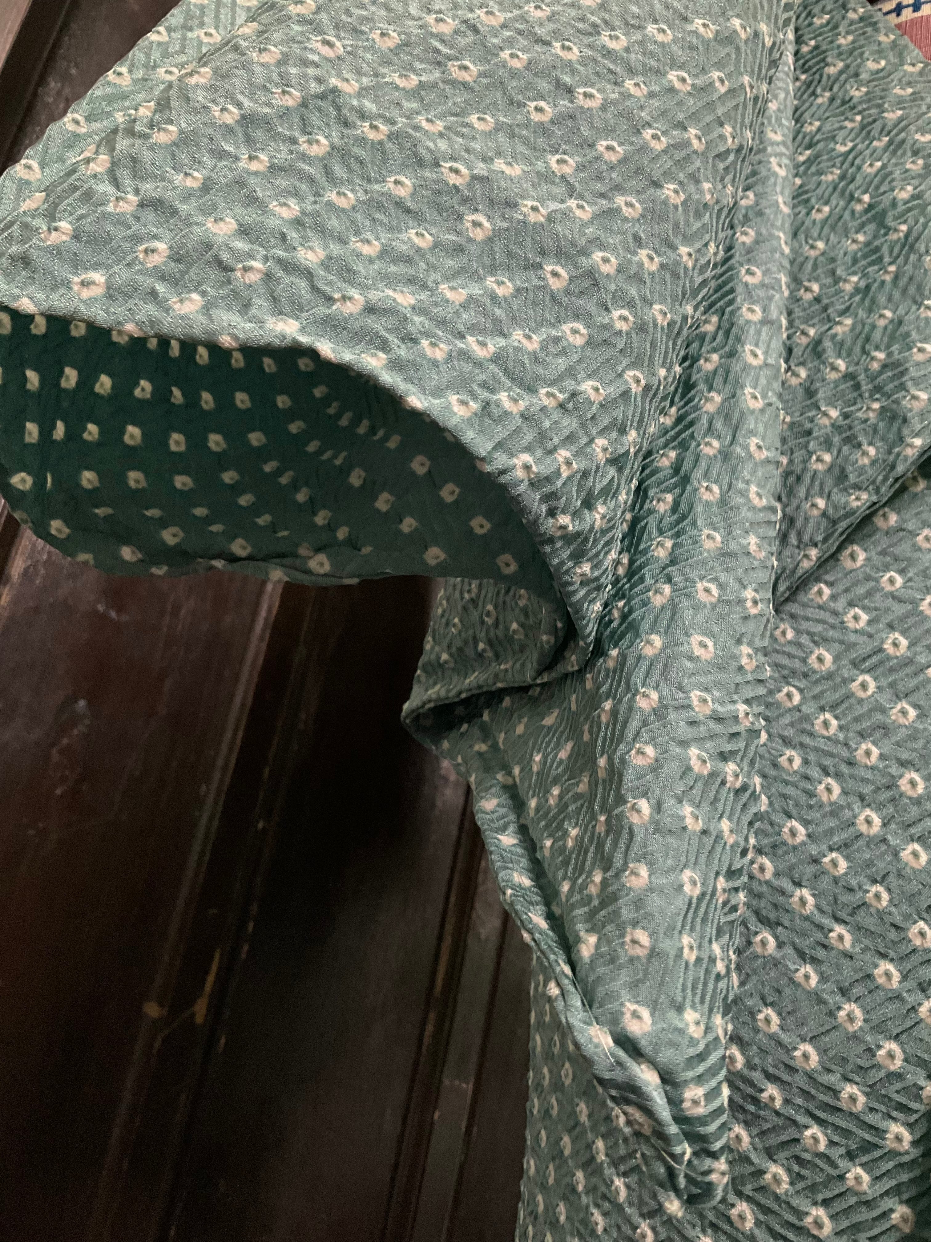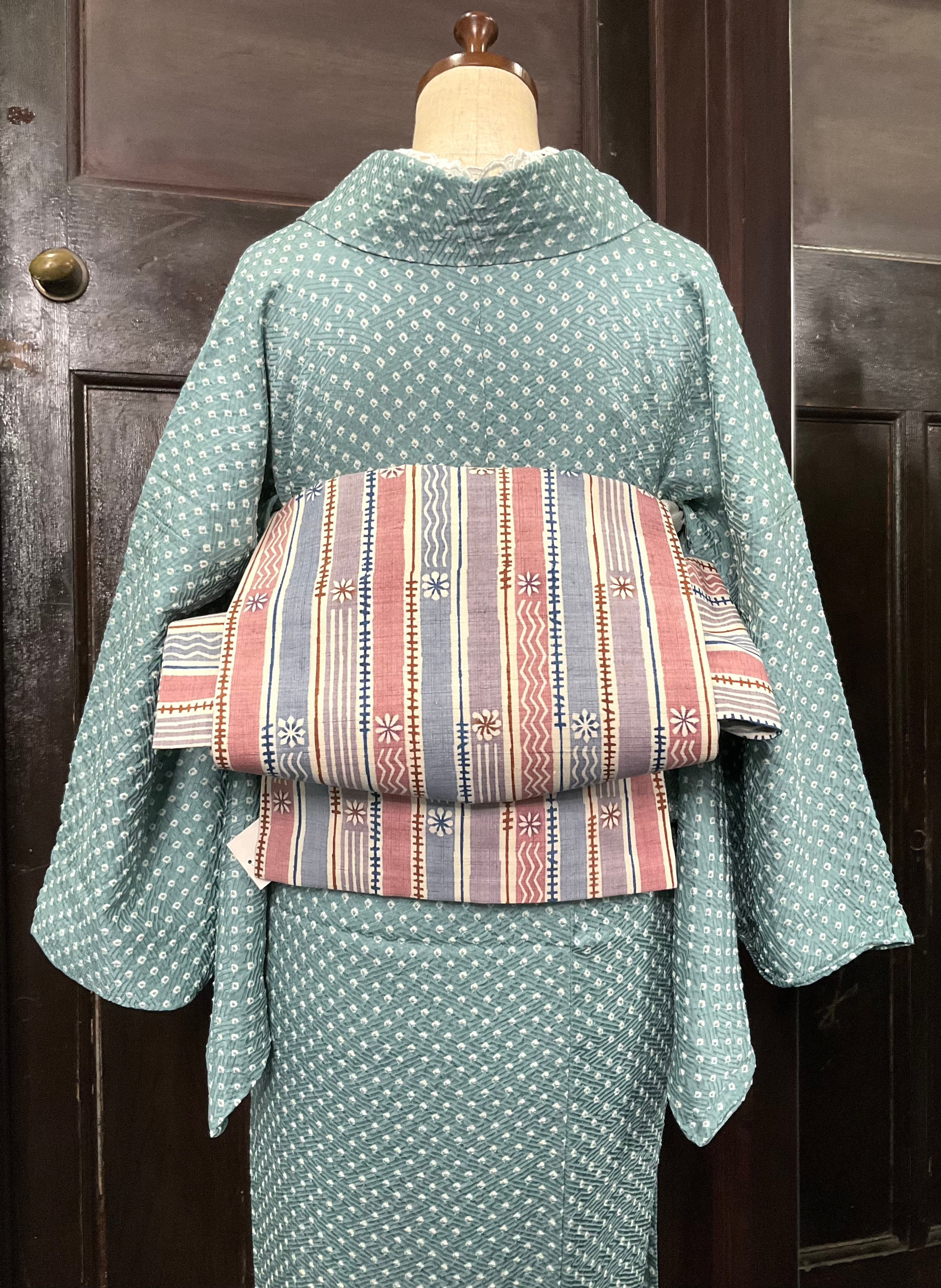 昔からある定番の絞り模様ですが、離れて見ると、ドット柄のデザインのようにも見え、少しモダンなデザインの帯と合わせたコーディネートも良さそうです^^
