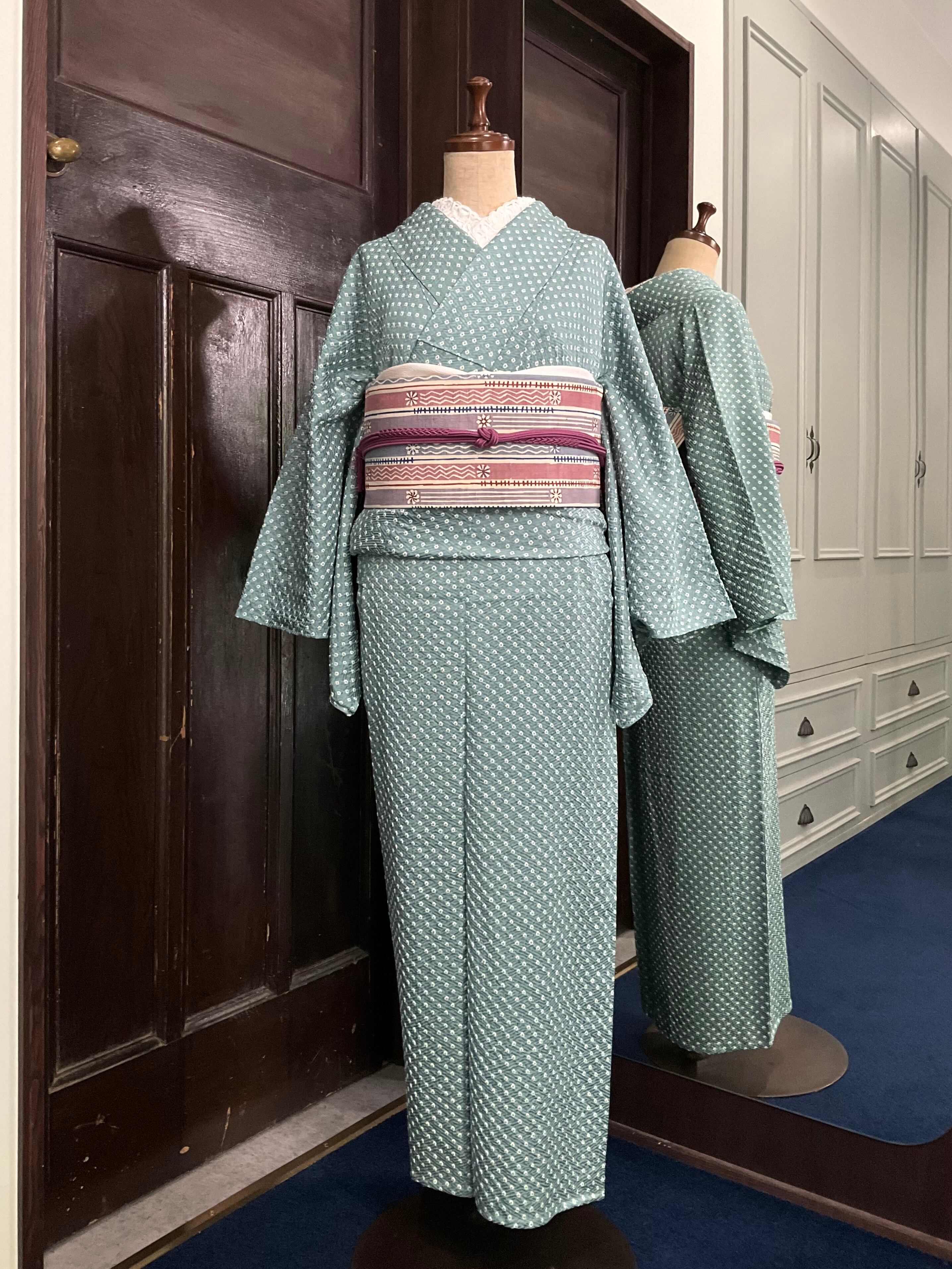 やわらかなブルー系の地色に、絞り模様がデザインされた、単衣の小紋着物です♪