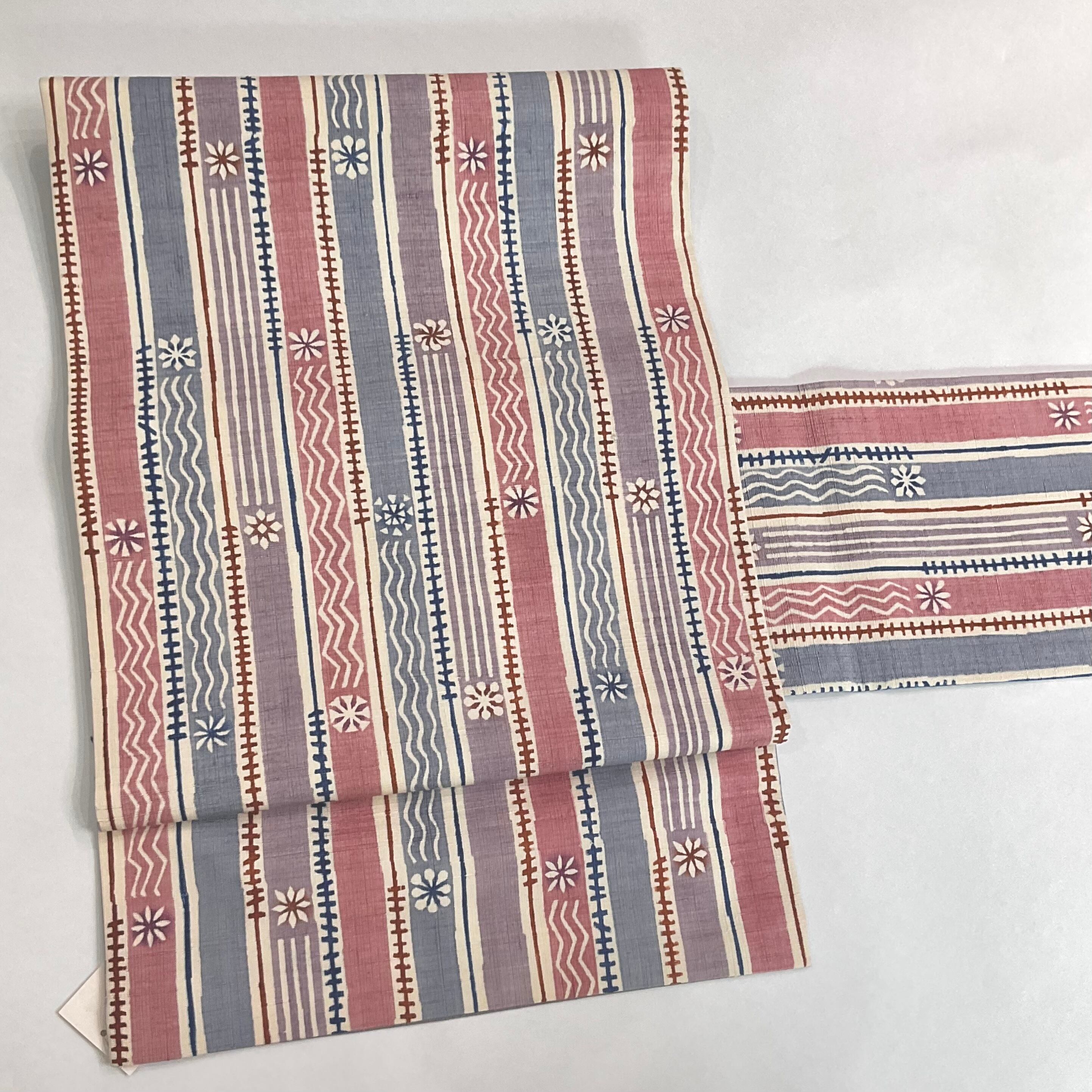 ピンク系×ブルー系×パープル系×ホワイト系のストライプ柄と花模様が合わさったデザインの名古屋帯です♪