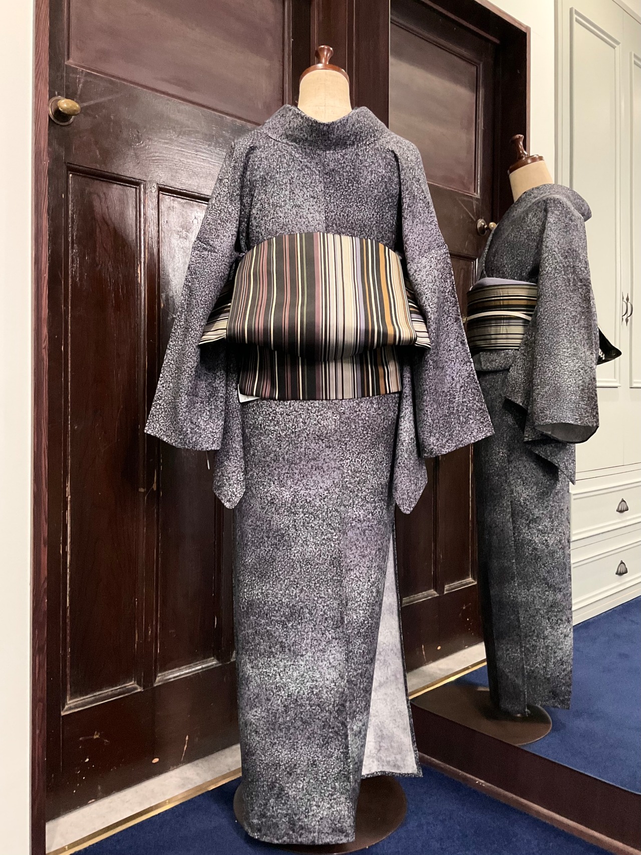 写真では少しわかりにくいのですが、地色にはグレー系のお色の中に、実はパープル系のお色も、所々にふわっと感じられるお色味になっており、単色では無いお色使いがとても素敵なお着物になっております^^
