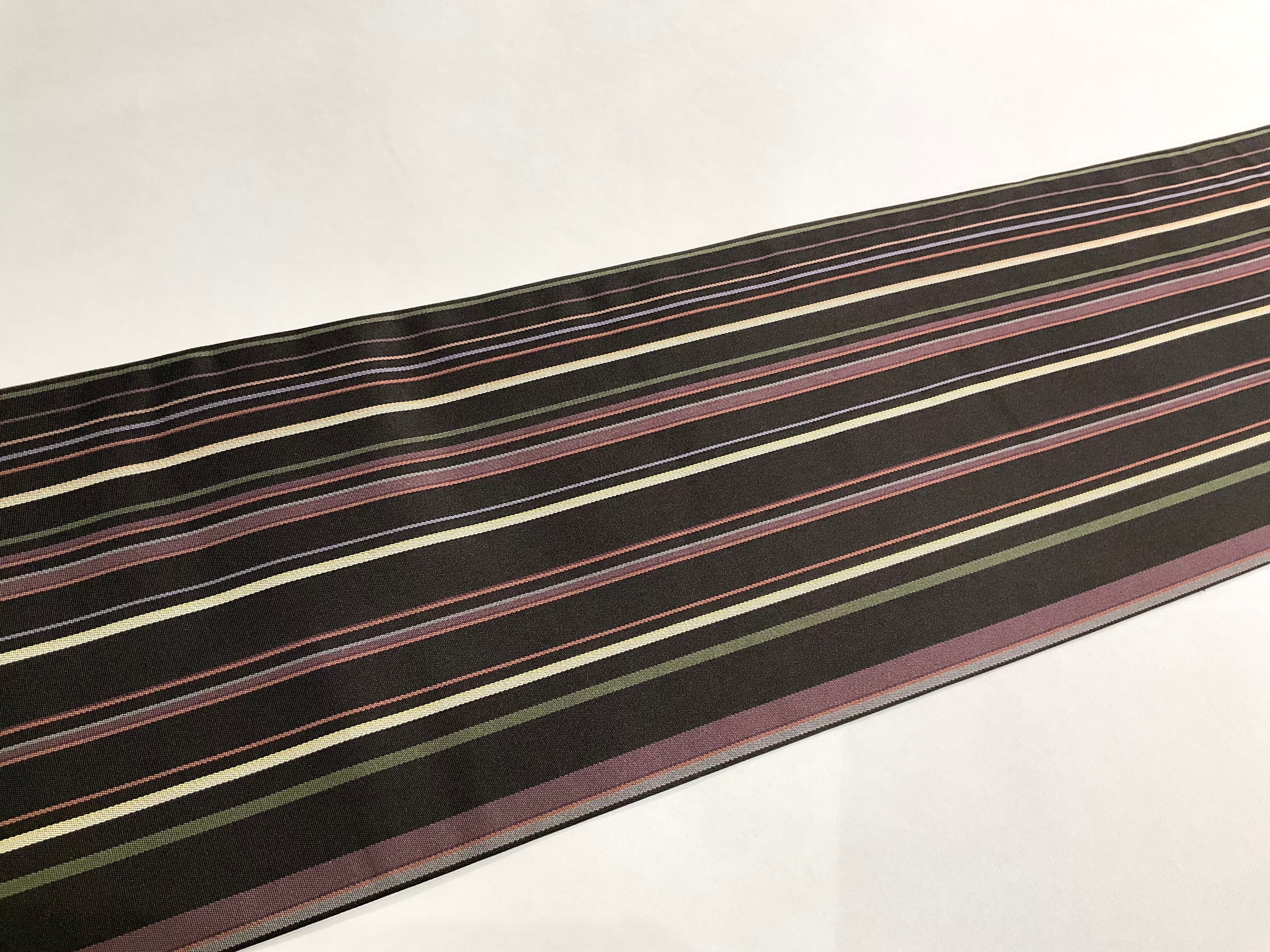 ブラックを中心に、複数のくすみカラーと組み合わせてデザインされた、マルチストライプ柄がオシャレなこちらの名古屋帯。
