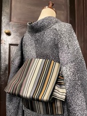 またこちらのデザイン、お太鼓部分を見ていただくとわかりやすいのですが、ストライプ柄にはたくさんのお色が使われている為、右回し・左回しと締める方向によって、胴回り部分に出るお色がかわるんです!