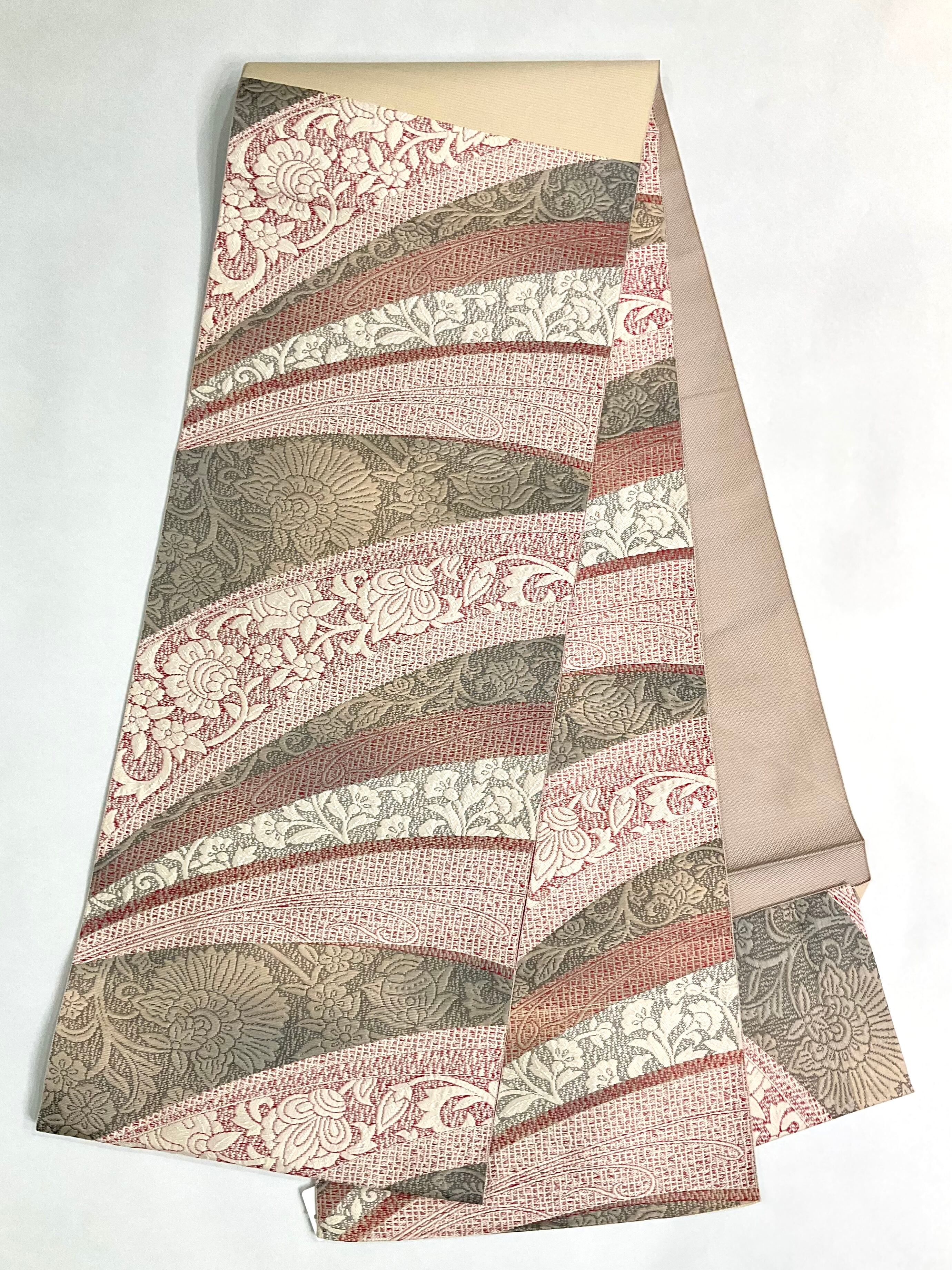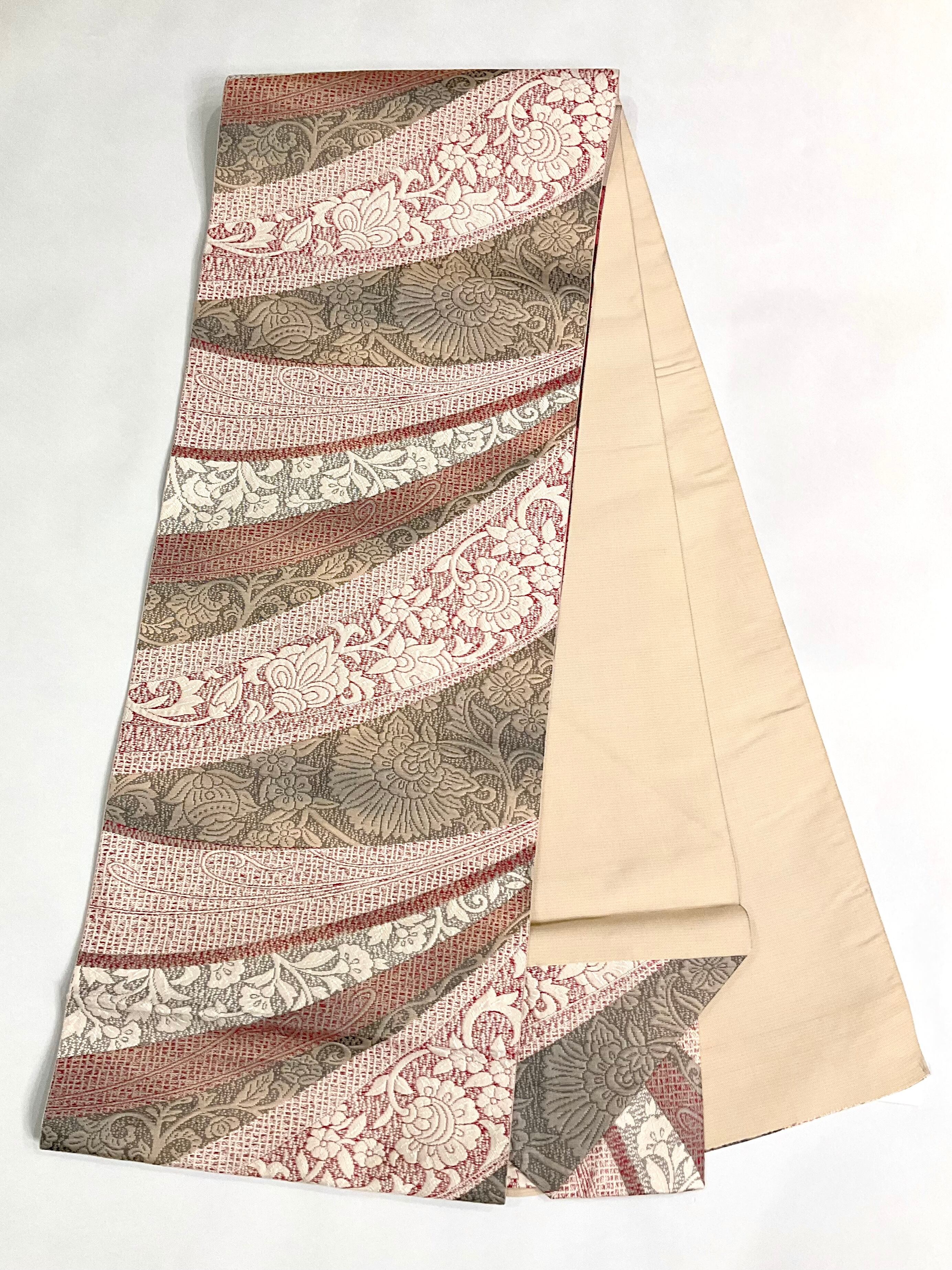レッド系×ブラウン系×ホワイト系の配色と花模様が素敵な博多織の名古屋帯(松葉仕立て)です♪