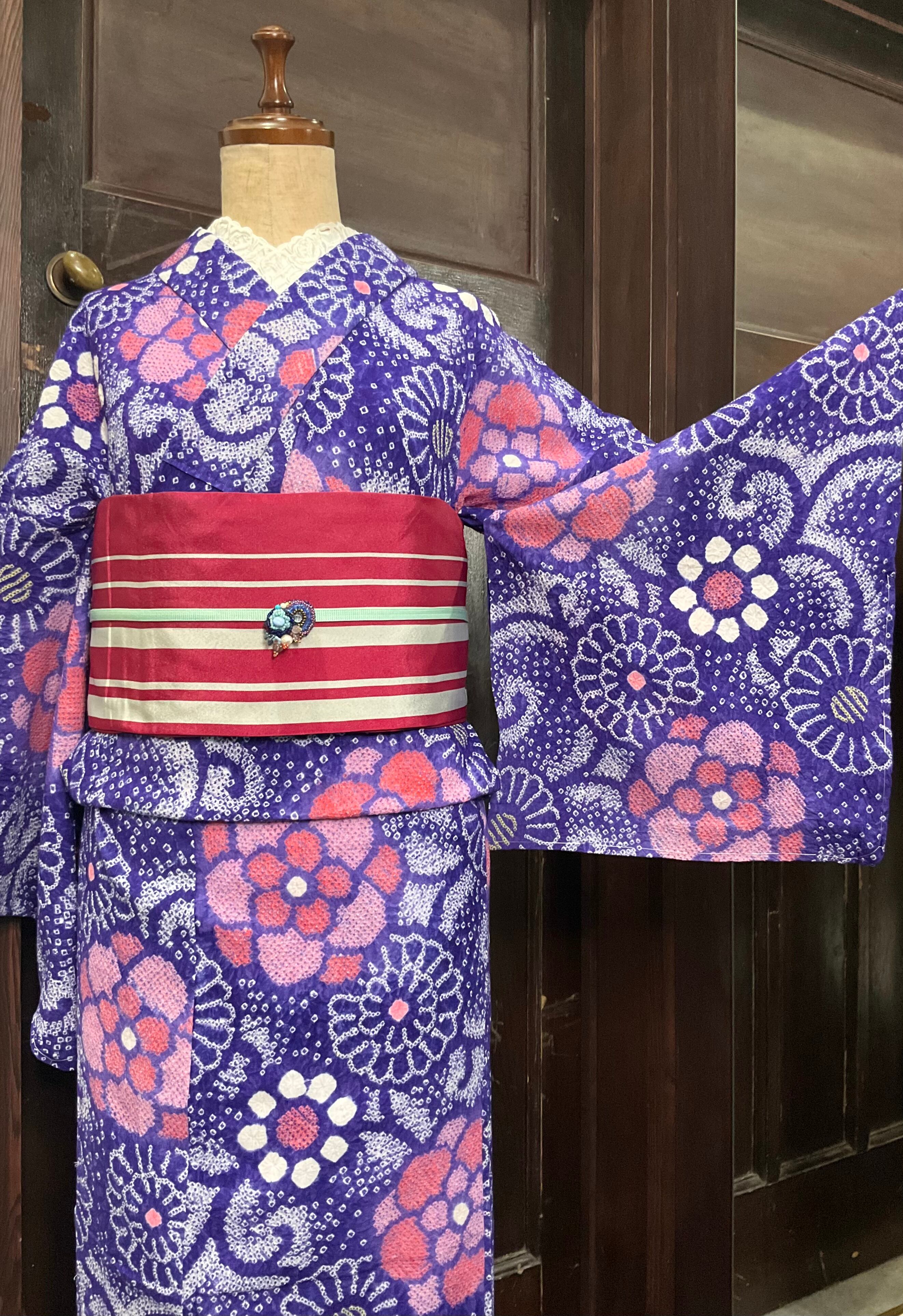 パープル系の地色に、花模様がデザインされた、有松鳴海絞り浴衣です♪