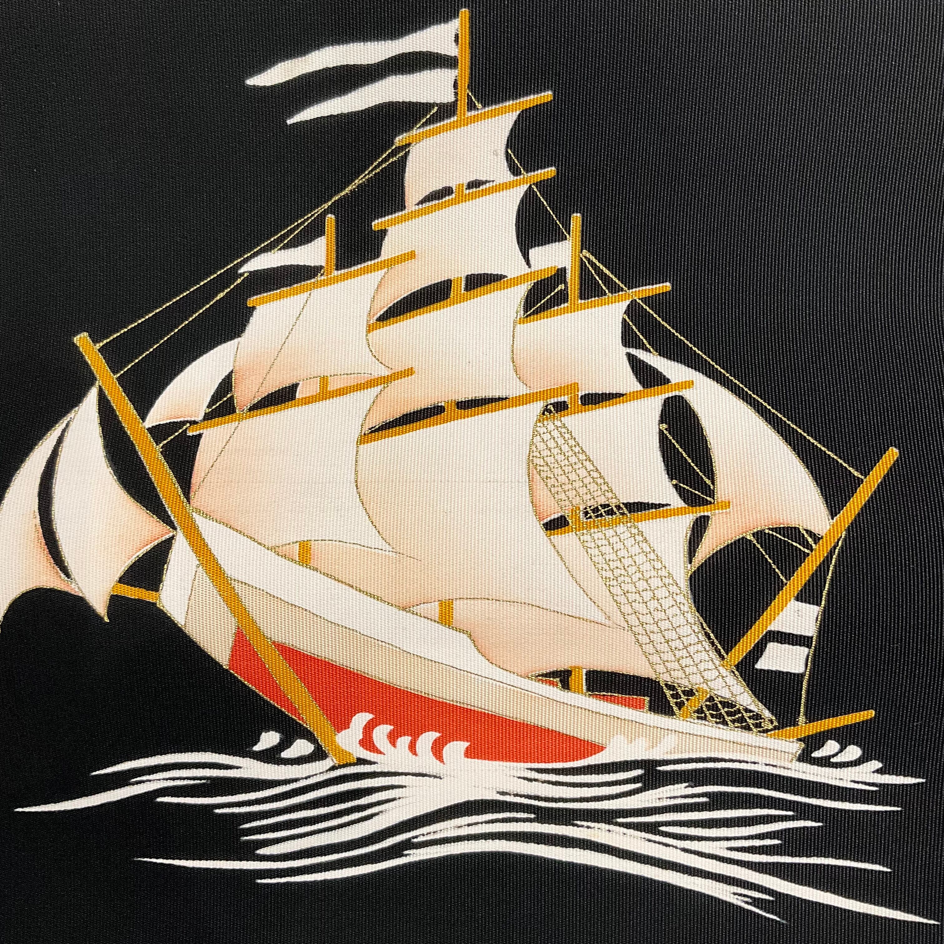 ブラックの地色に、帆船がデザインされた、名古屋帯です♪