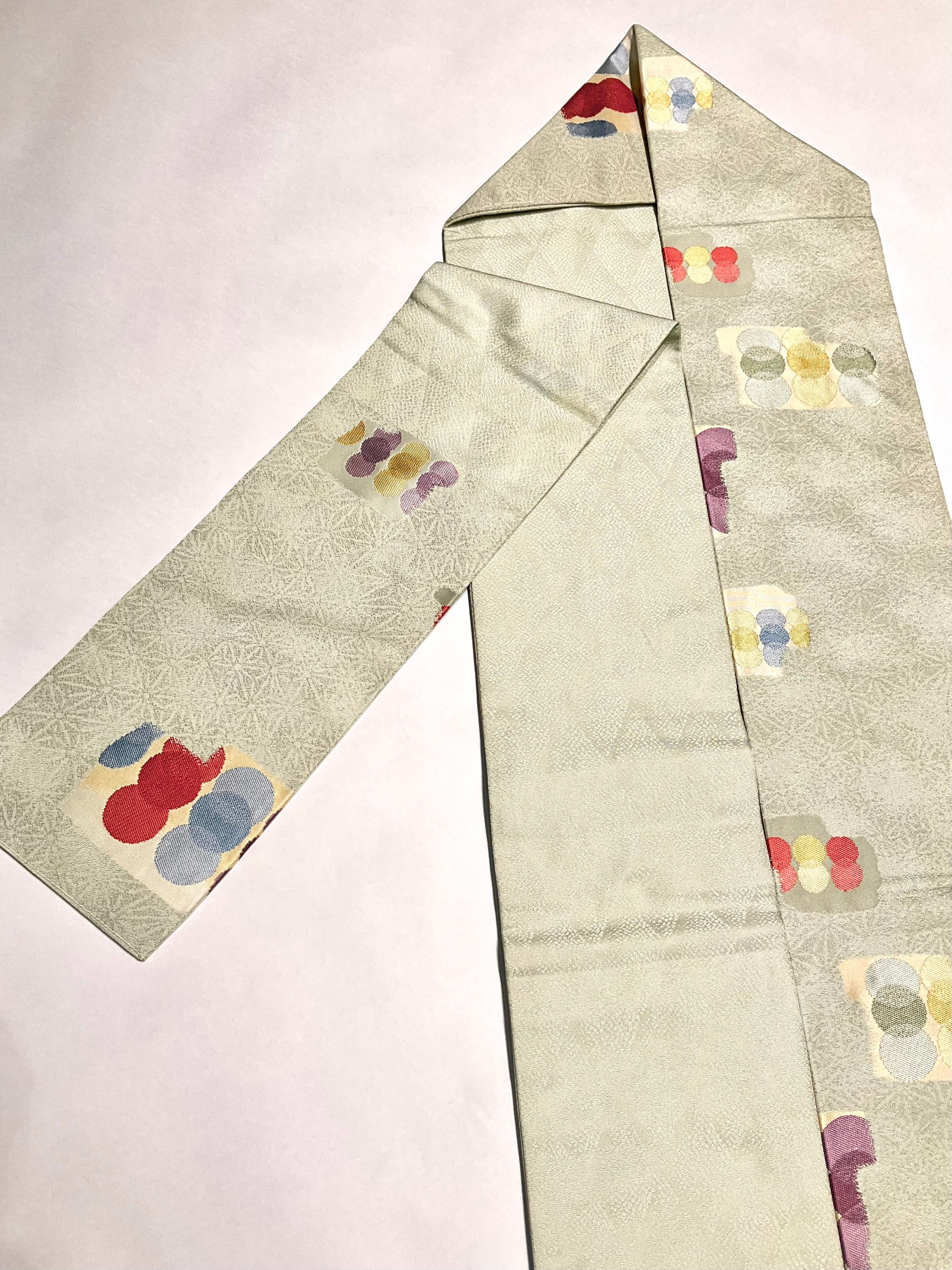 淡いグリーン系の地色に、カラフルなお色のサークル模様がデザインされた、名古屋帯です♪