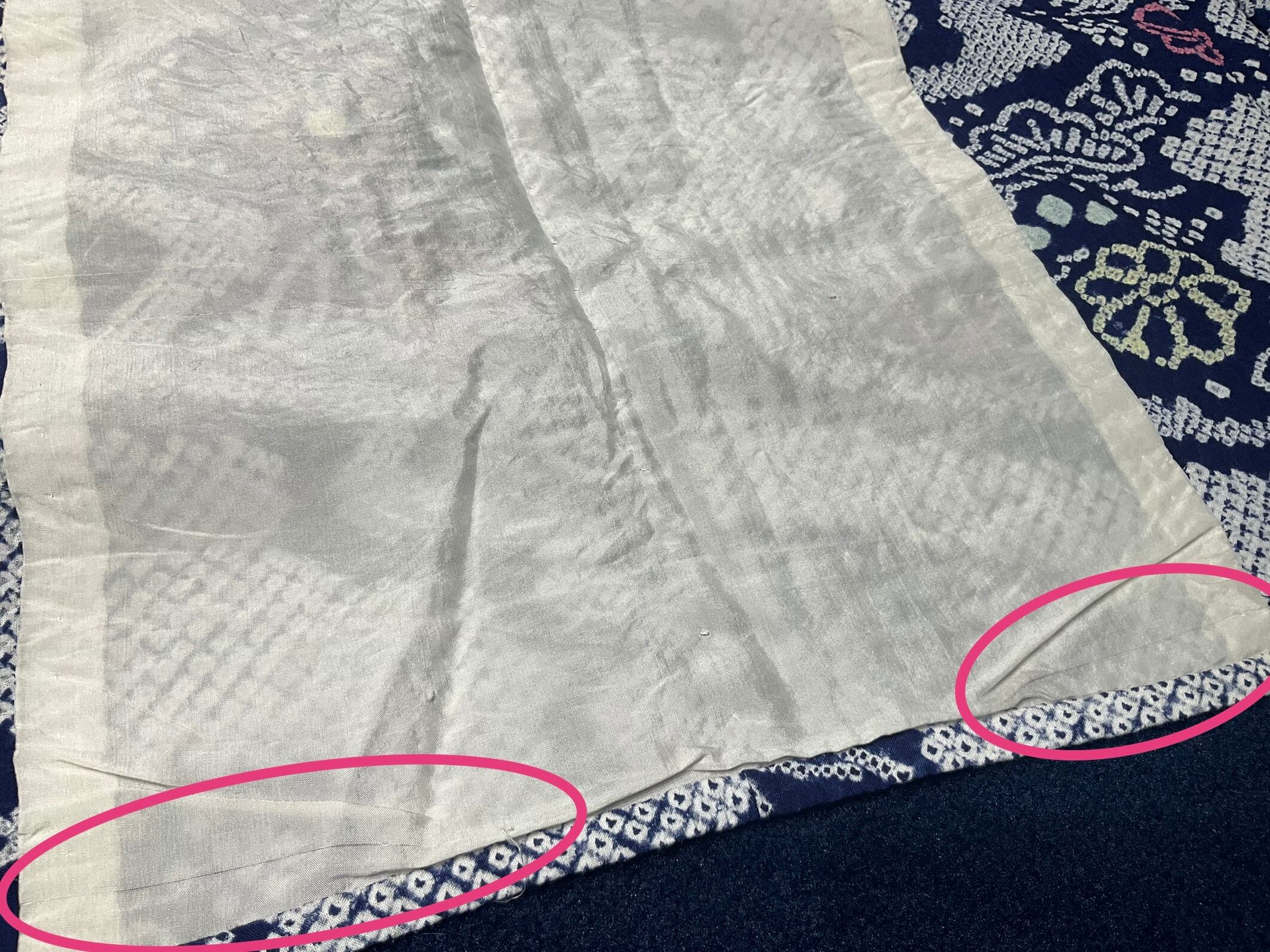 居敷当て(裾のあたり)に、糸引き有り。