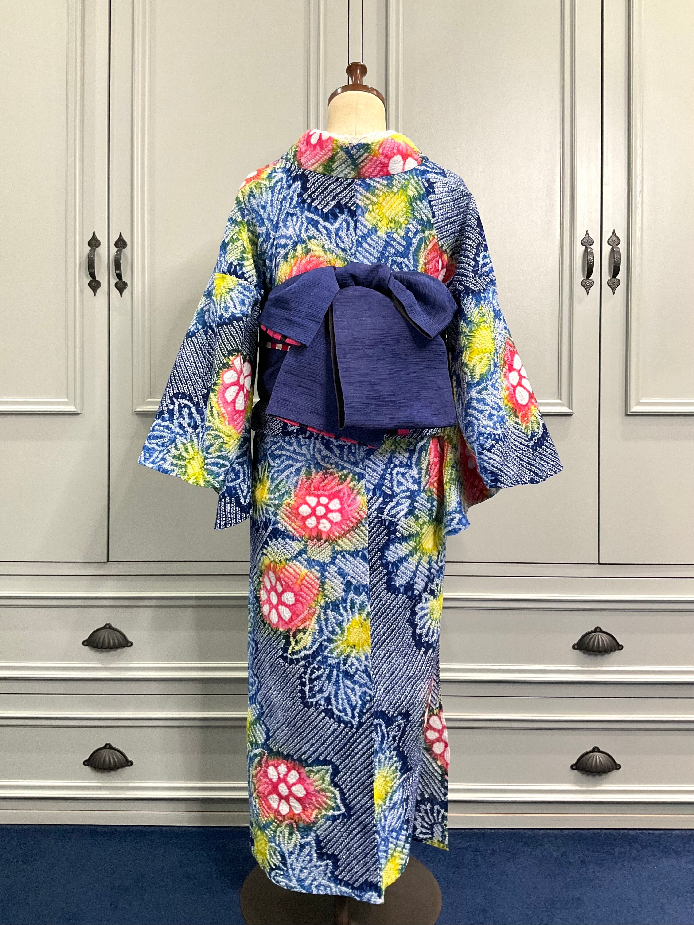 濃いブルー系の地色に、花模様がデザインされた、有松鳴海絞り浴衣です♪
