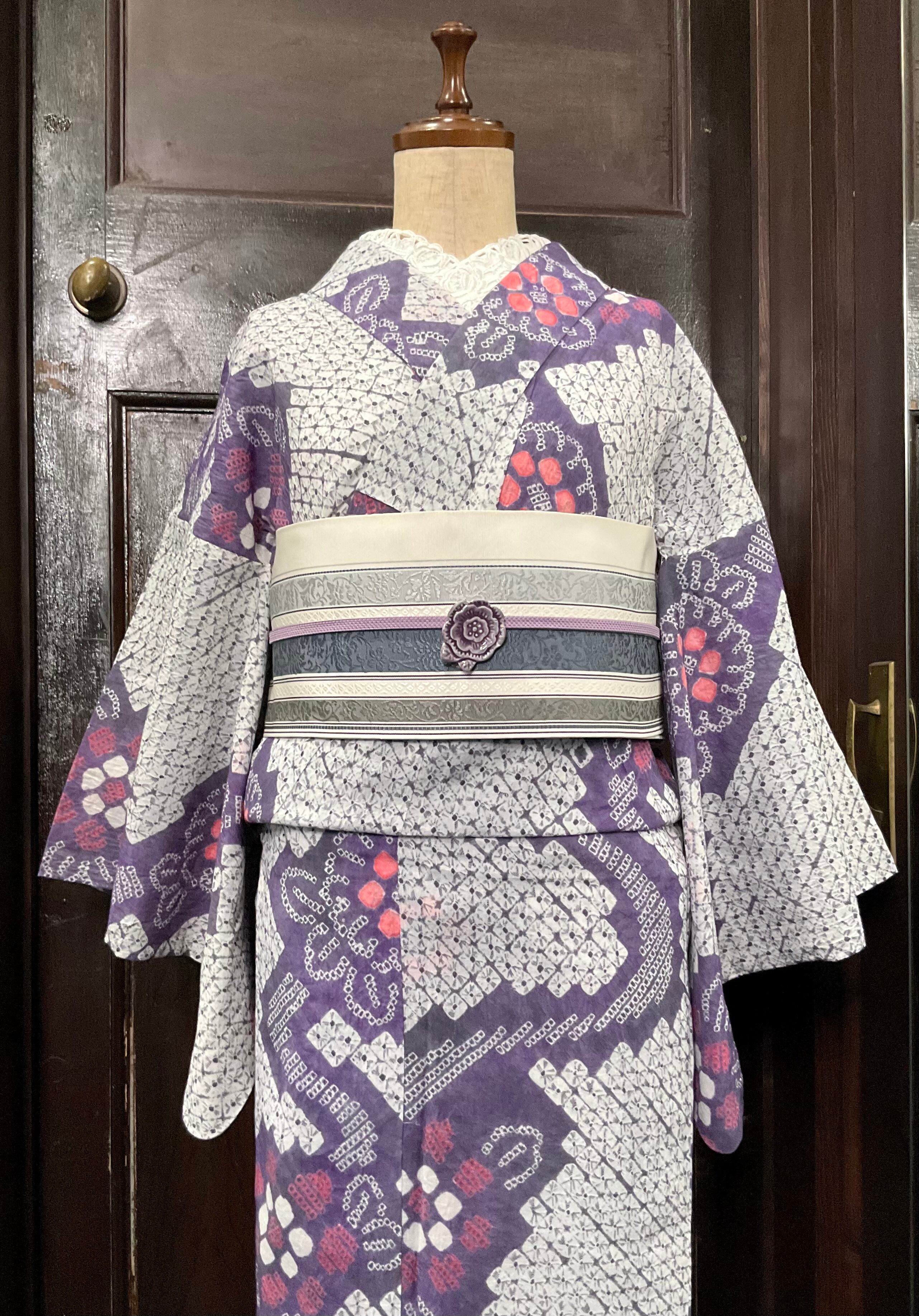 パープル系×ホワイトの地色に、花模様がデザインされた、有松鳴海絞り浴衣です♪