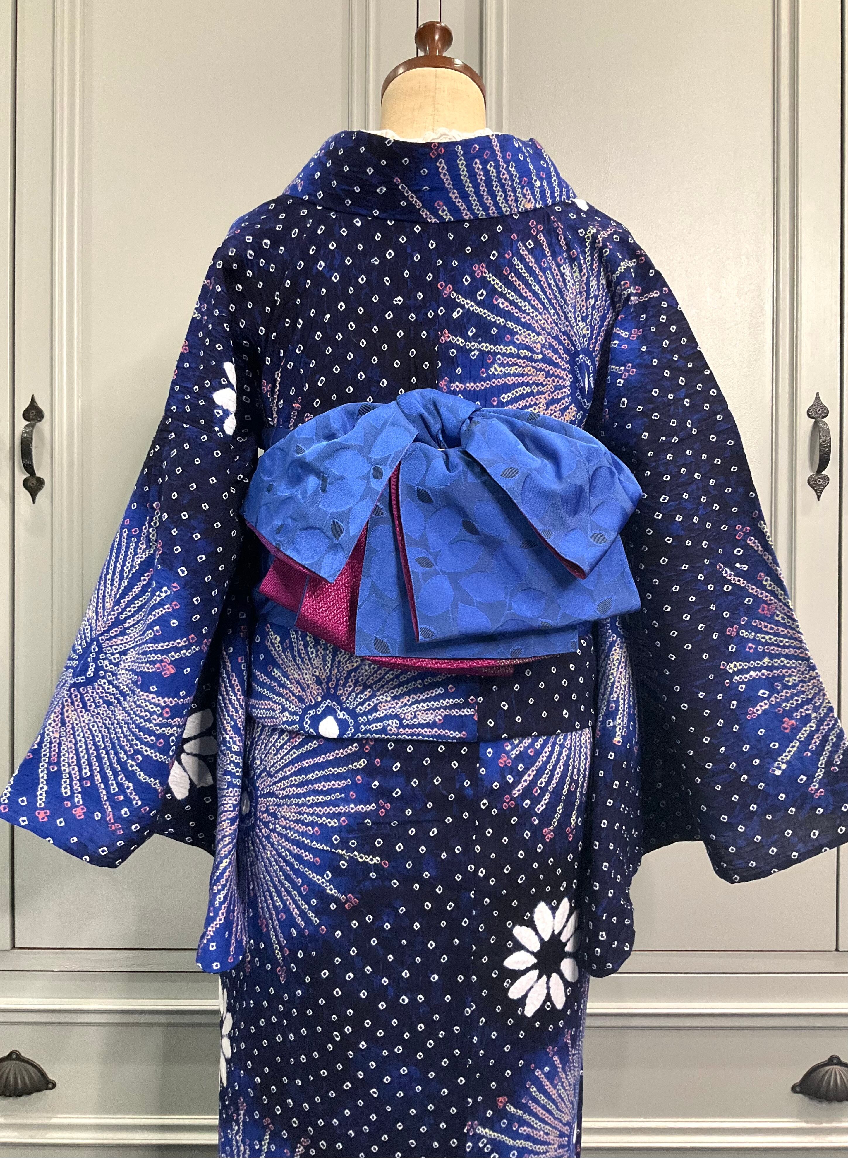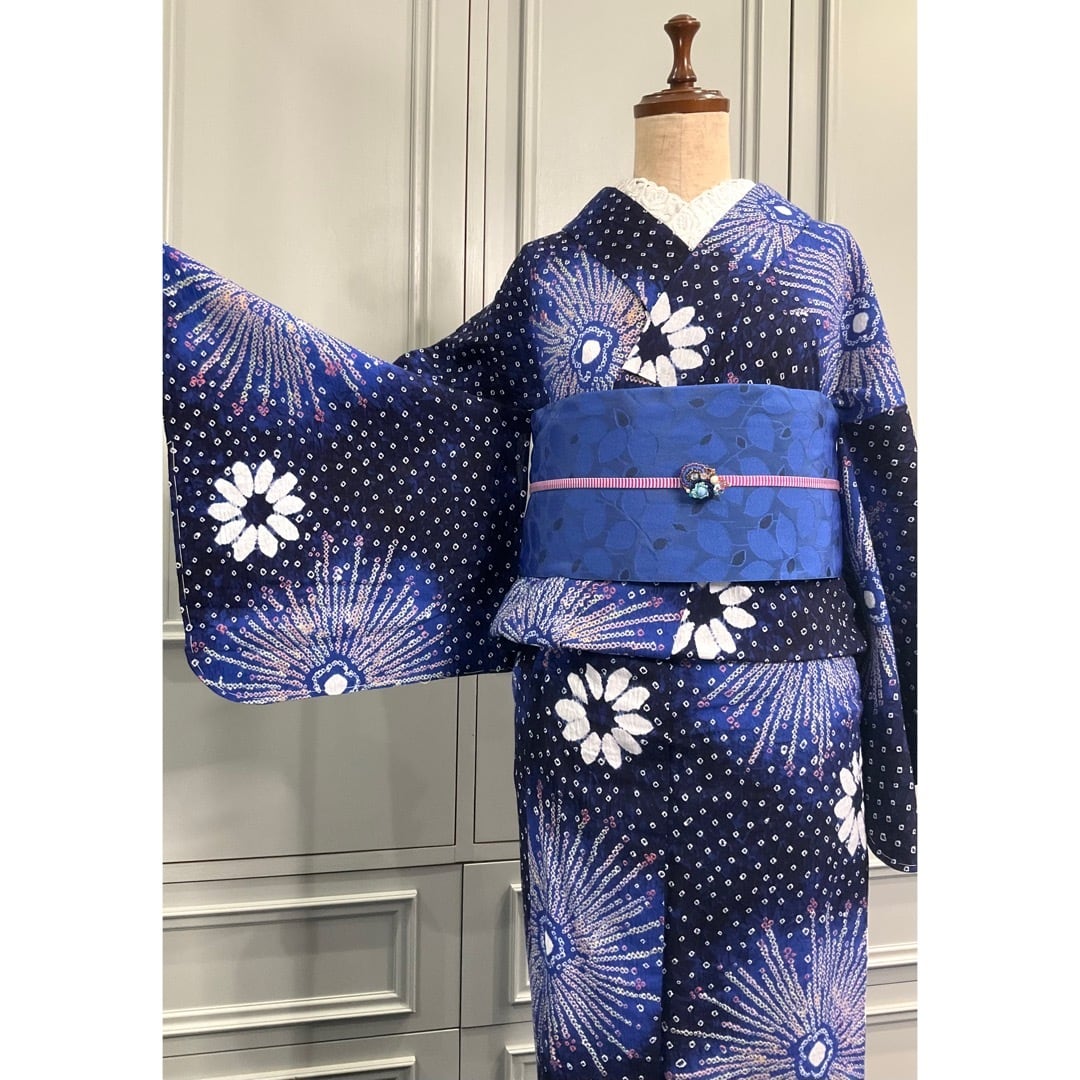 濃いめのブルー系の地色に、花火のようなデザインが素敵な有松鳴海絞り浴衣です♪